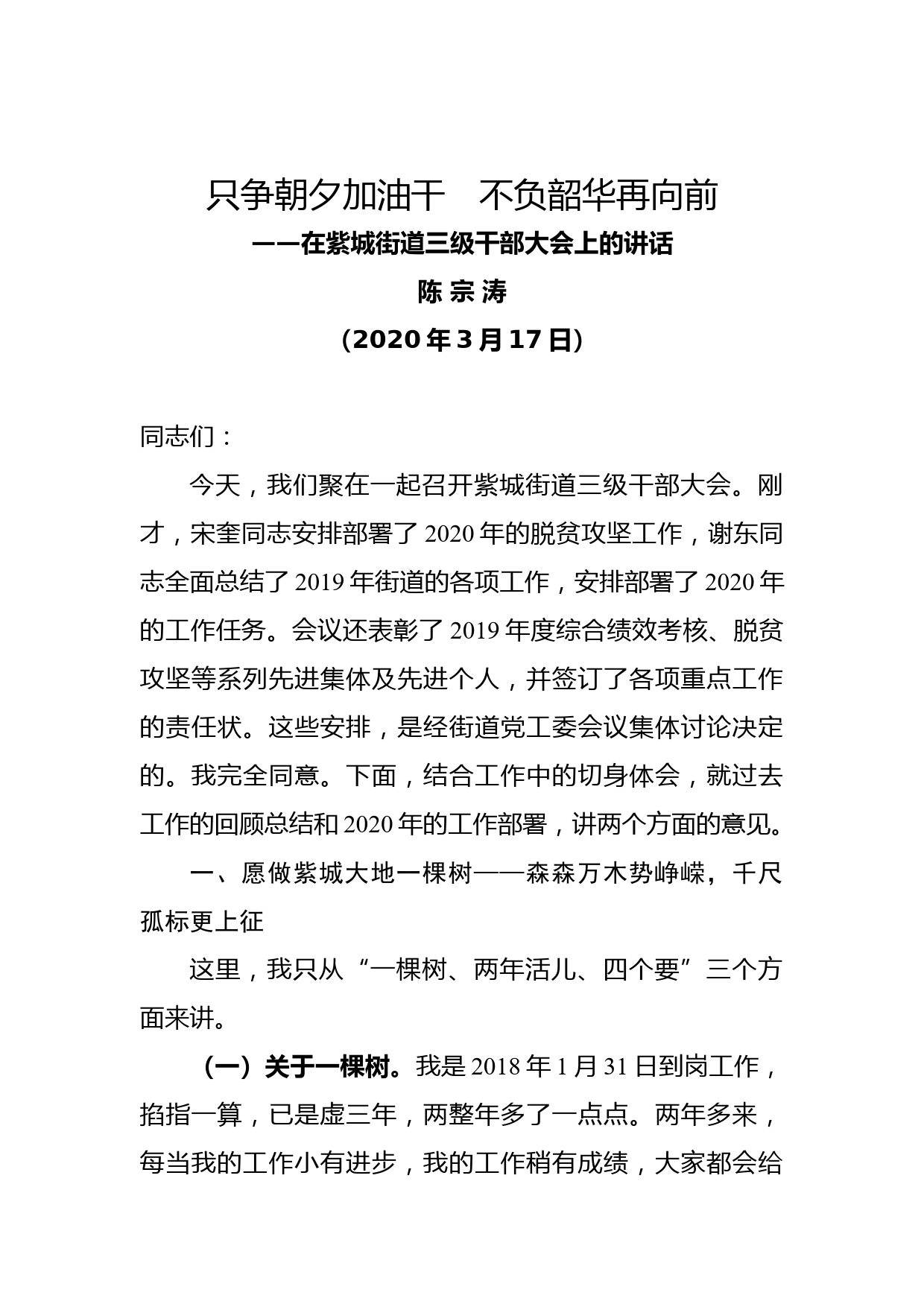 只爭朝夕加油干不負韶華再向前——在紫城街道三級干部大會上的講話陳宗濤(2020年3月17日)同志們:今天,我們聚在一起召開紫城街道三級干部大會。剛才,宋奎同志安排部署了2020年的脫貧攻堅工作,謝東同志全面總結了2019年街道的各項工作,安排部署了2020年的工作任務。會議還表彰了2019年度綜合績效考核、脫貧攻堅等系列先進集體及先進個人,并簽訂了各項重點工作的責任狀。這些安排,是經街道黨工委會議集體討論決定的。我完全同意。下面,結合工作中的切身體會,就過去工作的回顧總結和2020年的工作部署,講兩個方面的意見。一、愿做紫城大地一棵樹——森森萬木勢崢...