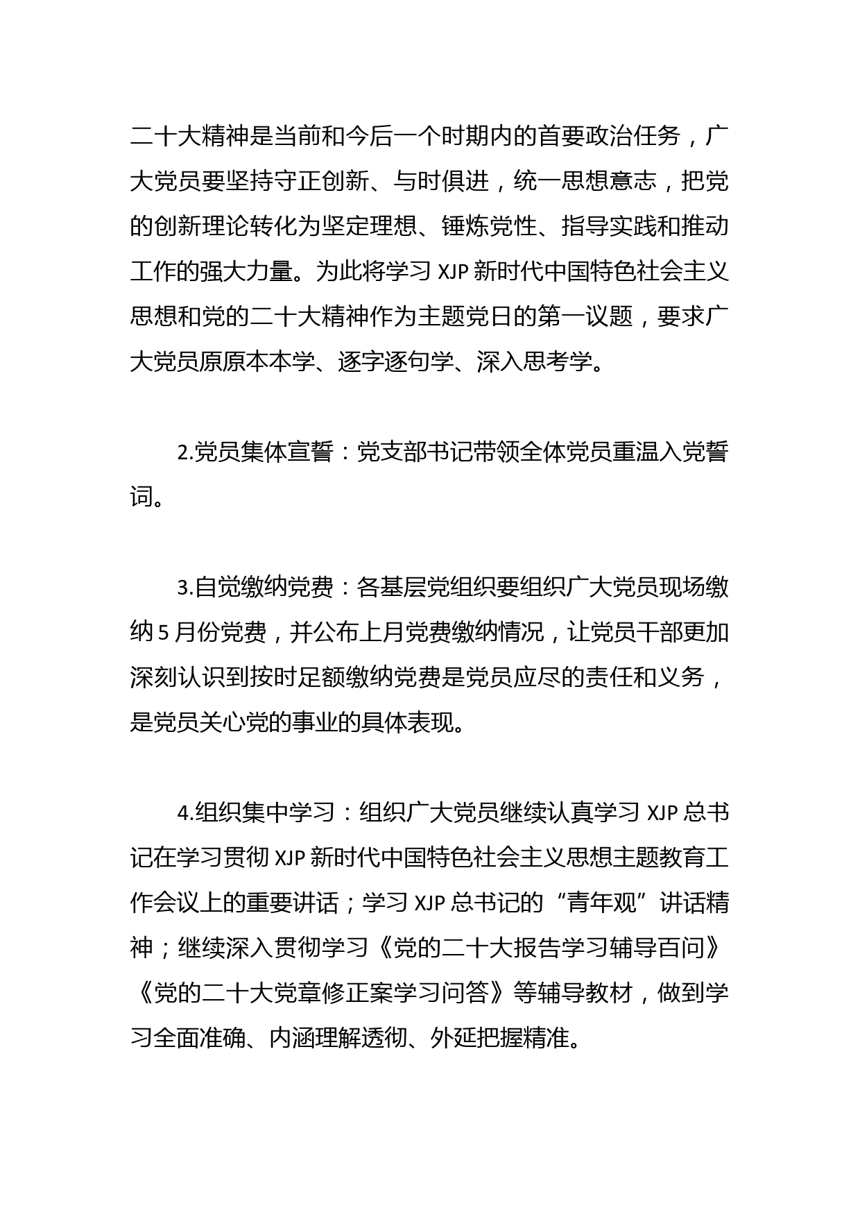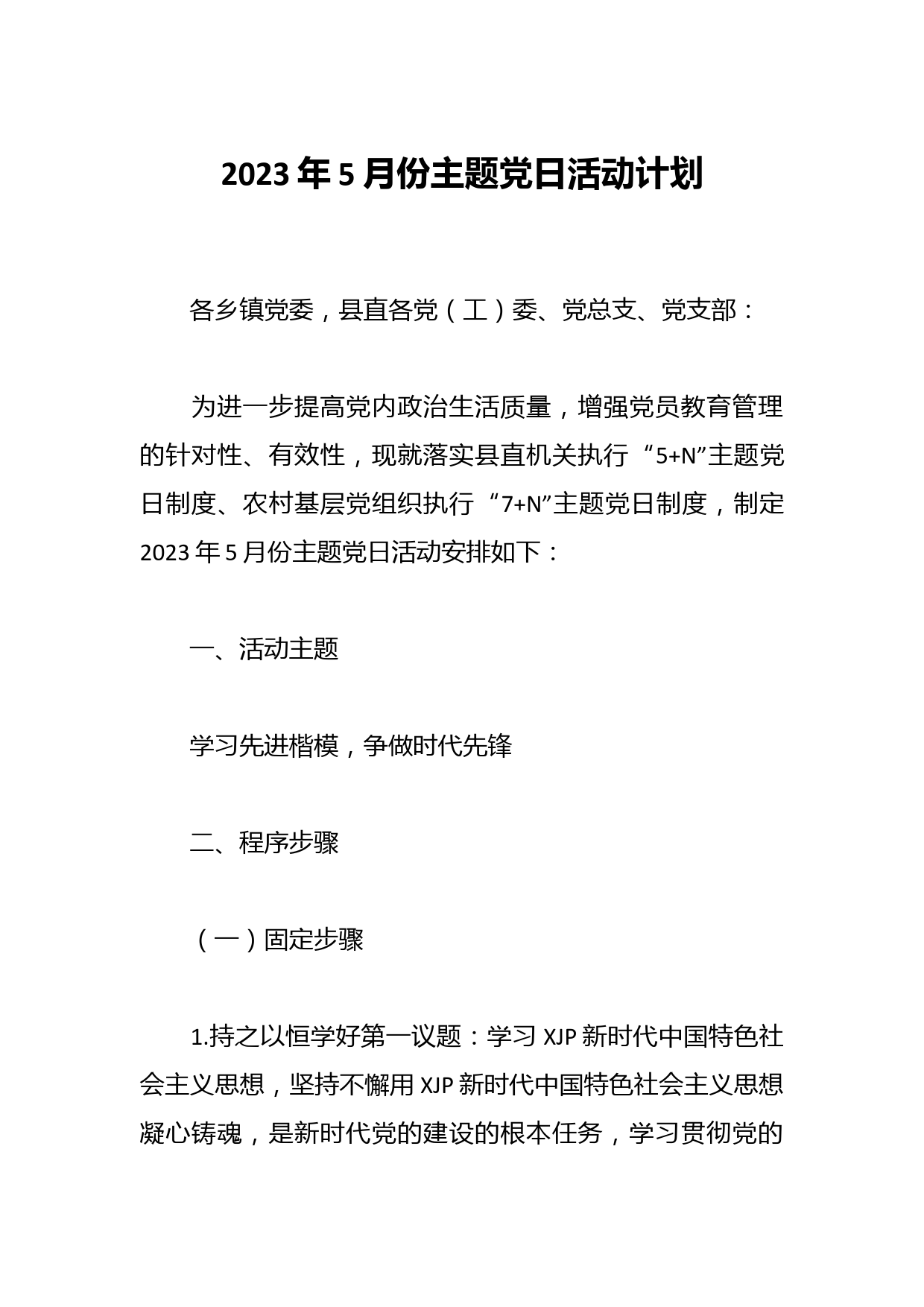 2023年5月份主題黨日活動計劃各鄉(xiāng)鎮(zhèn)黨委,縣直各黨(工)委、黨總支、黨支部:為進一步提高黨內政治生活質量,增強黨員教育管理的針對性、有效性,現(xiàn)就落實縣直機關執(zhí)行“5+N”主題黨日制度、農(nóng)村基層黨組織執(zhí)行“7+N”主題黨日制度,制定2023年5月份主題黨日活動安排如下:一、活動主題學習先進楷模,爭做時代先鋒二、程序步驟(一)固定步驟1.持之以恒學好第一議題:學習XJP新時代中國特色社會主義思想,堅持不懈用XJP新時代中國特色社會主義思想凝心鑄魂,是新時代黨的建設的根本任務,學習貫徹黨的二十大精神是當前和今后一個時期內的首要政治任務,廣大黨員要堅持守...