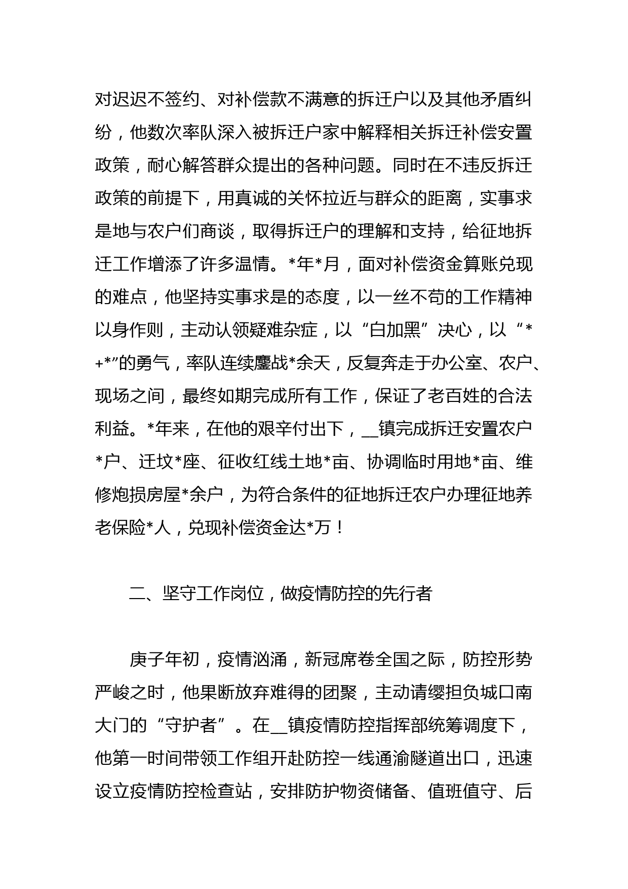 XX副鎮(zhèn)長(zhǎng)、武裝部長(zhǎng)先進(jìn)個(gè)人事跡材料,__市城口縣人,現(xiàn)任縣__鎮(zhèn)人民政府副鎮(zhèn)長(zhǎng)、武裝部長(zhǎng),主抓武裝工作,協(xié)助高速公路建設(shè),分管安全、工程建設(shè)、環(huán)保、城鄉(xiāng)建設(shè)、國(guó)土、電力等重點(diǎn)工作。年—年連續(xù)年年度考核為優(yōu)秀,年—年連續(xù)年年度考核為稱職。年榮獲年度危險(xiǎn)化學(xué)品、煙花爆竹打非治違“先進(jìn)個(gè)人”榮譽(yù)稱號(hào);年被表彰為年度“武裝工作先進(jìn)個(gè)人”,被評(píng)為征兵工作先進(jìn)個(gè)人;年被評(píng)為優(yōu)秀便民訴訟聯(lián)絡(luò)員;年被評(píng)為專武部長(zhǎng)輪訓(xùn)“優(yōu)秀學(xué)員”。一、積極擔(dān)當(dāng)作為,做偉大工程的護(hù)航者銀百高速公路城口段途徑__鎮(zhèn)青龍村莊子壩,年征地拆遷工作啟動(dòng),根據(jù)工作安排,方明擔(dān)...