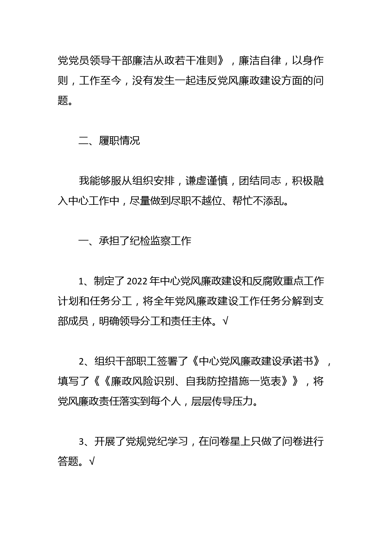 202X年紀(jì)檢監(jiān)察干部個(gè)人工作總結(jié)2022年我主要承擔(dān)了紀(jì)檢監(jiān)察工作、行風(fēng)建設(shè)工作、統(tǒng)一認(rèn)證管理系統(tǒng)維護(hù)工作和網(wǎng)站發(fā)布工作,在領(lǐng)導(dǎo)和中心同志們的幫助和指導(dǎo)下,較為圓滿(mǎn)的完成了本職工作,現(xiàn)將學(xué)習(xí)、廉潔自律情況、履職情況向領(lǐng)導(dǎo)和同志們作如下匯報(bào):一、學(xué)習(xí)和廉潔自律情況1、加強(qiáng)政治理論學(xué)習(xí),不斷提高政治素質(zhì)。能夠深刻領(lǐng)會(huì)XJP新時(shí)代中國(guó)特色社會(huì)主義思想,貫徹落實(shí)黨的二十大和十九屆六中全會(huì)精神和全市組織工作會(huì)議要求,能夠深刻領(lǐng)悟“兩個(gè)確立”的決定性意義,牢固樹(shù)立“四個(gè)意識(shí)”,堅(jiān)定“四個(gè)自信”,做到“二個(gè)維護(hù)”。積極參加委里和中心組織的活動(dòng)和學(xué)習(xí)...