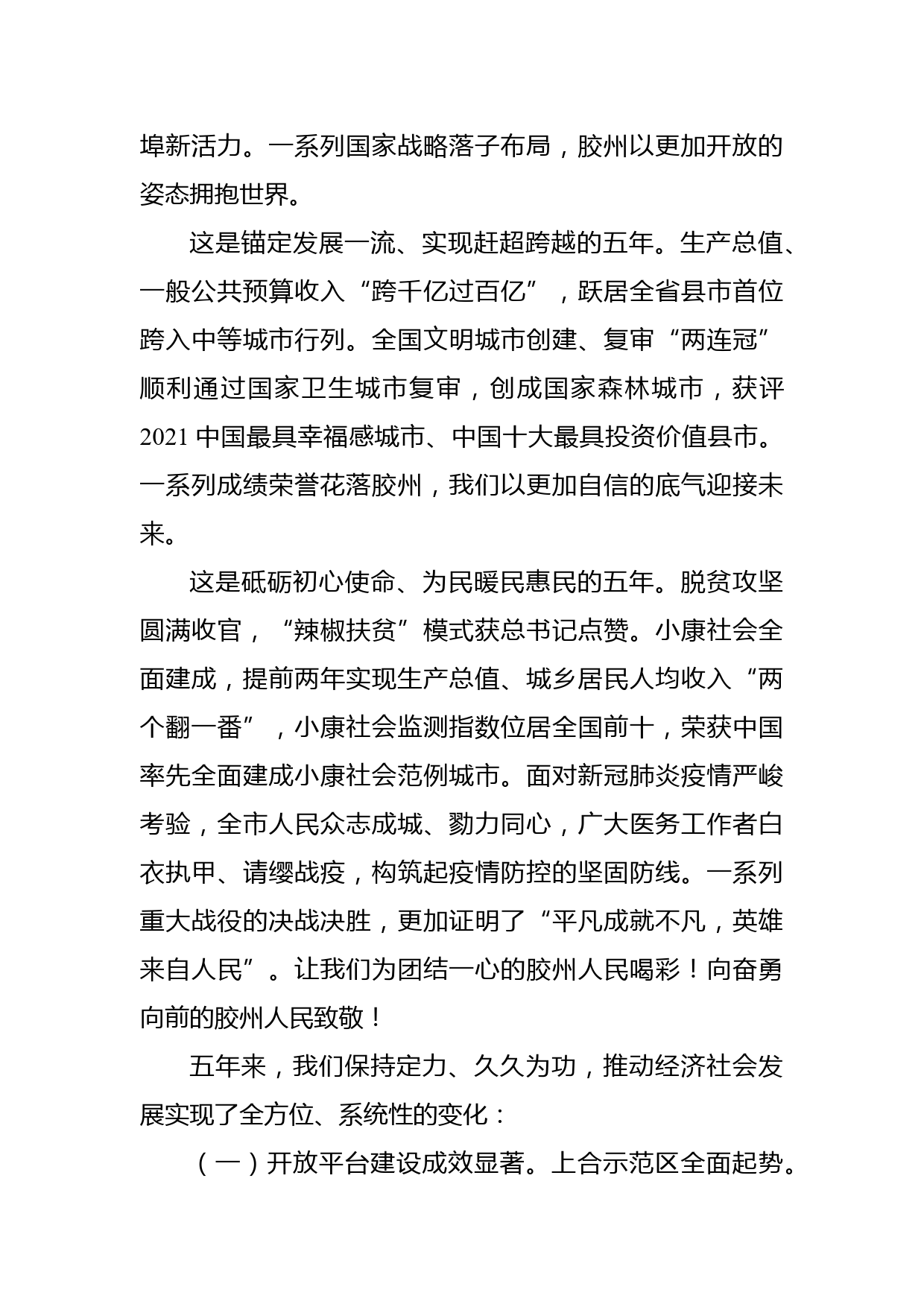 2022年2月25日在膠州市第十八屆人民代表大會第一次會議上膠州市代市長于冬泉各位代表:現(xiàn)在,我代表市人民政府向大會報告工作,請予審議,并請各位政協(xié)委員和其他列席人員提出意見。一、過去五年工作回顧過去的五年,是膠州發(fā)展極不平凡、極具意義的五年。五年來,我們在上級黨委、政府和市委的正確領(lǐng)導(dǎo)下,在市人大、市政協(xié)的監(jiān)督支持下,堅持以XJP新時代中國特色社會主義思想為指導(dǎo),全面貫徹黨的十九大和十九屆歷次全會精神,深入落實(shí)XJP總書記對山東、對青島工作的重要指示要求,立足新發(fā)展階段、貫徹新發(fā)展理念、融入新發(fā)展格局,辦成了一系列大事要事、塑成了一系...