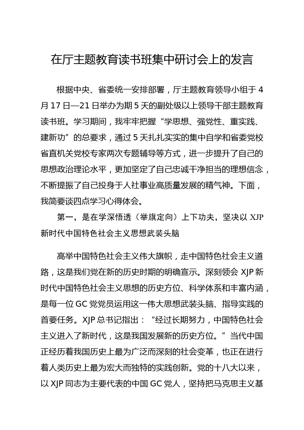 在廳主題教育讀書班集中研討會(huì)上的發(fā)言根據(jù)中央、省委統(tǒng)一安排部署,廳主題教育領(lǐng)導(dǎo)小組于4月17日—21日舉辦為期5天的副處級(jí)以上領(lǐng)導(dǎo)干部主題教育讀書班。學(xué)習(xí)期間,我牢牢把握“學(xué)思想、強(qiáng)黨性、重實(shí)踐、建新功”的總要求,通過5天扎扎實(shí)實(shí)的集中自學(xué)和省委黨校省直機(jī)關(guān)黨校專家兩次專題輔導(dǎo)等方式,進(jìn)一步提升了自己的思想政治理論水平,更加堅(jiān)定了自己忠誠干凈擔(dān)當(dāng)?shù)睦硐胄拍?,不斷提振了自己投身于人社事業(yè)高質(zhì)量發(fā)展的精氣神。下面,我簡(jiǎn)要談四點(diǎn)學(xué)習(xí)心得體會(huì)。第一,是在學(xué)深悟透(舉旗定向)上下功夫,堅(jiān)決以XJP新時(shí)代中國特色社會(huì)主義思想武裝頭腦高舉中國特色社...