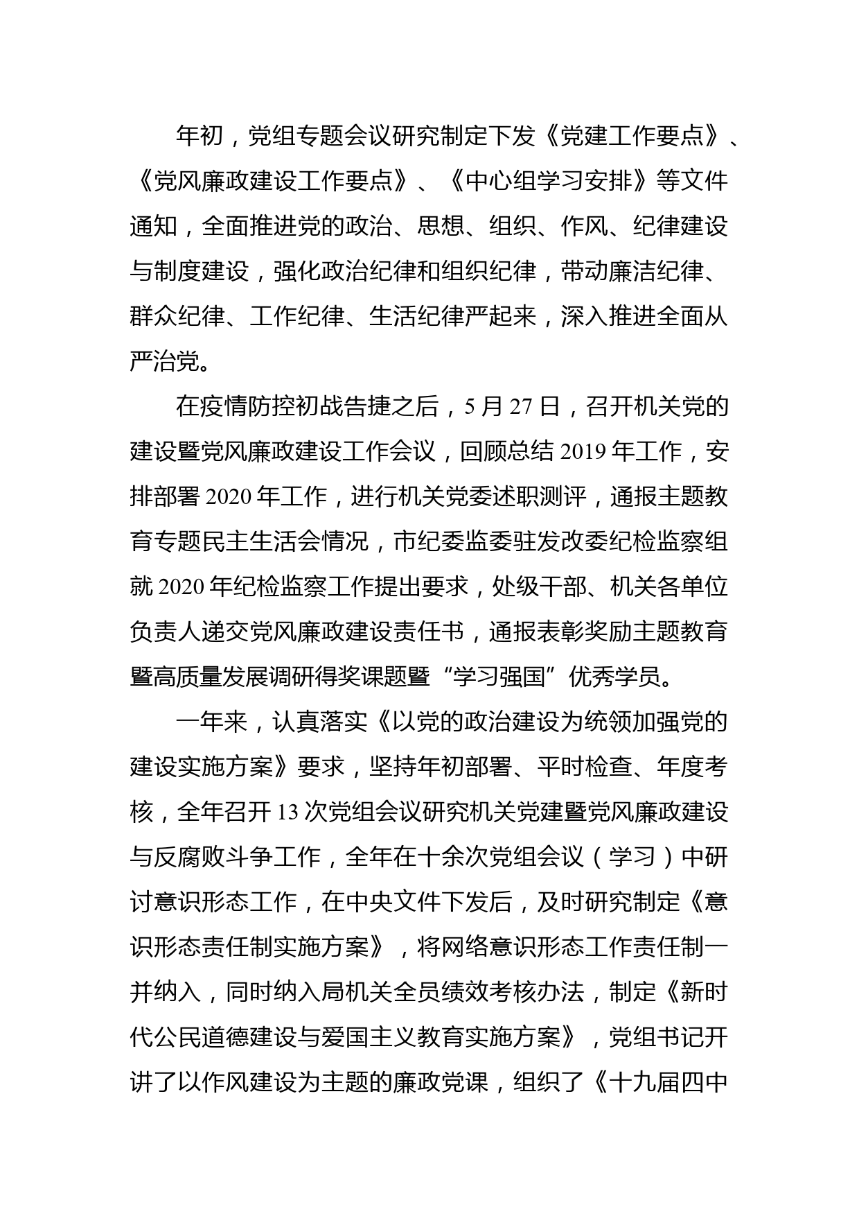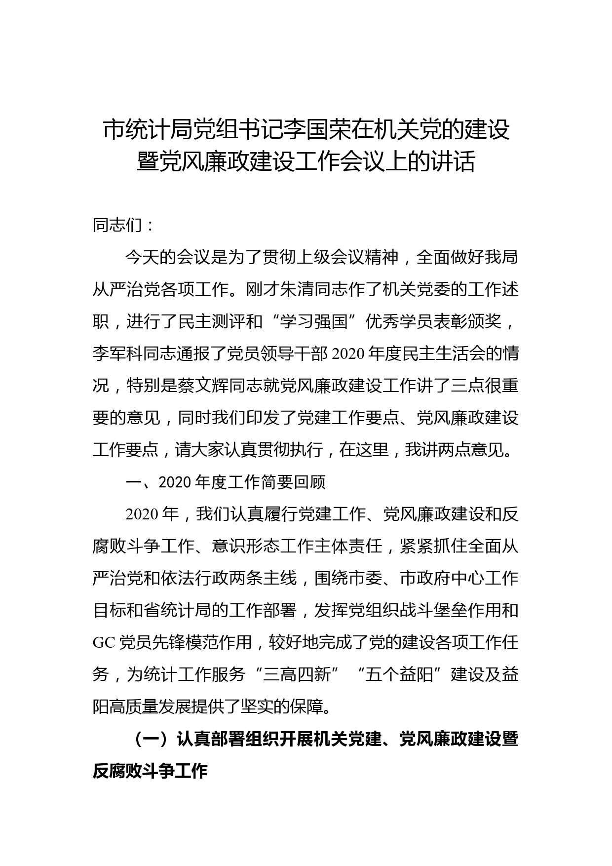 市統(tǒng)計局黨組書記李國榮在機關黨的建設暨黨風廉政建設工作會議上的講話同志們:今天的會議是為了貫徹上級會議精神,全面做好我局從嚴治黨各項工作。剛才朱清同志作了機關黨委的工作述職,進行了民主測評和“學習強國”優(yōu)秀學員表彰頒獎,李軍科同志通報了黨員領導干部2020年度民主生活會的情況,特別是蔡文輝同志就黨風廉政建設工作講了三點很重要的意見,同時我們印發(fā)了黨建工作要點、黨風廉政建設工作要點,請大家認真貫徹執(zhí)行,在這里,我講兩點意見。一、2020年度工作簡要回顧2020年,我們認真履行黨建工作、黨風廉政建設和反腐敗斗爭工作、意識形態(tài)工作主體責任,緊...
