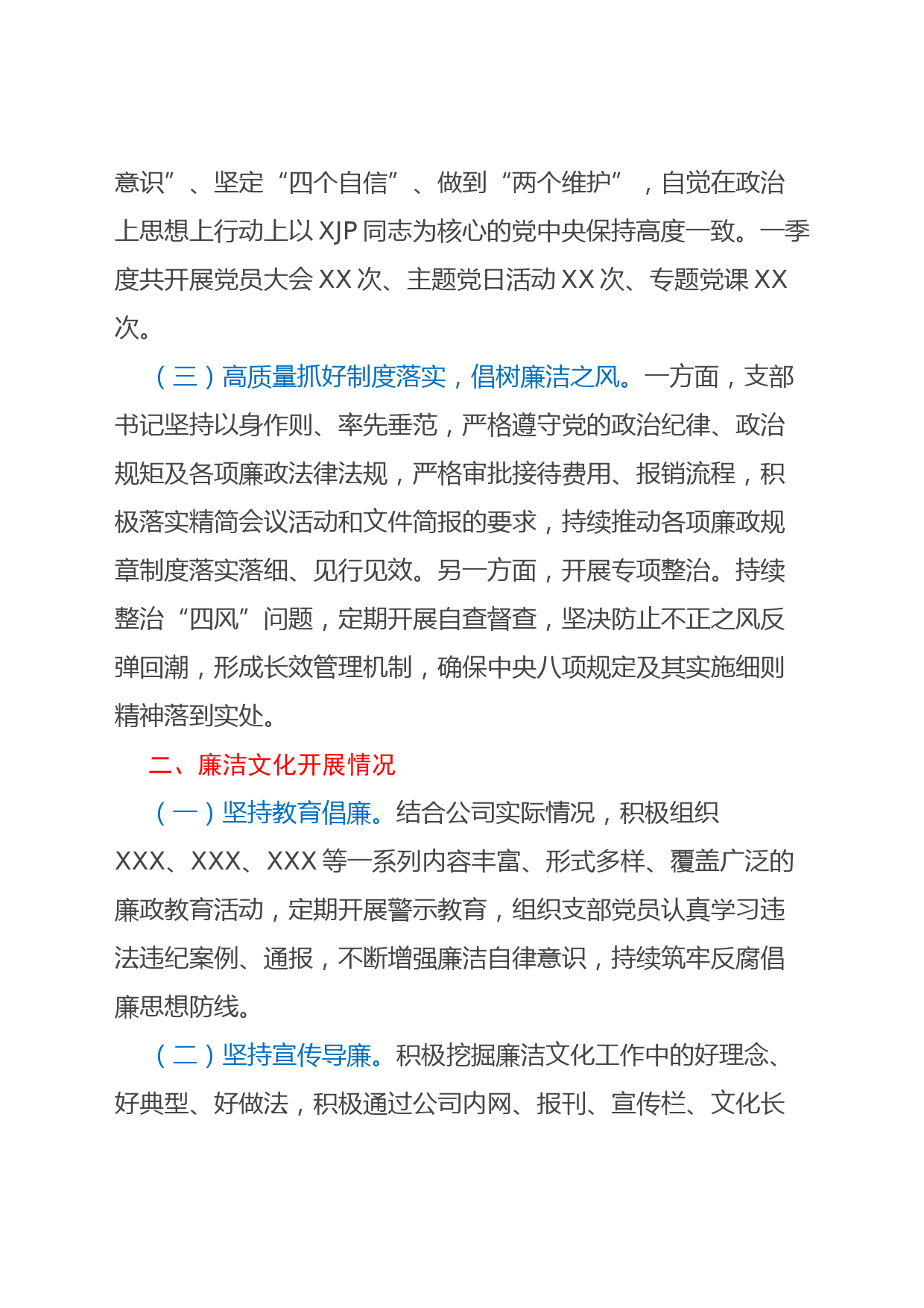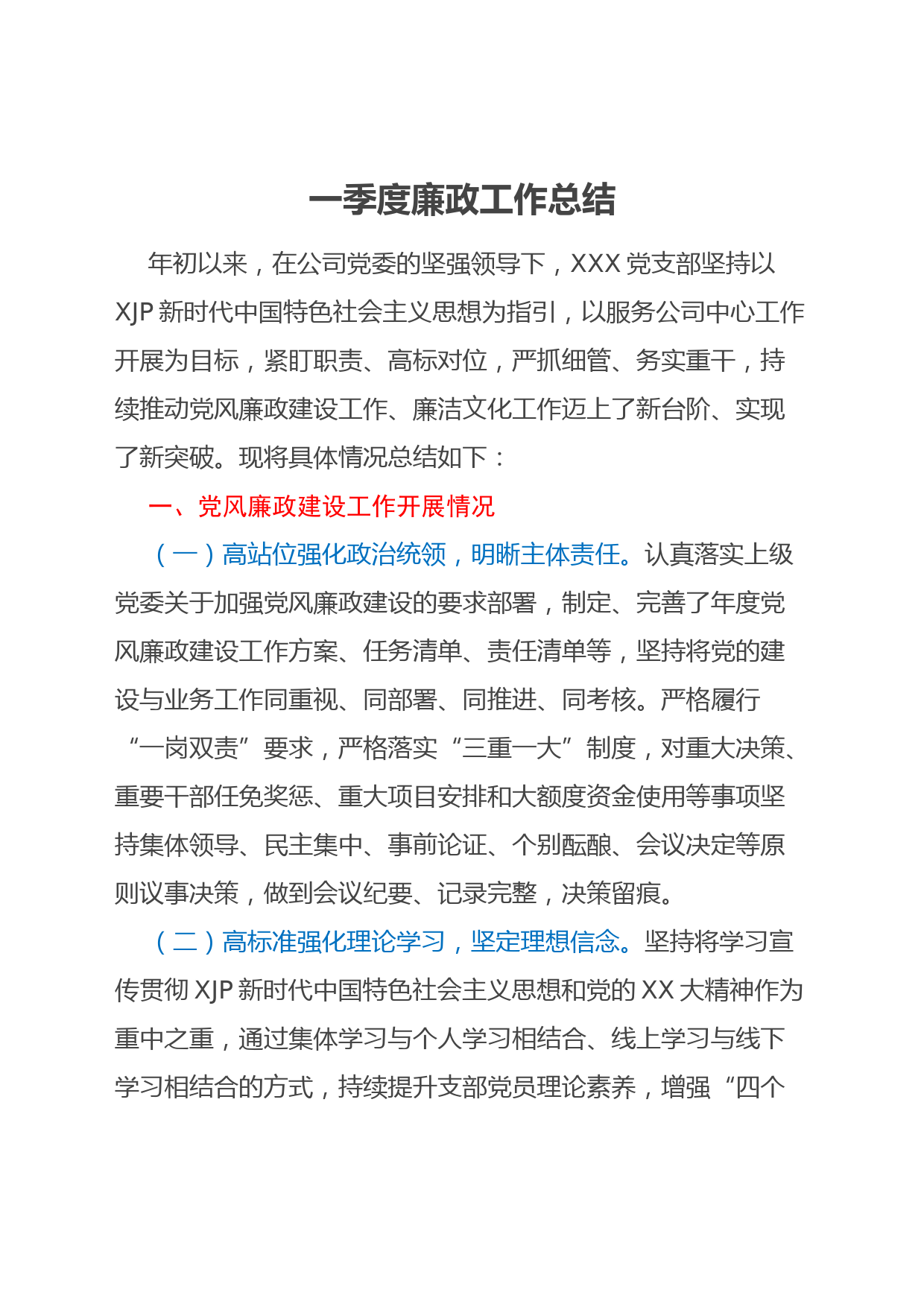 一季度廉政工作總結(jié)年初以來,在公司黨委的堅(jiān)強(qiáng)領(lǐng)導(dǎo)下,XXX黨支部堅(jiān)持以XJP新時代中國特色社會主義思想為指引,以服務(wù)公司中心工作開展為目標(biāo),緊盯職責(zé)、高標(biāo)對位,嚴(yán)抓細(xì)管、務(wù)實(shí)重干,持續(xù)推動黨風(fēng)廉政建設(shè)工作、廉潔文化工作邁上了新臺階、實(shí)現(xiàn)了新突破?,F(xiàn)將具體情況總結(jié)如下:一、黨風(fēng)廉政建設(shè)工作開展情況(一)高站位強(qiáng)化政治統(tǒng)領(lǐng),明晰主體責(zé)任。認(rèn)真落實(shí)上級黨委關(guān)于加強(qiáng)黨風(fēng)廉政建設(shè)的要求部署,制定、完善了年度黨風(fēng)廉政建設(shè)工作方案、任務(wù)清單、責(zé)任清單等,堅(jiān)持將黨的建設(shè)與業(yè)務(wù)工作同重視、同部署、同推進(jìn)、同考核。嚴(yán)格履行“一崗雙責(zé)”要求,嚴(yán)格落實(shí)“...