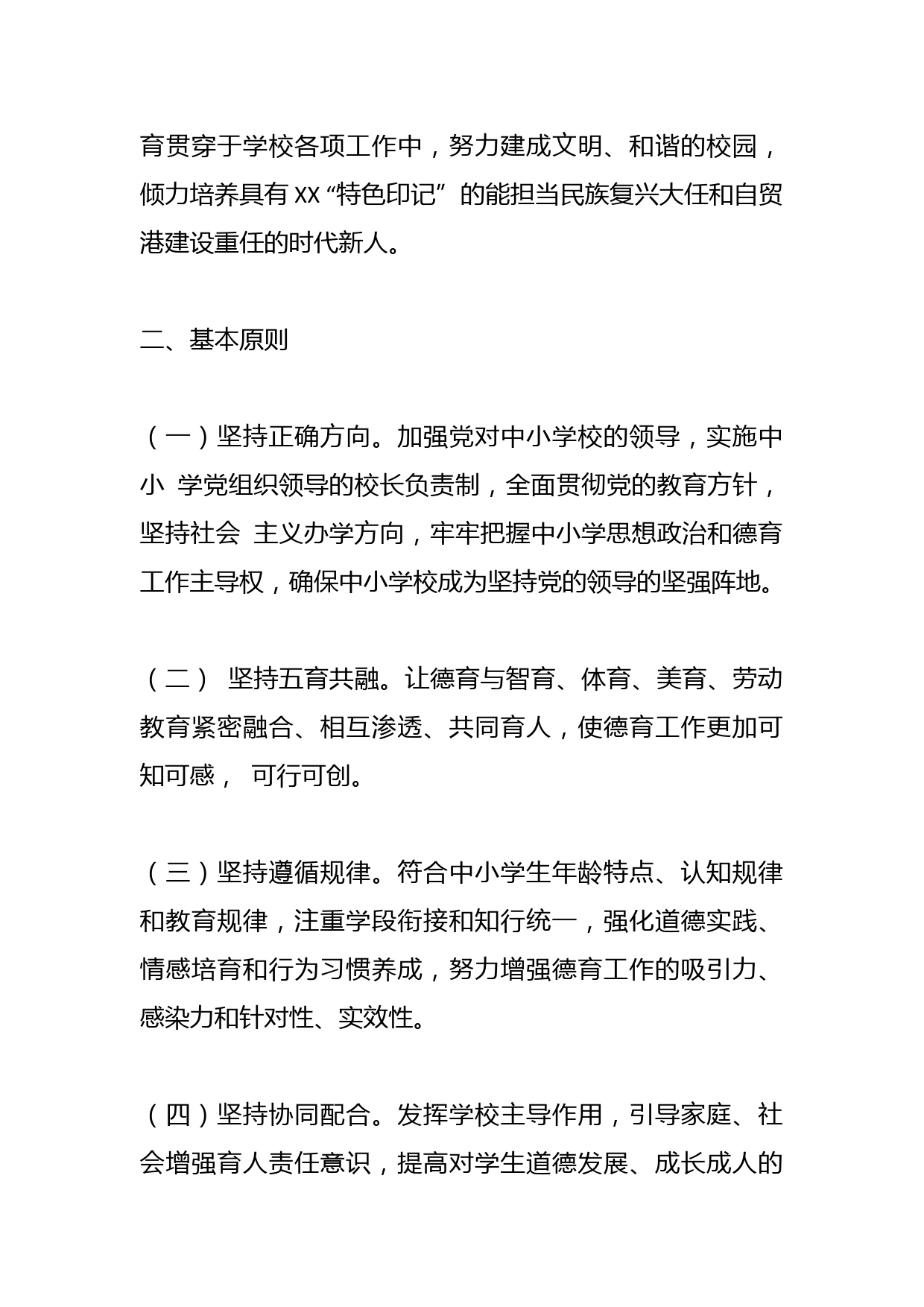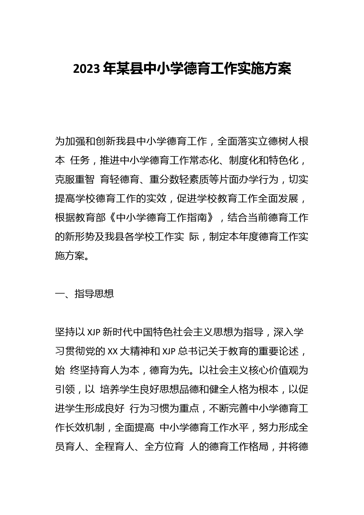 2023年某縣中小學(xué)德育工作實(shí)施方案為加強(qiáng)和創(chuàng)新我縣中小學(xué)德育工作,全面落實(shí)立德樹人根本任務(wù),推進(jìn)中小學(xué)德育工作常態(tài)化、制度化和特色化,克服重智育輕德育、重分?jǐn)?shù)輕素質(zhì)等片面辦學(xué)行為,切實(shí)提高學(xué)校德育工作的實(shí)效,促進(jìn)學(xué)校教育工作全面發(fā)展,根據(jù)教育部《中小學(xué)德育工作指南》,結(jié)合當(dāng)前德育工作的新形勢及我縣各學(xué)校工作實(shí)際,制定本年度德育工作實(shí)施方案。一、指導(dǎo)思想堅(jiān)持以XJP新時代中國特色社會主義思想為指導(dǎo),深入學(xué)習(xí)貫徹黨的XX大精神和XJP總書記關(guān)于教育的重要論述,始終堅(jiān)持育人為本,德育為先。以社會主義核心價值觀為引領(lǐng),以培養(yǎng)學(xué)生良好思想品德和...