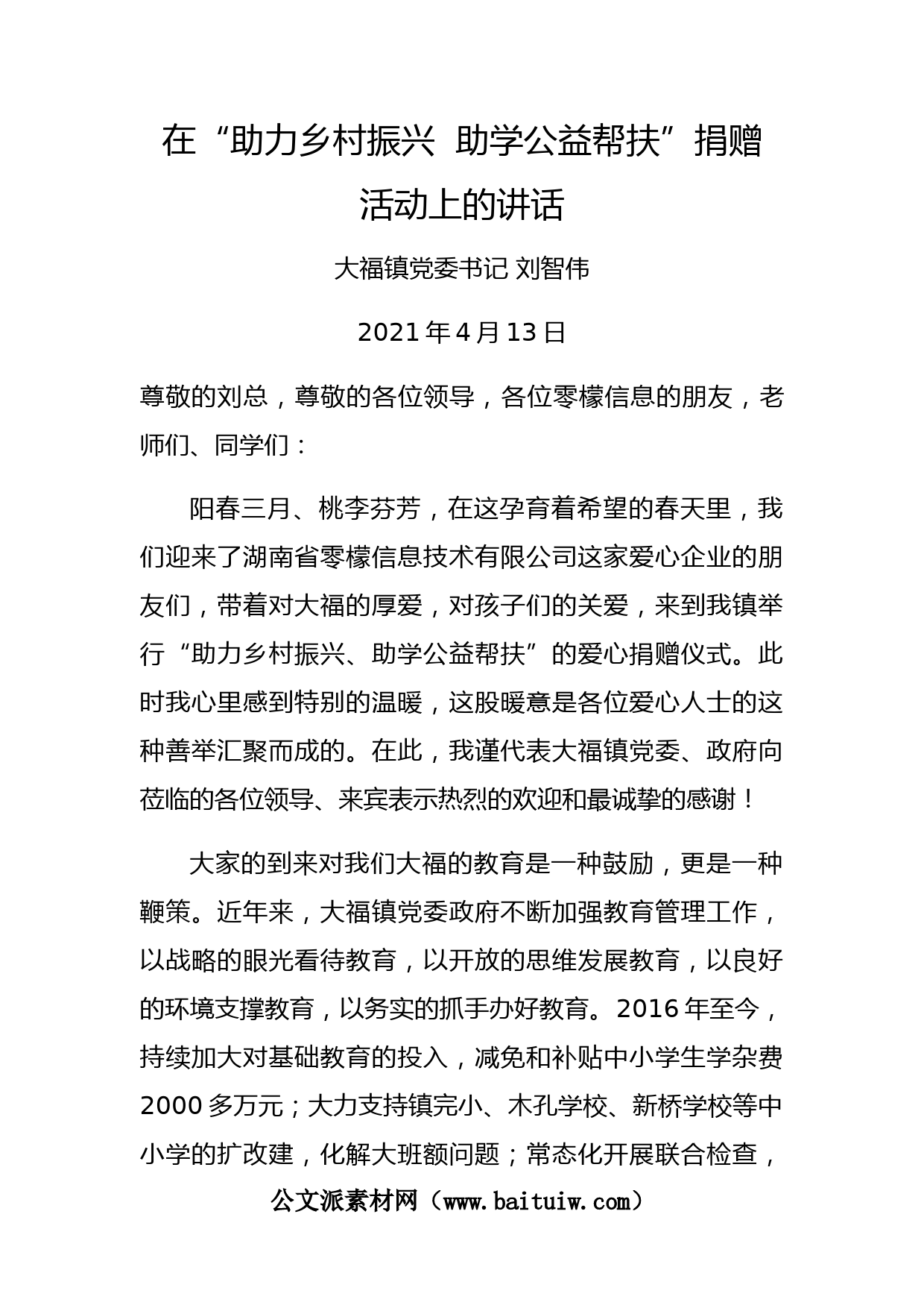 在“助力鄉(xiāng)村振興助學(xué)公益幫扶”捐贈活動上的講話大福鎮(zhèn)黨委書記劉智偉2021年4月13日尊敬的劉總,尊敬的各位領(lǐng)導(dǎo),各位零檬信息的朋友,老師們、同學(xué)們:陽春三月、桃李芬芳,在這孕育著希望的春天里,我們迎來了湖南省零檬信息技術(shù)有限公司這家愛心企業(yè)的朋友們,帶著對大福的厚愛,對孩子們的關(guān)愛,來到我鎮(zhèn)舉行“助力鄉(xiāng)村振興、助學(xué)公益幫扶”的愛心捐贈儀式。此時(shí)我心里感到特別的溫暖,這股暖意是各位愛心人士的這種善舉匯聚而成的。在此,我謹(jǐn)代表大福鎮(zhèn)黨委、政府向蒞臨的各位領(lǐng)導(dǎo)、來賓表示熱烈的歡迎和最誠摯的感謝!大家的到來對我們大福的教育是一種鼓勵,更...