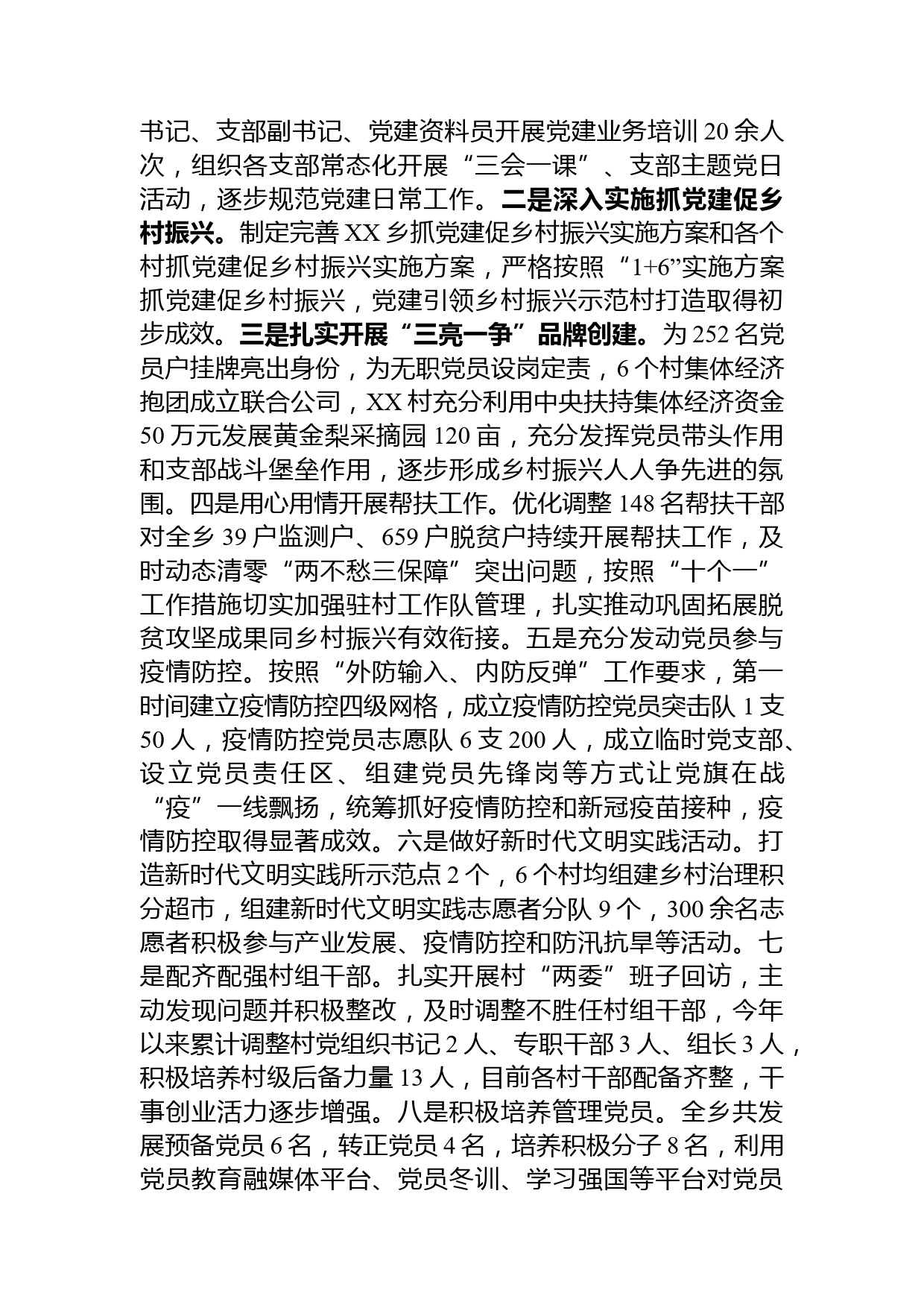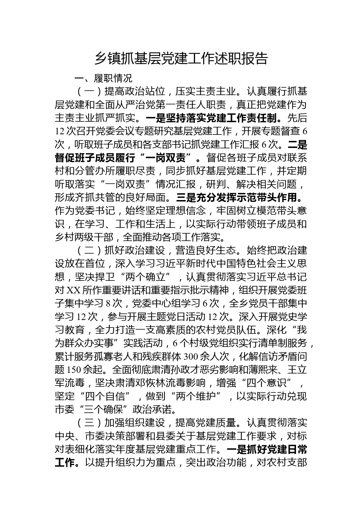 鄉(xiāng)鎮(zhèn)抓基層黨建工作述職報(bào)告一、履職情況(一)提高政治站位,壓實(shí)主責(zé)主業(yè)。認(rèn)真履行抓基層黨建和全面從嚴(yán)治黨第一責(zé)任人職責(zé),真正把黨建作為主責(zé)主業(yè)抓嚴(yán)抓實(shí)。一是堅(jiān)持落實(shí)黨建工作責(zé)任制。先后12次召開黨委會(huì)議專題研究基層黨建工作,開展專題督查6次,聽取班子成員和各支部書記抓黨建工作匯報(bào)6次。二是督促班子成員履行“一崗雙責(zé)”。督促各班子成員對聯(lián)系村和分管辦所履職盡責(zé),同步抓好基層黨建工作,并定期聽取落實(shí)“一崗雙責(zé)”情況匯報(bào),研判、解決相關(guān)問題,形成齊抓共管的良好局面。三是充分發(fā)揮示范帶頭作用。作為黨委書記,始終堅(jiān)定理想信念,牢固樹立模范...