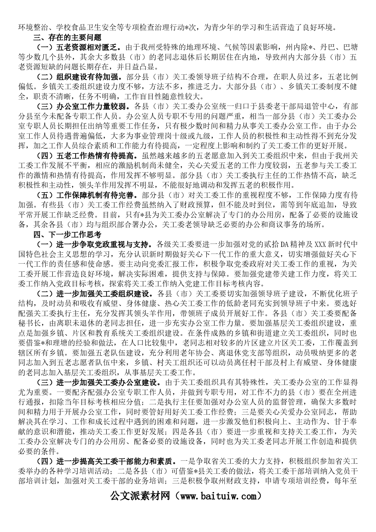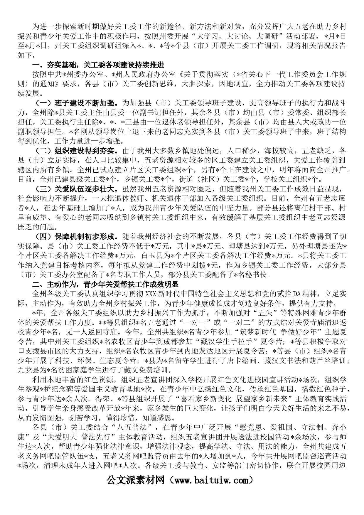 為進(jìn)一步探索新時(shí)期做好關(guān)工委工作的新途徑、新方法和新對(duì)策,充分發(fā)揮廣大五老在助力鄉(xiāng)村振興和青少年關(guān)愛工作中的積極作用,按照州委開展“大學(xué)習(xí)、大討論、大調(diào)研”活動(dòng)部署,月日至月日,州關(guān)工委組織調(diào)研組深入、、等個(gè)縣(市)開展關(guān)工委工作調(diào)研,現(xiàn)將相關(guān)情況報(bào)告如下。一、夯實(shí)基礎(chǔ),關(guān)工委各項(xiàng)建設(shè)持續(xù)推進(jìn)按照中共州委辦公室、州人民政府辦公室《關(guān)于貫徹落實(shí)〈省關(guān)心下一代工作委員會(huì)工作規(guī)則〉的通知》要求,各縣(市)關(guān)工委創(chuàng)新思維,大膽探索,因地制宜,全力推動(dòng)關(guān)工委各項(xiàng)建設(shè)持續(xù)發(fā)展。(一)班子建設(shè)不斷加強(qiáng)。為加強(qiáng)縣(市)關(guān)工委領(lǐng)導(dǎo)班子建設(shè),提...