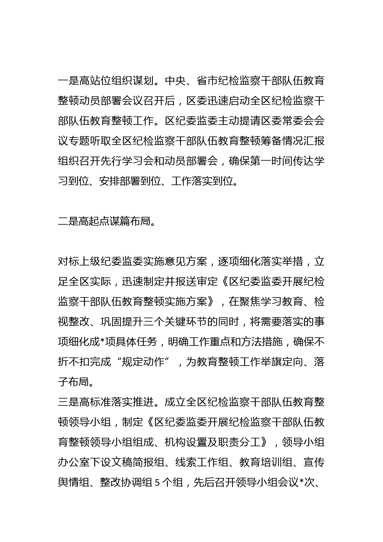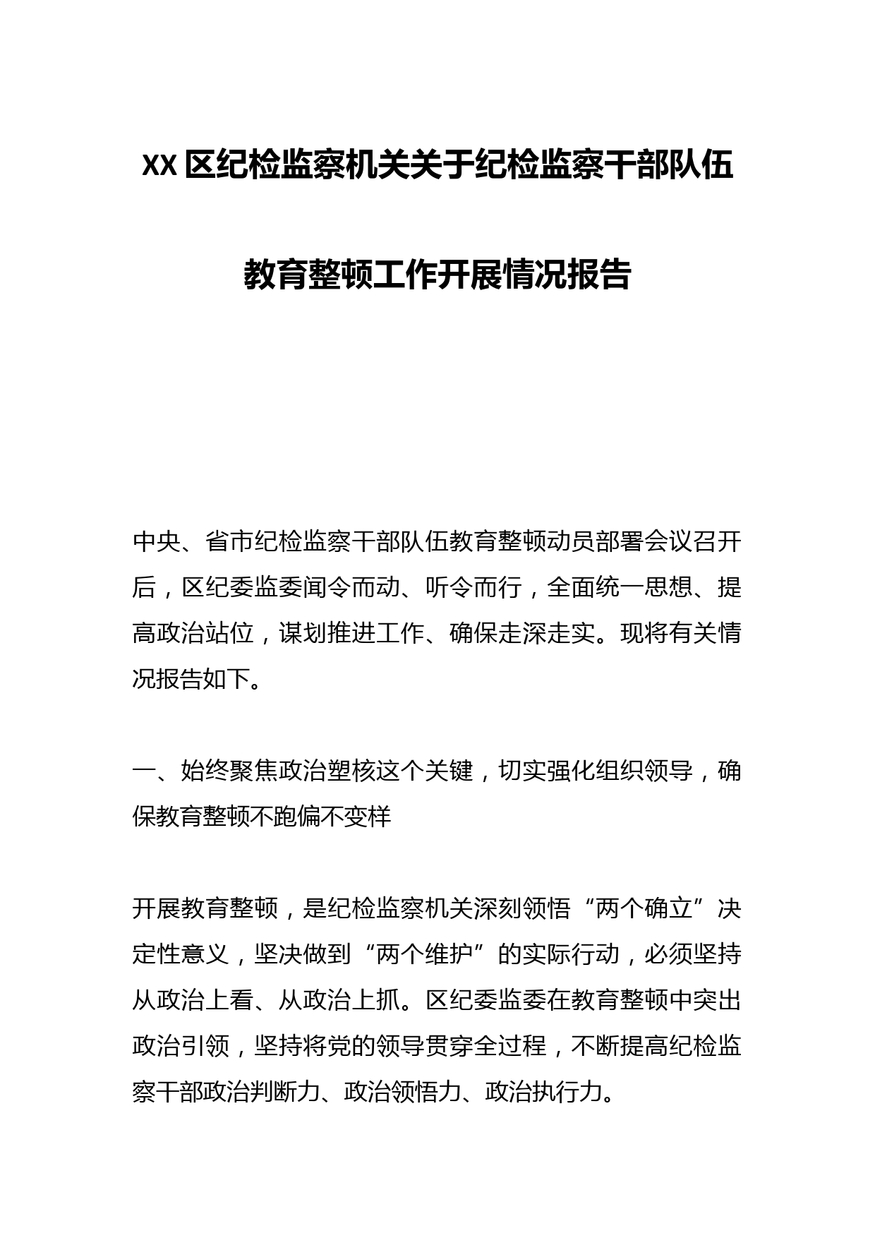 XX區(qū)紀(jì)檢監(jiān)察機(jī)關(guān)關(guān)于紀(jì)檢監(jiān)察干部隊(duì)伍教育整頓工作開展情況報(bào)告中央、省市紀(jì)檢監(jiān)察干部隊(duì)伍教育整頓動(dòng)員部署會(huì)議召開后,區(qū)紀(jì)委監(jiān)委聞令而動(dòng)、聽令而行,全面統(tǒng)一思想、提高政治站位,謀劃推進(jìn)工作、確保走深走實(shí)?,F(xiàn)將有關(guān)情況報(bào)告如下。一、始終聚焦政治塑核這個(gè)關(guān)鍵,切實(shí)強(qiáng)化組織領(lǐng)導(dǎo),確保教育整頓不跑偏不變樣開展教育整頓,是紀(jì)檢監(jiān)察機(jī)關(guān)深刻領(lǐng)悟“兩個(gè)確立”決定性意義,堅(jiān)決做到“兩個(gè)維護(hù)”的實(shí)際行動(dòng),必須堅(jiān)持從政治上看、從政治上抓。區(qū)紀(jì)委監(jiān)委在教育整頓中突出政治引領(lǐng),堅(jiān)持將黨的領(lǐng)導(dǎo)貫穿全過程,不斷提高紀(jì)檢監(jiān)察干部政治判斷力、政治領(lǐng)悟力、政治執(zhí)...