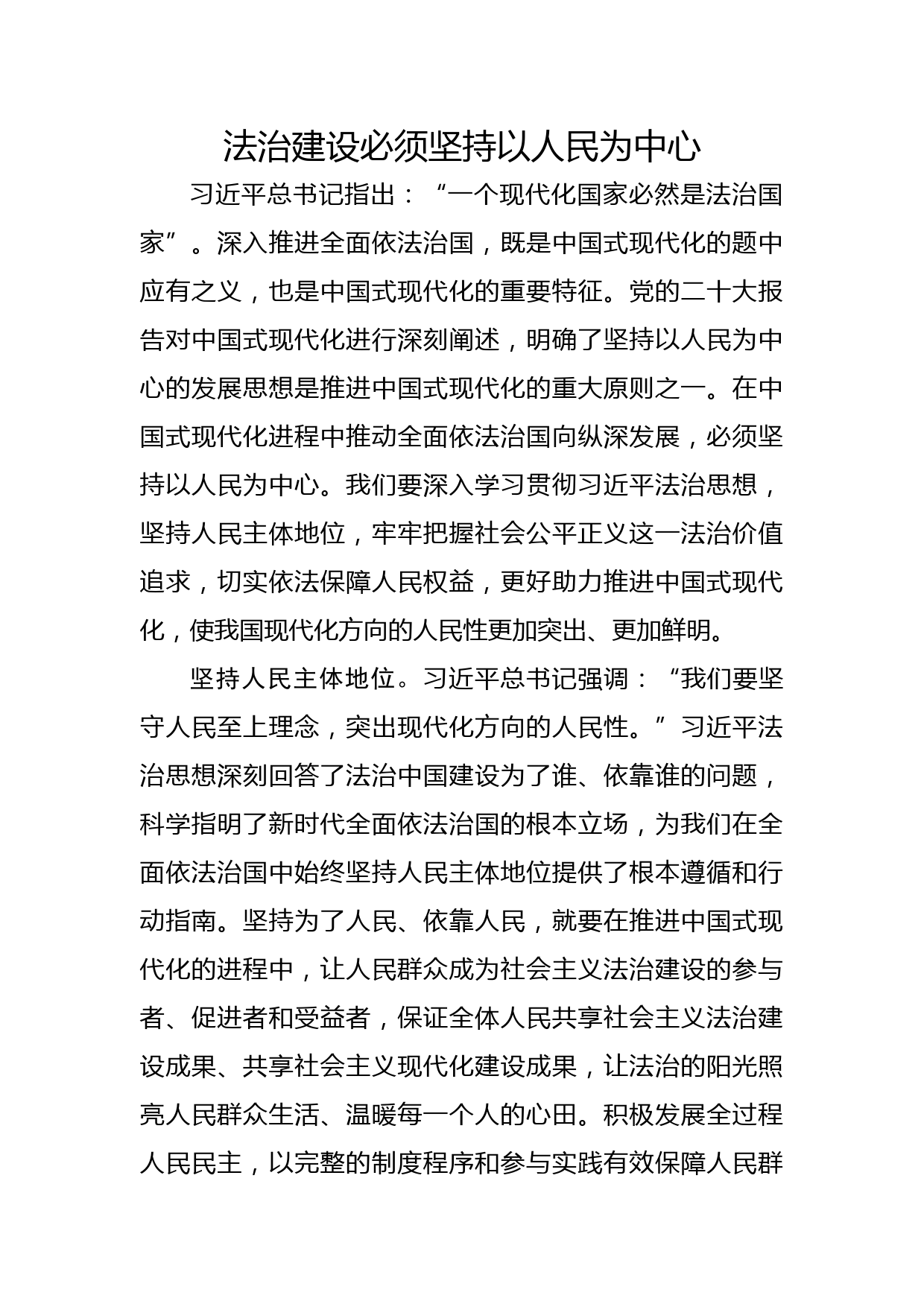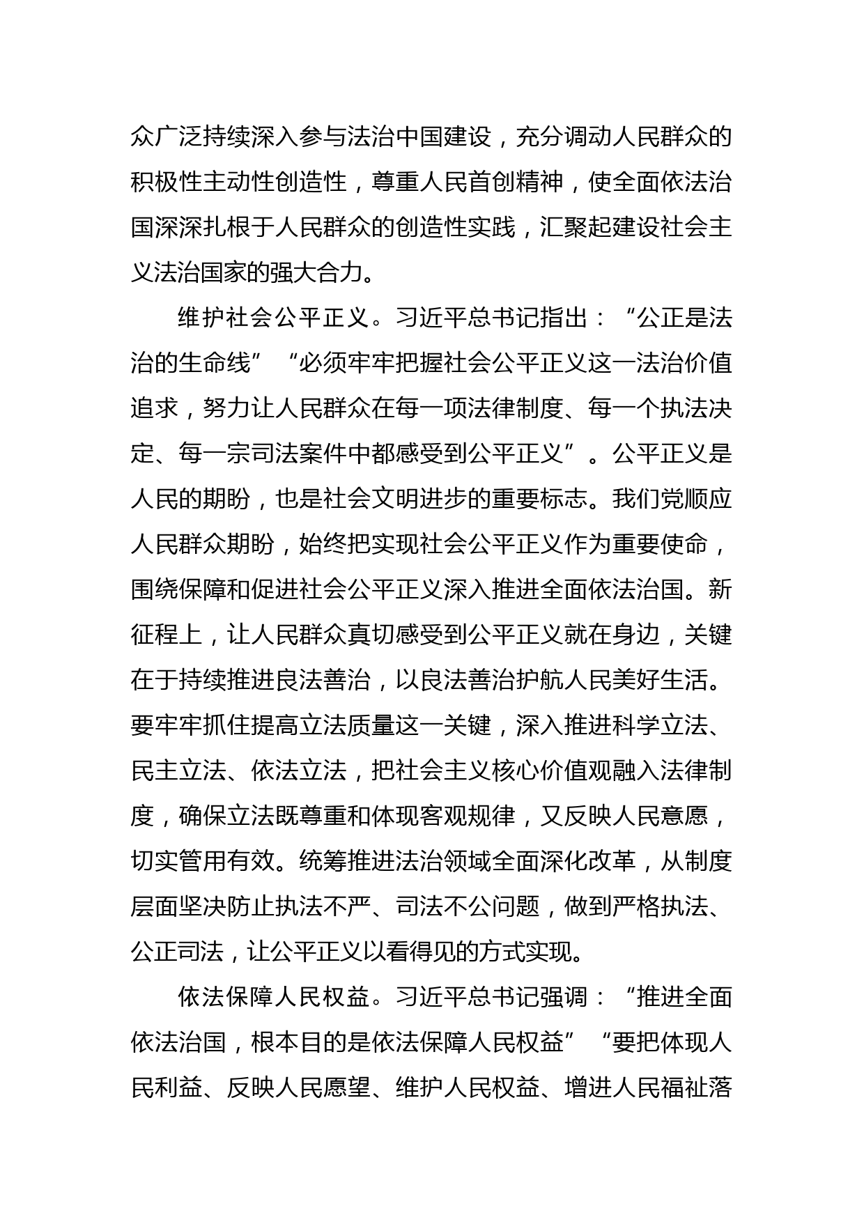 法治建設(shè)必須堅(jiān)持以人民為中心習(xí)近平總書記指出:“一個(gè)現(xiàn)代化國家必然是法治國家”。深入推進(jìn)全面依法治國,既是中國式現(xiàn)代化的題中應(yīng)有之義,也是中國式現(xiàn)代化的重要特征。黨的二十大報(bào)告對中國式現(xiàn)代化進(jìn)行深刻闡述,明確了堅(jiān)持以人民為中心的發(fā)展思想是推進(jìn)中國式現(xiàn)代化的重大原則之一。在中國式現(xiàn)代化進(jìn)程中推動(dòng)全面依法治國向縱深發(fā)展,必須堅(jiān)持以人民為中心。我們要深入學(xué)習(xí)貫徹習(xí)近平法治思想,堅(jiān)持人民主體地位,牢牢把握社會(huì)公平正義這一法治價(jià)值追求,切實(shí)依法保障人民權(quán)益,更好助力推進(jìn)中國式現(xiàn)代化,使我國現(xiàn)代化方向的人民性更加突出、更加鮮明。堅(jiān)持人民...