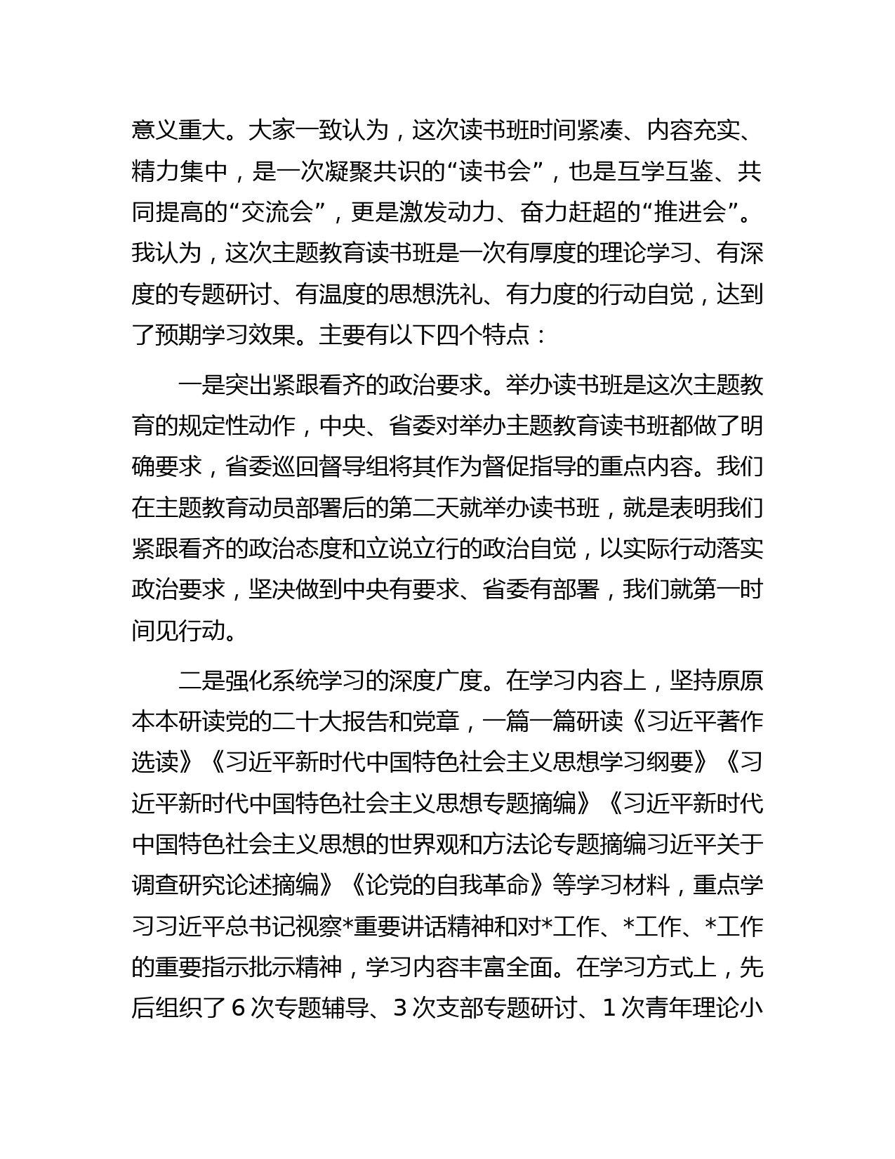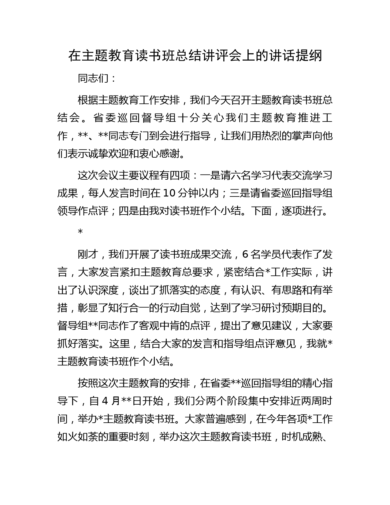 在主題教育讀書班總結(jié)講評會上的講話提綱同志們:根據(jù)主題教育工作安排,我們今天召開主題教育讀書班總結(jié)會。省委巡回督導(dǎo)組十分關(guān)心我們主題教育推進(jìn)工作,、同志專門到會進(jìn)行指導(dǎo),讓我們用熱烈的掌聲向他們表示誠摯歡迎和衷心感謝。這次會議主要議程有四項:一是請六名學(xué)習(xí)代表交流學(xué)習(xí)成果,每人發(fā)言時間在10分鐘以內(nèi);三是請省委巡回指導(dǎo)組領(lǐng)導(dǎo)作點評;四是由我對讀書班作個小結(jié)。下面,逐項進(jìn)行。剛才,我們開展了讀書班成果交流,6名學(xué)員代表作了發(fā)言,大家發(fā)言緊扣主題教育總要求,緊密結(jié)合工作實際,講出了認(rèn)識深度,談出了抓落實的態(tài)度,有認(rèn)識、有思路和有舉...