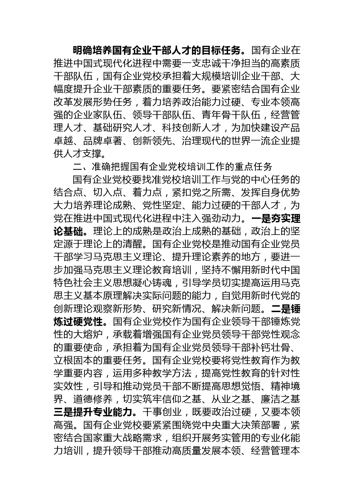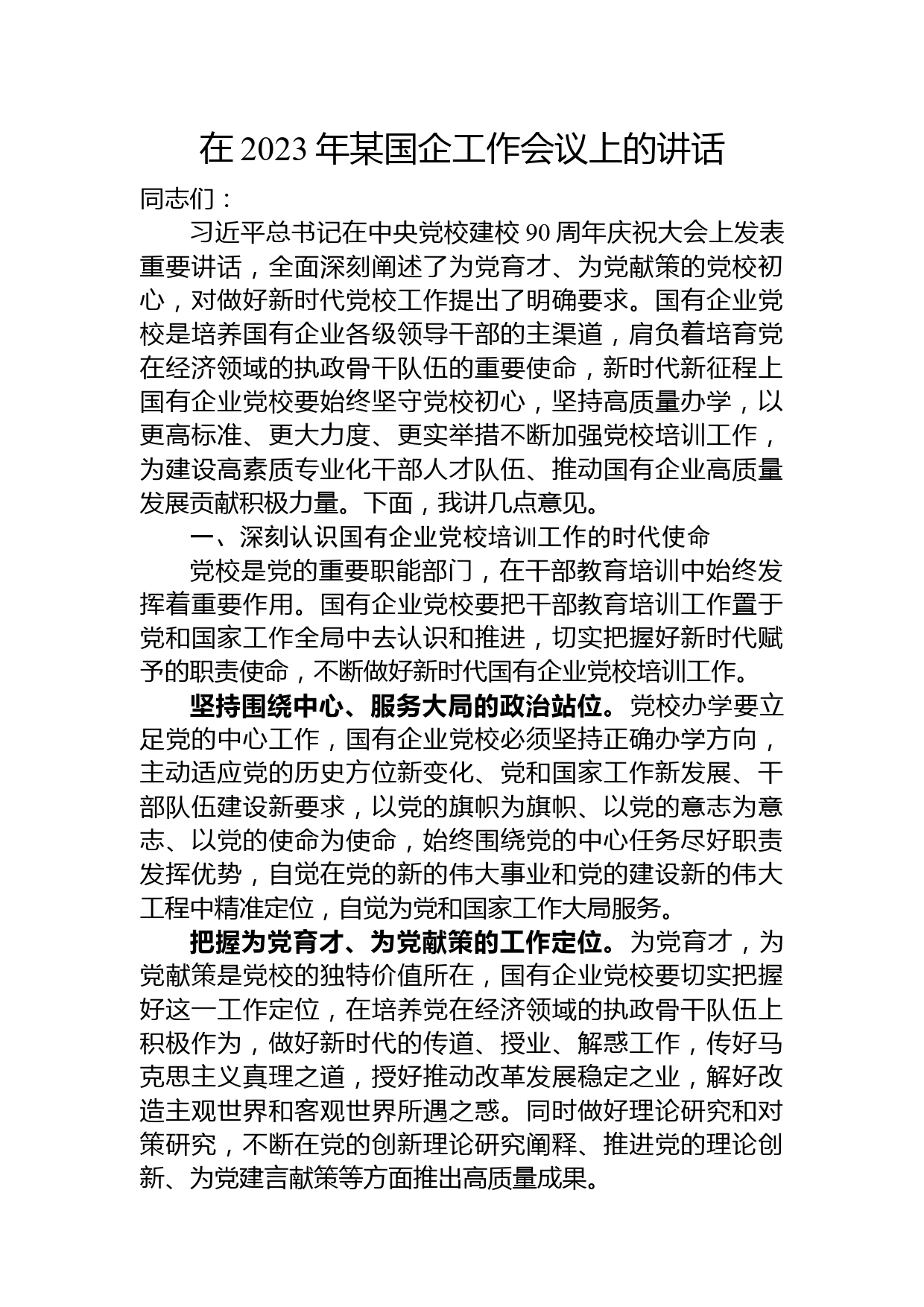 在2023年某國企工作會議上的講話同志們:習(xí)近平總書記在中央黨校建校90周年慶祝大會上發(fā)表重要講話,全面深刻闡述了為黨育才、為黨獻(xiàn)策的黨校初心,對做好新時(shí)代黨校工作提出了明確要求。國有企業(yè)黨校是培養(yǎng)國有企業(yè)各級領(lǐng)導(dǎo)干部的主渠道,肩負(fù)著培育黨在經(jīng)濟(jì)領(lǐng)域的執(zhí)政骨干隊(duì)伍的重要使命,新時(shí)代新征程上國有企業(yè)黨校要始終堅(jiān)守黨校初心,堅(jiān)持高質(zhì)量辦學(xué),以更高標(biāo)準(zhǔn)、更大力度、更實(shí)舉措不斷加強(qiáng)黨校培訓(xùn)工作,為建設(shè)高素質(zhì)專業(yè)化干部人才隊(duì)伍、推動國有企業(yè)高質(zhì)量發(fā)展貢獻(xiàn)積極力量。下面,我講幾點(diǎn)意見。一、深刻認(rèn)識國有企業(yè)黨校培訓(xùn)工作的時(shí)代使命黨校是黨的重要職...