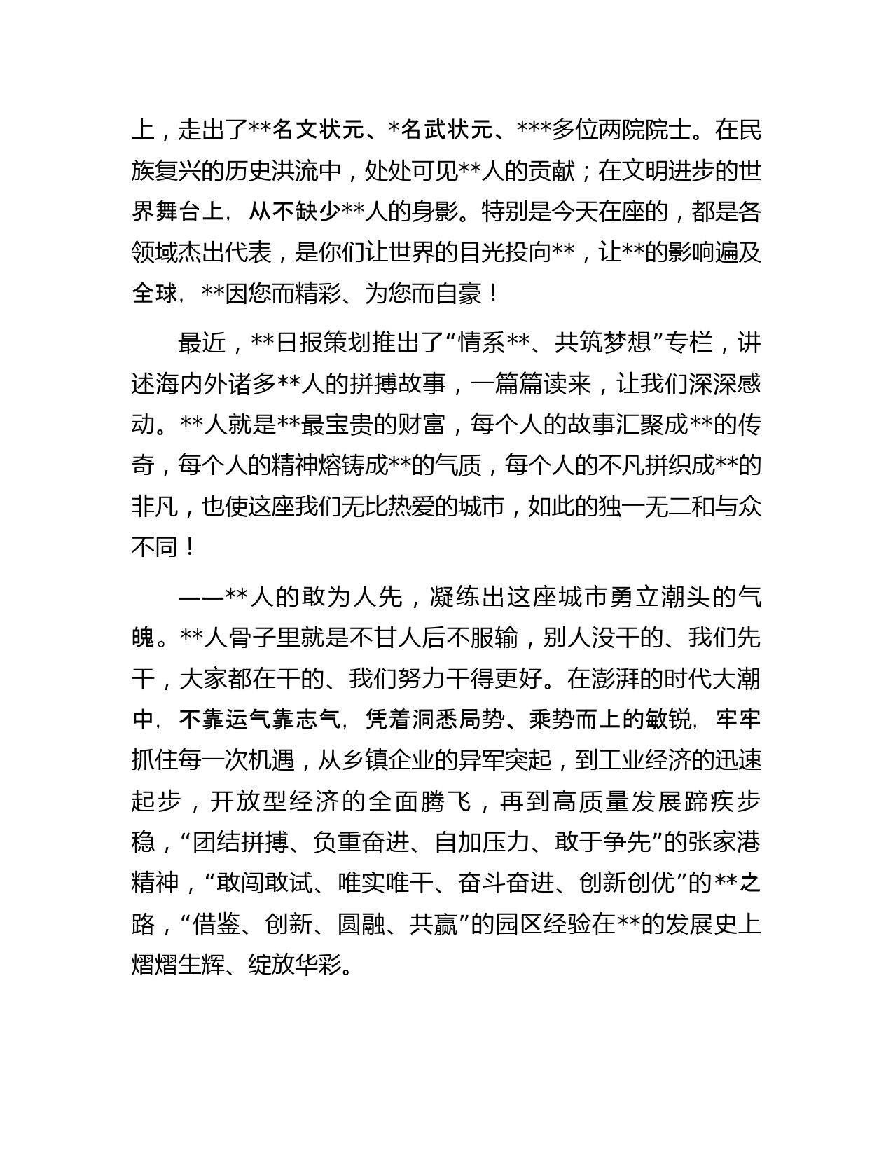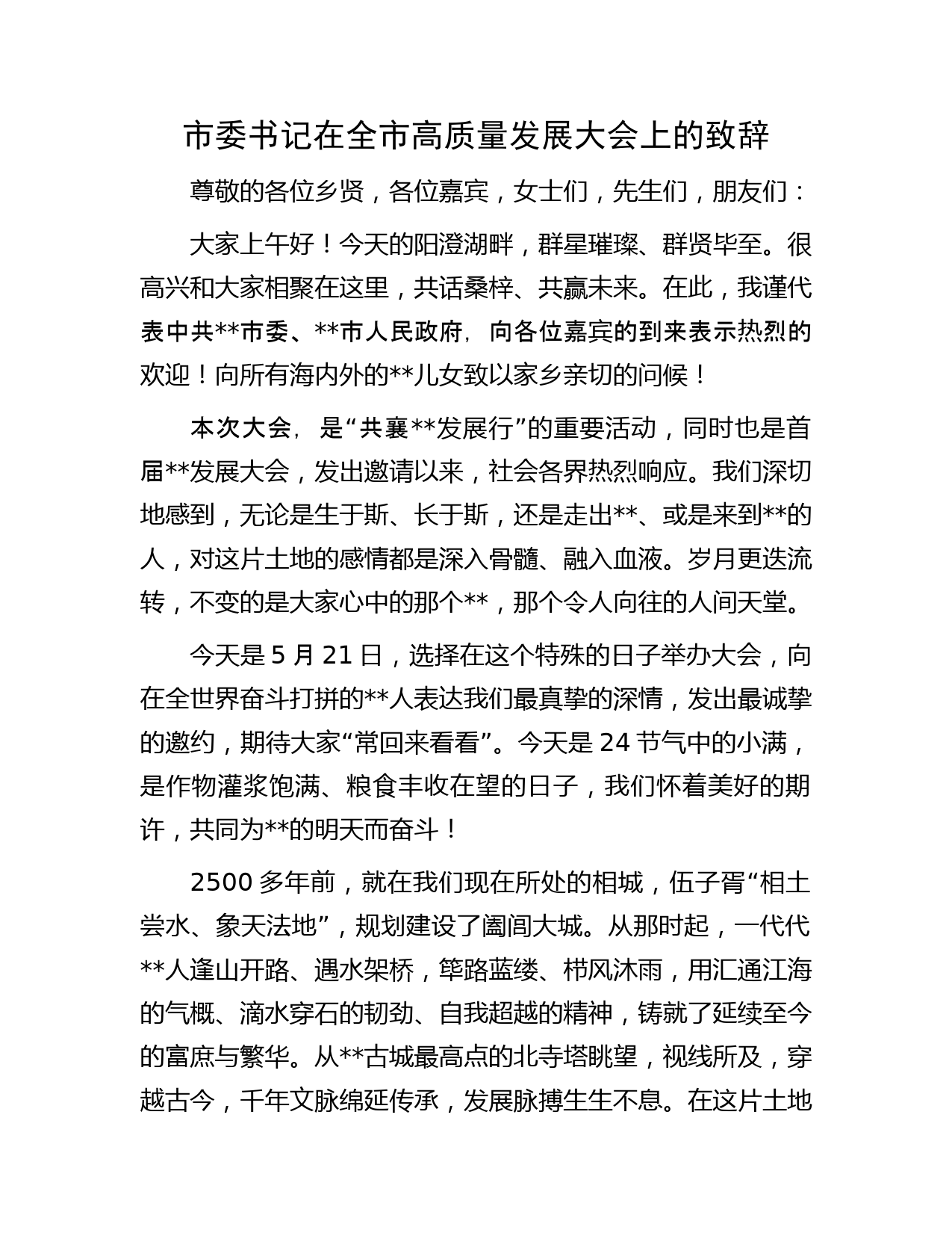 市委書(shū)記在全市高質(zhì)量發(fā)展大會(huì)上的致辭尊敬的各位鄉(xiāng)賢,各位嘉賓,女士們,先生們,朋友們:大家上午好!今天的陽(yáng)澄湖畔,群星璀璨、群賢畢至。很高興和大家相聚在這里,共話桑梓、共贏未來(lái)。在此,我謹(jǐn)代表中共市委、市人民政府,向各位嘉賓的到來(lái)表示熱烈的歡迎!向所有海內(nèi)外的兒女致以家鄉(xiāng)親切的問(wèn)候!本次大會(huì),是“共襄發(fā)展行”的重要活動(dòng),同時(shí)也是首屆發(fā)展大會(huì),發(fā)出邀請(qǐng)以來(lái),社會(huì)各界熱烈響應(yīng)。我們深切地感到,無(wú)論是生于斯、長(zhǎng)于斯,還是走出、或是來(lái)到的人,對(duì)這片土地的感情都是深入骨髓、融入血液。歲月更迭流轉(zhuǎn),不變的是大家心中的那個(gè),那個(gè)令人向往的...