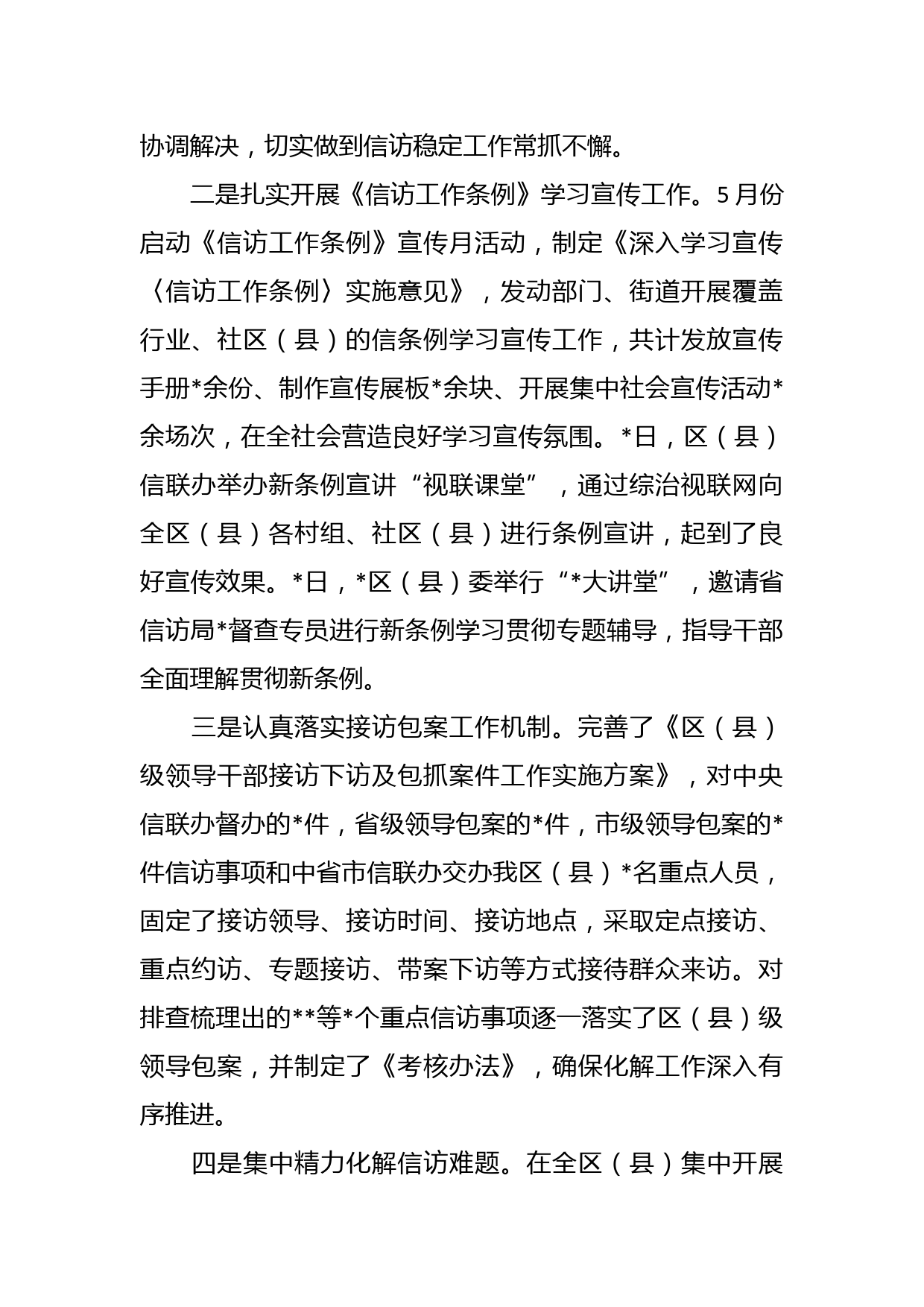 2023年XX區(qū)(縣)信訪局上半年工作總結(jié)2023年上半年,在區(qū)(縣)委、區(qū)(縣)政府的高度重視和正確領(lǐng)導(dǎo)下,區(qū)(縣)信訪局大力推進(jìn)學(xué)習(xí)宣傳貫徹《信訪工作條例》活動(dòng),持續(xù)扎實(shí)開展“大督查大接訪大調(diào)研”活動(dòng),強(qiáng)力推進(jìn)信訪積案化解專項(xiàng)工作、持續(xù)深化信訪制度改革、著力夯實(shí)信訪工作基層基礎(chǔ)、扎實(shí)做好重點(diǎn)時(shí)期信訪保障?,F(xiàn)就上半年工作總結(jié)如下:一、2023年上半年總體工作情況2023年,我區(qū)(縣)信訪形勢(shì)總體平穩(wěn),區(qū)(縣)信訪接待大廳接待上訪群眾批人次。其中集訪批人次;個(gè)訪批人次。處置進(jìn)越級(jí)訪人人次,赴省集體訪批人次。辦理網(wǎng)上信訪事項(xiàng)件,大力提升考核指標(biāo)...