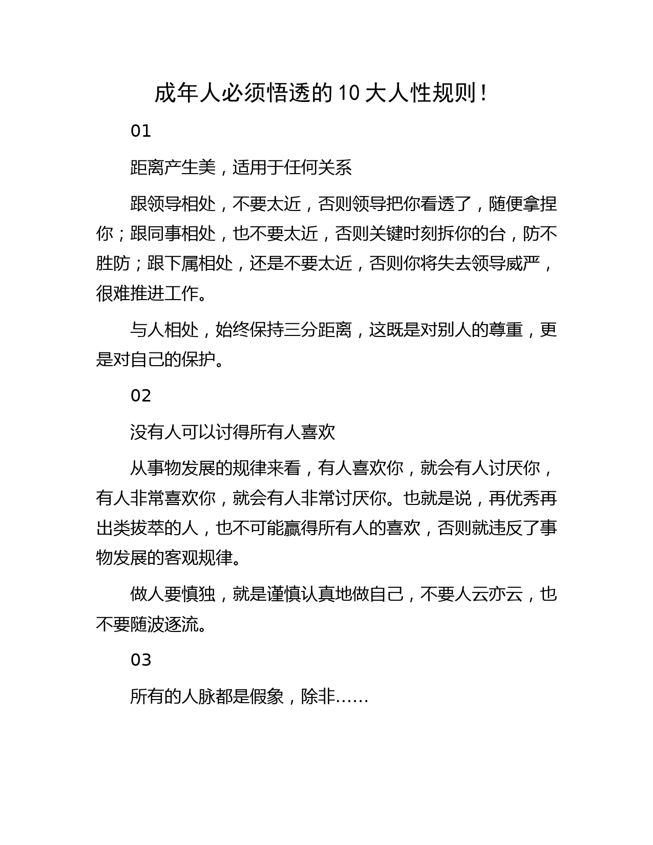 成年人必須悟透的10大人性規(guī)則!01距離產(chǎn)生美,適用于任何關(guān)系跟領(lǐng)導(dǎo)相處,不要太近,否則領(lǐng)導(dǎo)把你看透了,隨便拿捏你;跟同事相處,也不要太近,否則關(guān)鍵時(shí)刻拆你的臺(tái),防不勝防;跟下屬相處,還是不要太近,否則你將失去領(lǐng)導(dǎo)威嚴(yán),很難推進(jìn)工作。與人相處,始終保持三分距離,這既是對(duì)別人的尊重,更是對(duì)自己的保護(hù)。02沒(méi)有人可以討得所有人喜歡從事物發(fā)展的規(guī)律來(lái)看,有人喜歡你,就會(huì)有人討厭你,有人非常喜歡你,就會(huì)有人非常討厭你。也就是說(shuō),再優(yōu)秀再出類(lèi)拔萃的人,也不可能贏得所有人的喜歡,否則就違反了事物發(fā)展的客觀規(guī)律。做人要慎獨(dú),就是謹(jǐn)慎認(rèn)真地做自己...