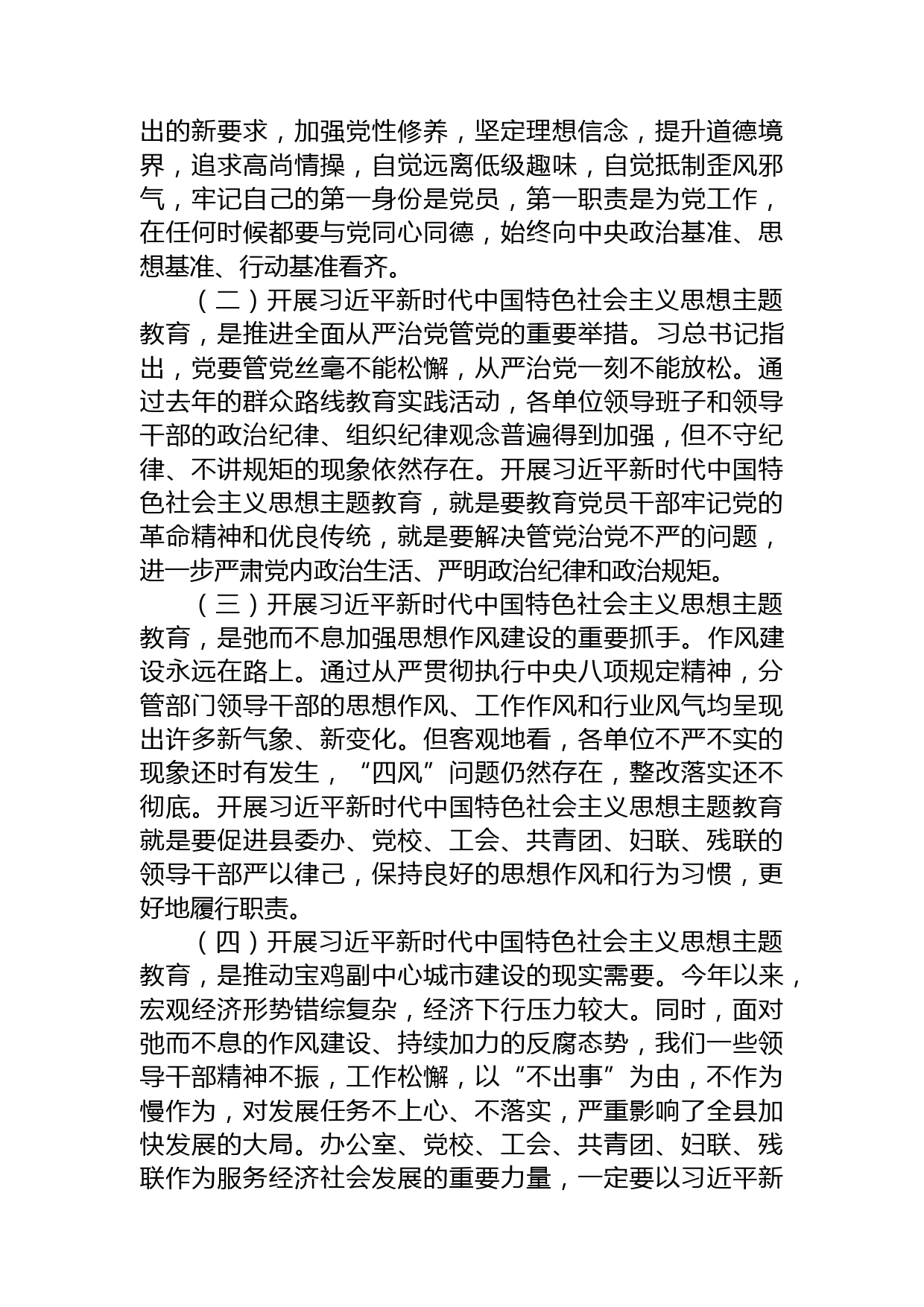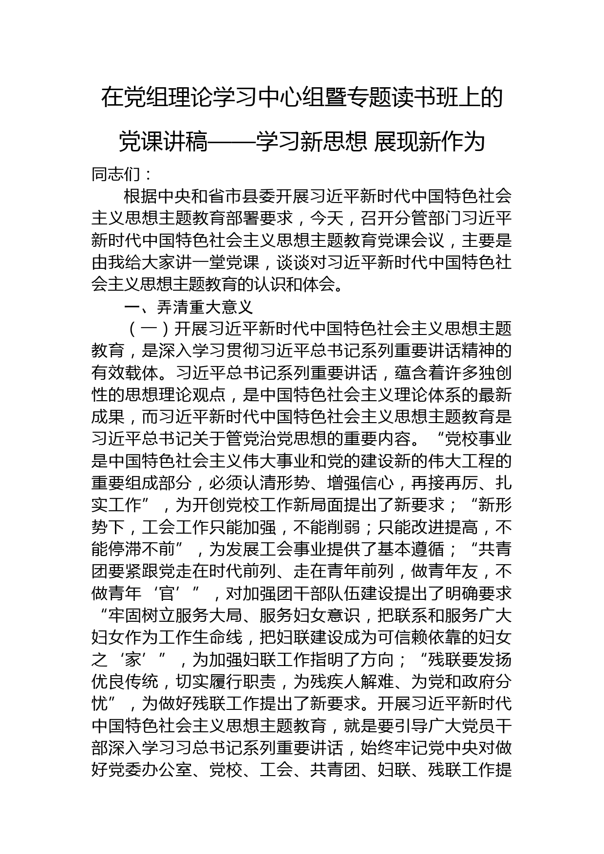 在黨組理論學(xué)習(xí)中心組暨專(zhuān)題讀書(shū)班上的黨課講稿——學(xué)習(xí)新思想展現(xiàn)新作為同志們:根據(jù)中央和省市縣委開(kāi)展習(xí)近平新時(shí)代中國(guó)特色社會(huì)主義思想主題教育部署要求,今天,召開(kāi)分管部門(mén)習(xí)近平新時(shí)代中國(guó)特色社會(huì)主義思想主題教育黨課會(huì)議,主要是由我給大家講一堂黨課,談?wù)剬?duì)習(xí)近平新時(shí)代中國(guó)特色社會(huì)主義思想主題教育的認(rèn)識(shí)和體會(huì)。一、弄清重大意義(一)開(kāi)展習(xí)近平新時(shí)代中國(guó)特色社會(huì)主義思想主題教育,是深入學(xué)習(xí)貫徹習(xí)近平總書(shū)記系列重要講話(huà)精神的有效載體。習(xí)近平總書(shū)記系列重要講話(huà),蘊(yùn)含著許多獨(dú)創(chuàng)性的思想理論觀點(diǎn),是中國(guó)特色社會(huì)主義理論體系的最新成果,而習(xí)近平...