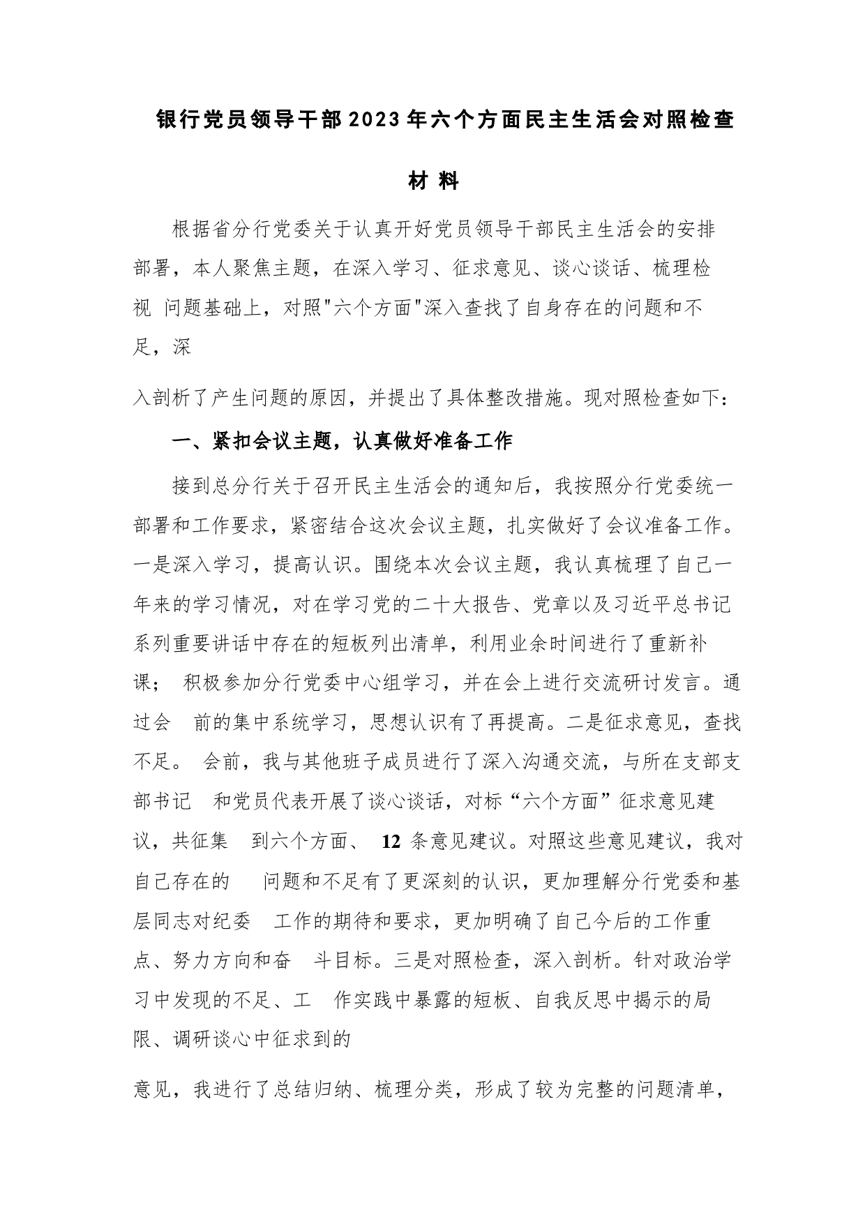 銀行黨員領(lǐng)導(dǎo)干部2023年六個方面民主生活會對照檢查材料根據(jù)省分行黨委關(guān)于認(rèn)真開好黨員領(lǐng)導(dǎo)干部民主生活會的安排部署,本人聚焦主題,在深入學(xué)習(xí)、征求意見、談心談話、梳理檢視問題基礎(chǔ)上,對照"六個方面"深入查找了自身存在的問題和不足,深入剖析了產(chǎn)生問題的原因,并提出了具體整改措施?,F(xiàn)對照檢查如下:一、緊扣會議主題,認(rèn)真做好準(zhǔn)備工作接到總分行關(guān)于召開民主生活會的通知后,我按照分行黨委統(tǒng)一部署和工作要求,緊密結(jié)合這次會議主題,扎實做好了會議準(zhǔn)備工作。一是深入學(xué)習(xí),提高認(rèn)識。圍繞本次會議主題,我認(rèn)真梳理了自己一年來的學(xué)習(xí)情況,對在學(xué)習(xí)黨的二...