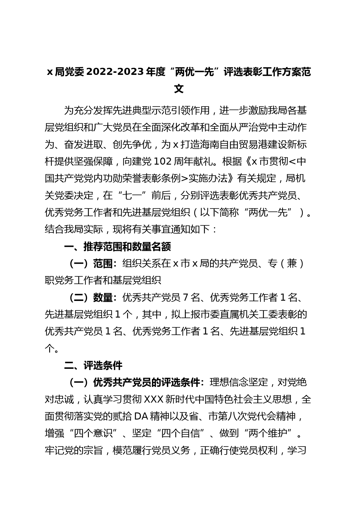x局黨委2022-2023年度“兩優(yōu)一先”評(píng)選表彰工作方案范文為充分發(fā)揮先進(jìn)典型示范引領(lǐng)作用,進(jìn)一步激勵(lì)我局各基層黨組織和廣大黨員在全面深化改革和全面從嚴(yán)治黨中主動(dòng)作為、奮發(fā)進(jìn)取、創(chuàng)先爭(zhēng)優(yōu),為x打造海南自由貿(mào)易港建設(shè)新標(biāo)桿提供堅(jiān)強(qiáng)保障,向建黨102周年獻(xiàn)禮。根據(jù)《x市貫徹<中國(guó)共產(chǎn)黨黨內(nèi)功勛榮譽(yù)表彰條例>實(shí)施辦法》有關(guān)規(guī)定,局機(jī)關(guān)黨委決定,在“七一”前后,分別評(píng)選表彰優(yōu)秀共產(chǎn)黨員、優(yōu)秀黨務(wù)工作者和先進(jìn)基層黨組織(以下簡(jiǎn)稱(chēng)“兩優(yōu)一先”)。結(jié)合我局實(shí)際,現(xiàn)將有關(guān)事宜通知如下:一、推薦范圍和數(shù)量名額(一)范圍:組織關(guān)系在x市x局的共產(chǎn)黨員、專(zhuān)(兼)...