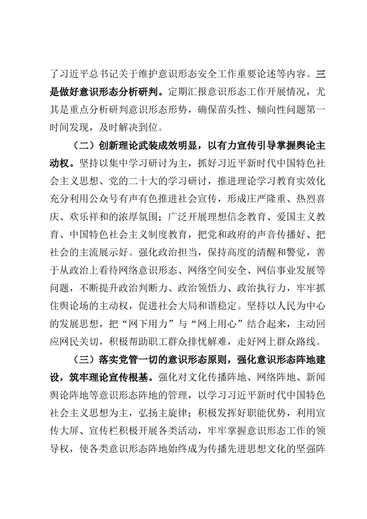 關(guān)于2023年第二季度意識(shí)形態(tài)工作分析研判報(bào)告意識(shí)形態(tài)工作是黨的一項(xiàng)極端重要的工作,事關(guān)黨的前途命運(yùn),事關(guān)國(guó)家長(zhǎng)治久安,事關(guān)民族凝聚力和向心力。今年以來(lái),縣總工會(huì)黨組堅(jiān)持以習(xí)近平新時(shí)代中國(guó)特色社會(huì)主義思想為指導(dǎo)認(rèn)真貫徹落實(shí)黨中央關(guān)于意識(shí)形態(tài)工作的決策部署和省市縣委工作要求,牢牢把握正確政治方向,夯實(shí)主體責(zé)任、強(qiáng)化思想引領(lǐng)用好宣傳陣地、突出輿論推動(dòng)和精神激勵(lì)作用,意識(shí)形態(tài)領(lǐng)域工作方向明、思路清、措施實(shí),總體平穩(wěn)良好,主思潮積極向上,主旋律亢進(jìn)響亮,正能量強(qiáng)勁有力,牢牢掌握了意識(shí)形態(tài)工作的領(lǐng)導(dǎo)權(quán)、主動(dòng)權(quán)、管理權(quán)和話語(yǔ)權(quán)。為推動(dòng)工會(huì)各...
