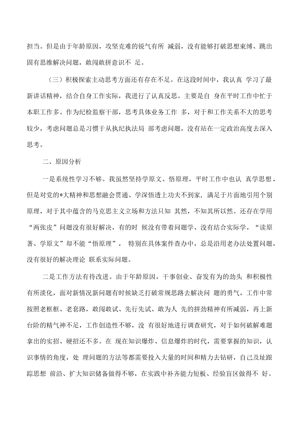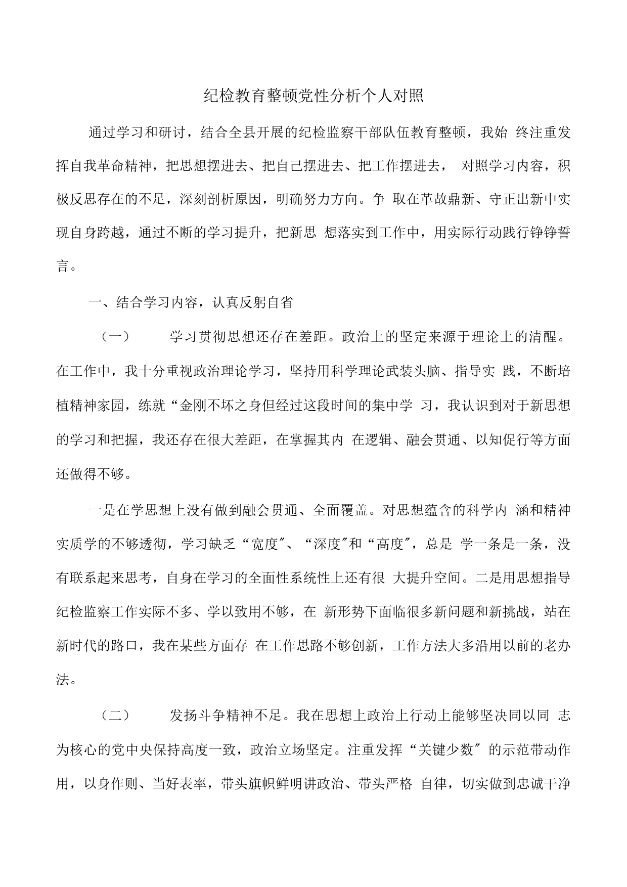 紀(jì)檢教育整頓黨性分析個人對照通過學(xué)習(xí)和研討,結(jié)合全縣開展的紀(jì)檢監(jiān)察干部隊伍教育整頓,我始終注重發(fā)揮自我革命精神,把思想擺進(jìn)去、把自己擺進(jìn)去、把工作擺進(jìn)去,對照學(xué)習(xí)內(nèi)容,積極反思存在的不足,深刻剖析原因,明確努力方向。爭取在革故鼎新、守正出新中實現(xiàn)自身跨越,通過不斷的學(xué)習(xí)提升,把新思想落實到工作中,用實際行動踐行錚錚誓言。一、結(jié)合學(xué)習(xí)內(nèi)容,認(rèn)真反躬自省(一)學(xué)習(xí)貫徹思想還存在差距。政治上的堅定來源于理論上的清醒。在工作中,我十分重視政治理論學(xué)習(xí),堅持用科學(xué)理論武裝頭腦、指導(dǎo)實踐,不斷培植精神家園,練就“金剛不壞之身但經(jīng)過這段時...