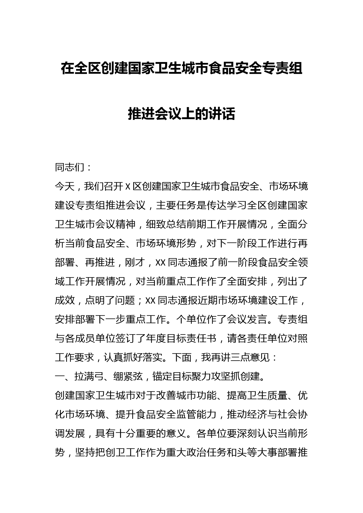 在全區(qū)創(chuàng)建國家衛(wèi)生城市食品安全專責組推進會議上的講話同志們:今天,我們召開X區(qū)創(chuàng)建國家衛(wèi)生城市食品安全、市場環(huán)境建設(shè)專責組推進會議,主要任務(wù)是傳達學習全區(qū)創(chuàng)建國家衛(wèi)生城市會議精神,細致總結(jié)前期工作開展情況,全面分析當前食品安全、市場環(huán)境形勢,對下一階段工作進行再部署、再推進,剛才,XX同志通報了前一階段食品安全領(lǐng)域工作開展情況,對當前重點工作作了全面安排,列出了成效,點明了問題;XX同志通報近期市場環(huán)境建設(shè)工作,安排部署下一步重點工作。個單位作了會議發(fā)言。專責組與各成員單位簽訂了年度目標責任書,請各責任單位對照工作要求,認真抓好...