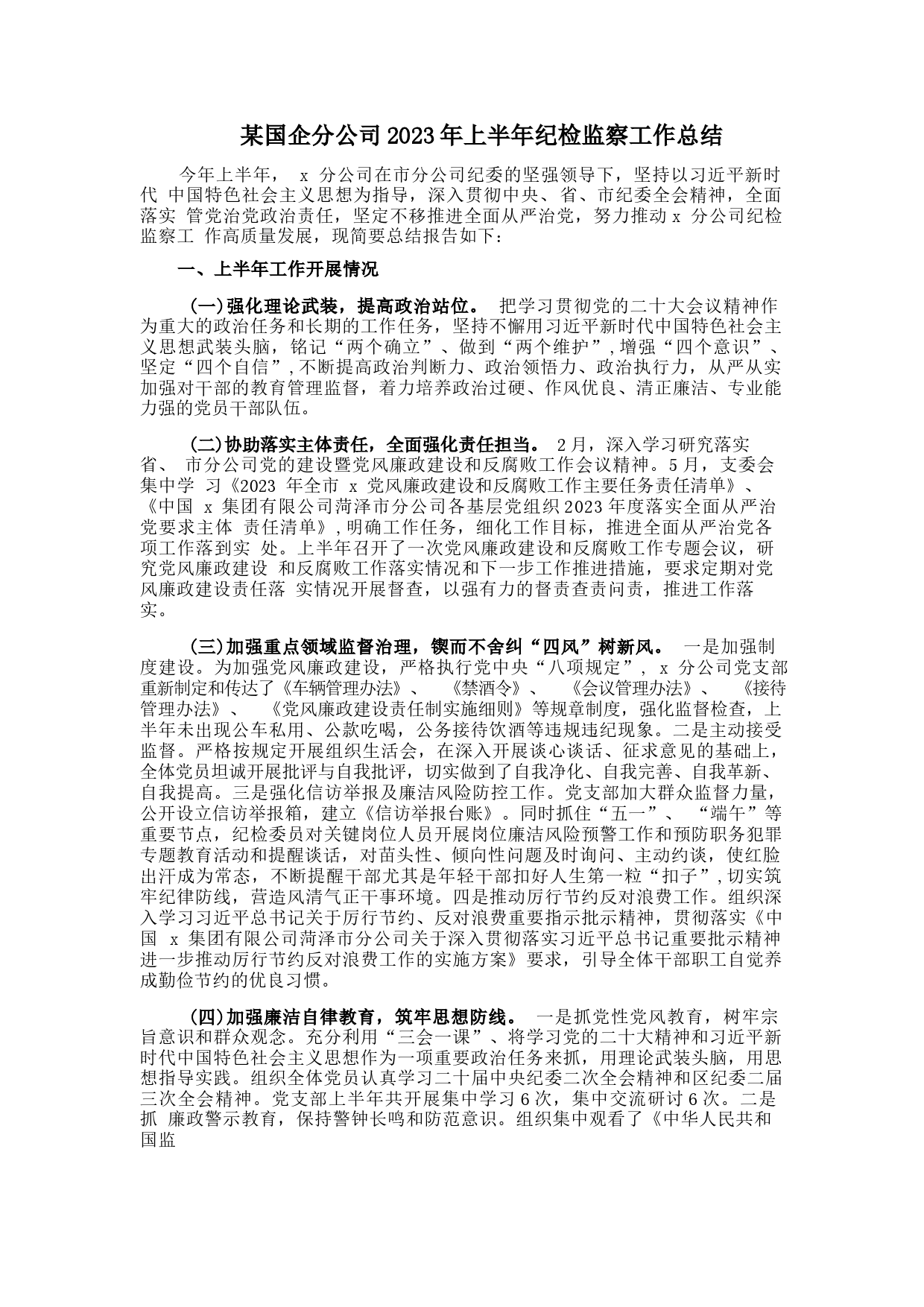 某國企分公司2023年上半年紀檢監(jiān)察工作總結(jié)今年上半年,x分公司在市分公司紀委的堅強領(lǐng)導下,堅持以習近平新時代中國特色社會主義思想為指導,深入貫徹中央、省、市紀委全會精神,全面落實管黨治黨政治責任,堅定不移推進全面從嚴治黨,努力推動x分公司紀檢監(jiān)察工作高質(zhì)量發(fā)展,現(xiàn)簡要總結(jié)報告如下:一、上半年工作開展情況(一)強化理論武裝,提高政治站位。把學習貫徹黨的二十大會議精神作為重大的政治任務和長期的工作任務,堅持不懈用習近平新時代中國特色社會主義思想武裝頭腦,銘記“兩個確立”、做到“兩個維護”,增強“四個意識”、堅定“四個自信”,不斷提高政治...
