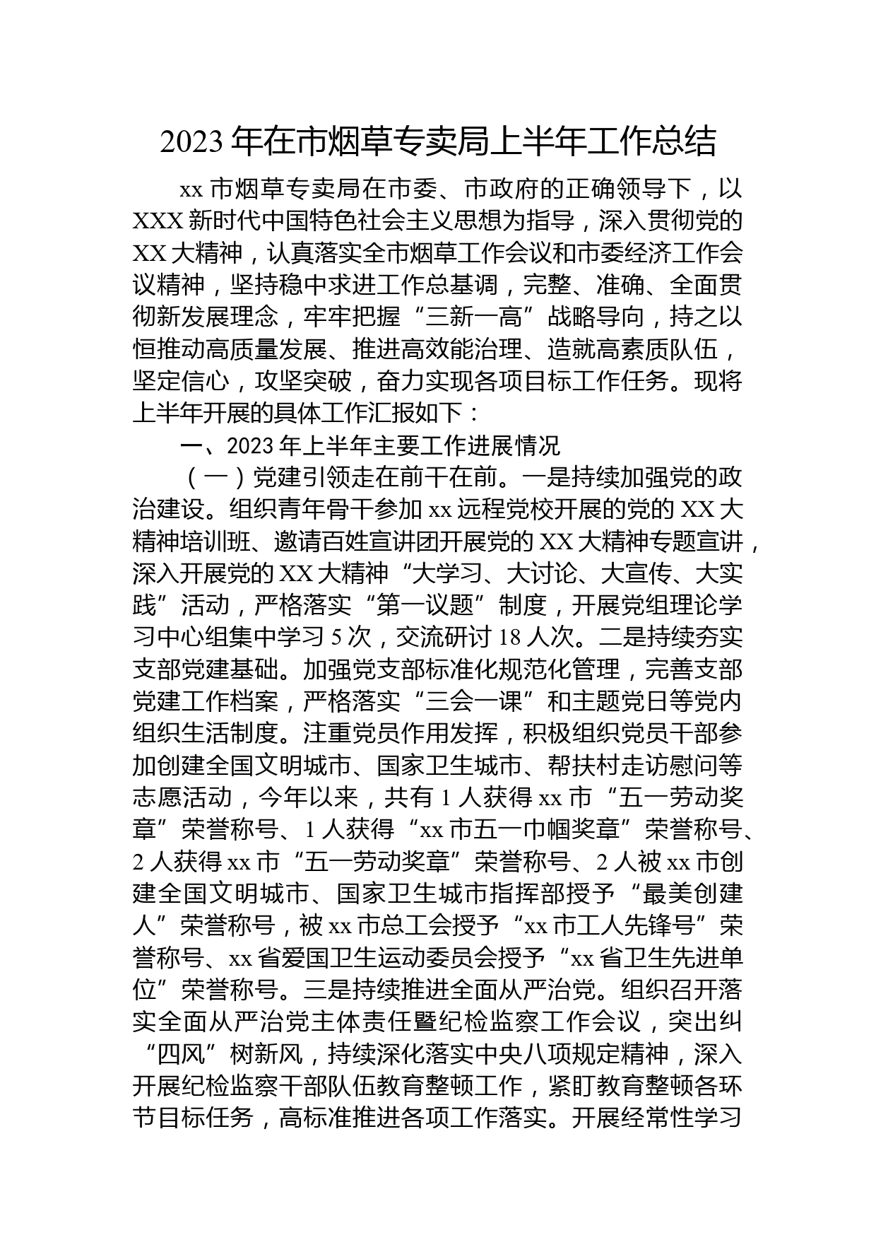 2023年在市煙草專賣局上半年工作總結xx市煙草專賣局在市委、市政府的正確領導下,以XXX新時代中國特色社會主義思想為指導,深入貫徹黨的XX大精神,認真落實全市煙草工作會議和市委經濟工作會議精神,堅持穩(wěn)中求進工作總基調,完整、準確、全面貫徹新發(fā)展理念,牢牢把握“三新一高”戰(zhàn)略導向,持之以恒推動高質量發(fā)展、推進高效能治理、造就高素質隊伍,堅定信心,攻堅突破,奮力實現(xiàn)各項目標工作任務。現(xiàn)將上半年開展的具體工作匯報如下:一、2023年上半年主要工作進展情況(一)黨建引領走在前干在前。一是持續(xù)加強黨的政治建設。組織青年骨干參加xx遠程黨校開展的黨的X...