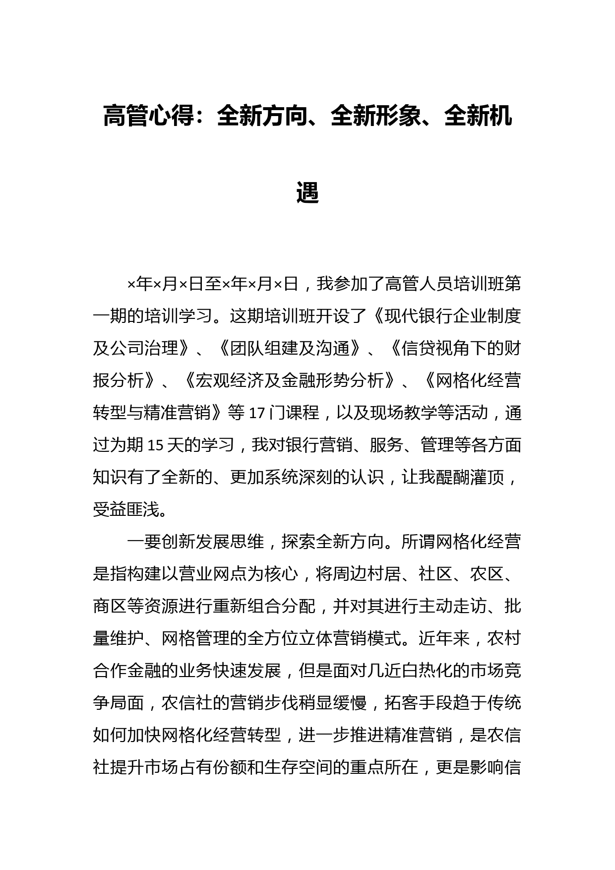 高管心得:全新方向、全新形象、全新機(jī)遇×年×月×日至×年×月×日,我參加了高管人員培訓(xùn)班第一期的培訓(xùn)學(xué)習(xí)。這期培訓(xùn)班開設(shè)了《現(xiàn)代銀行企業(yè)制度及公司治理》、《團(tuán)隊(duì)組建及溝通》、《信貸視角下的財(cái)報(bào)分析》、《宏觀經(jīng)濟(jì)及金融形勢分析》、《網(wǎng)格化經(jīng)營轉(zhuǎn)型與精準(zhǔn)營銷》等17門課程,以及現(xiàn)場教學(xué)等活動,通過為期15天的學(xué)習(xí),我對銀行營銷、服務(wù)、管理等各方面知識有了全新的、更加系統(tǒng)深刻的認(rèn)識,讓我醍醐灌頂,受益匪淺。一要創(chuàng)新發(fā)展思維,探索全新方向。所謂網(wǎng)格化經(jīng)營是指構(gòu)建以營業(yè)網(wǎng)點(diǎn)為核心,將周邊村居、社區(qū)、農(nóng)區(qū)、商區(qū)等資源進(jìn)行重新組合分配,并對其...