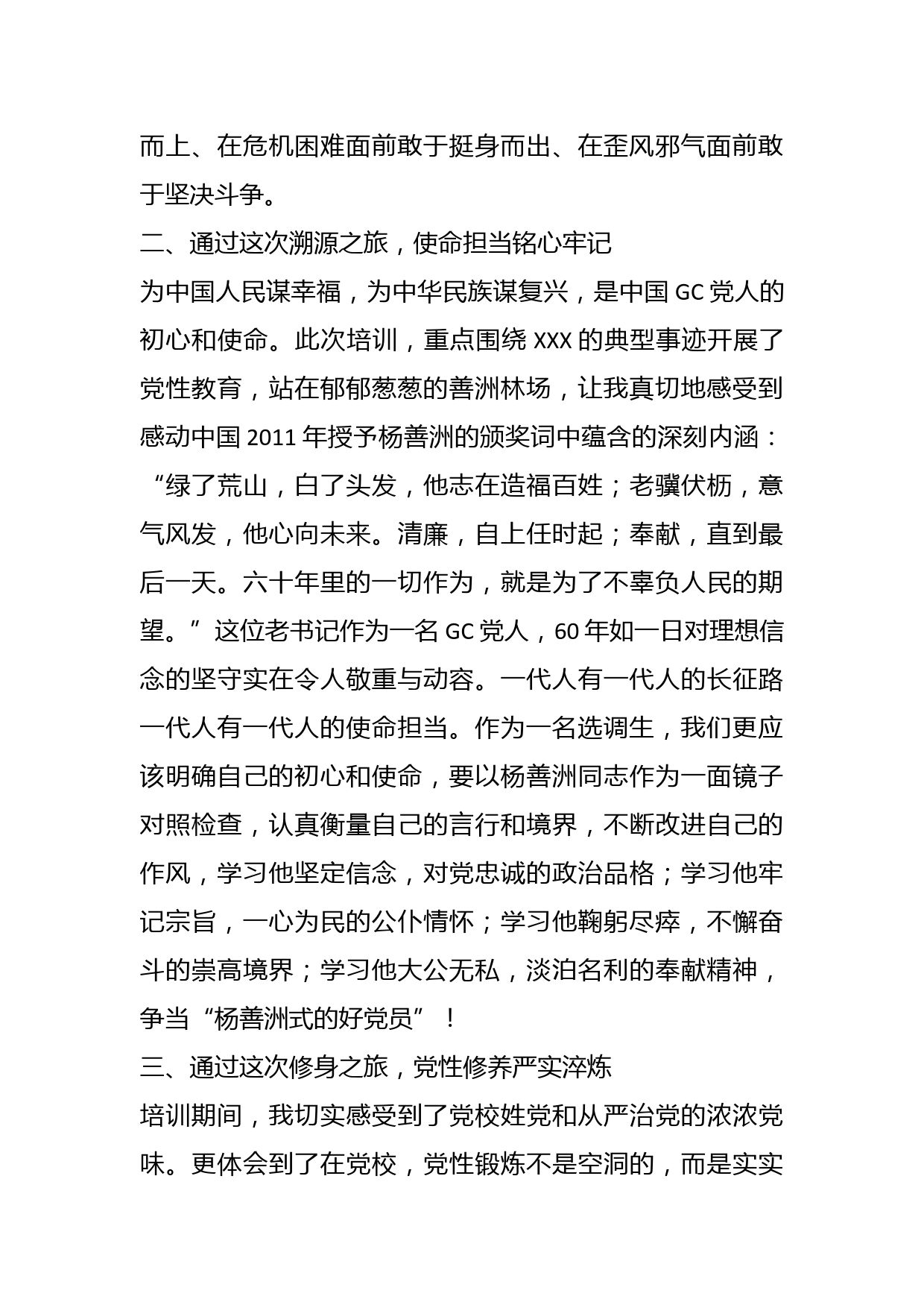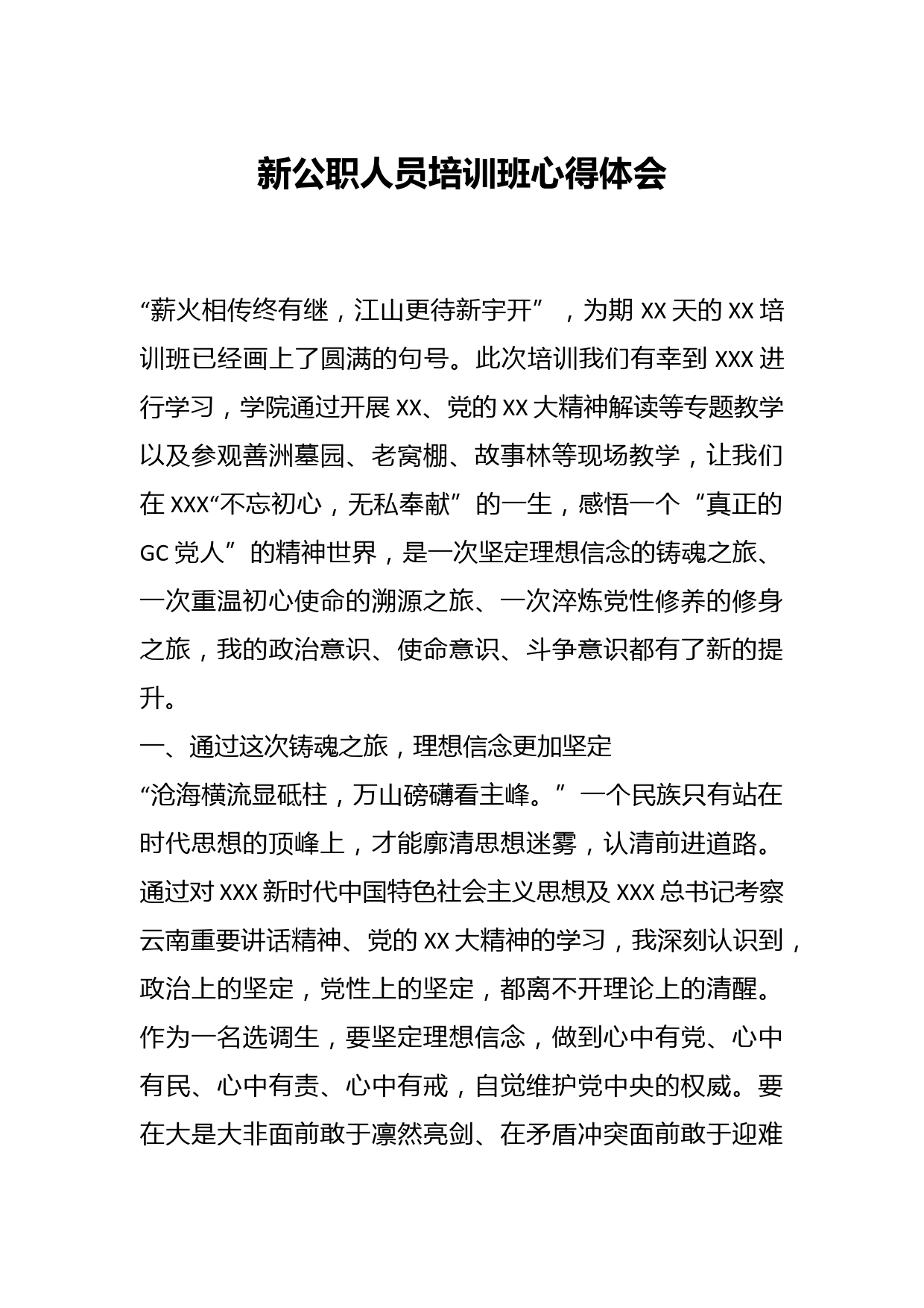 新公職人員培訓(xùn)班心得體會(huì)“薪火相傳終有繼,江山更待新宇開”,為期XX天的XX培訓(xùn)班已經(jīng)畫上了圓滿的句號(hào)。此次培訓(xùn)我們有幸到XXX進(jìn)行學(xué)習(xí),學(xué)院通過(guò)開展XX、黨的XX大精神解讀等專題教學(xué)以及參觀善洲墓園、老窩棚、故事林等現(xiàn)場(chǎng)教學(xué),讓我們?cè)赬XX“不忘初心,無(wú)私奉獻(xiàn)”的一生,感悟一個(gè)“真正的GC黨人”的精神世界,是一次堅(jiān)定理想信念的鑄魂之旅、一次重溫初心使命的溯源之旅、一次淬煉黨性修養(yǎng)的修身之旅,我的政治意識(shí)、使命意識(shí)、斗爭(zhēng)意識(shí)都有了新的提升。一、通過(guò)這次鑄魂之旅,理想信念更加堅(jiān)定“滄海橫流顯砥柱,萬(wàn)山磅礴看主峰。”一個(gè)民族只有站在時(shí)代思想的頂...