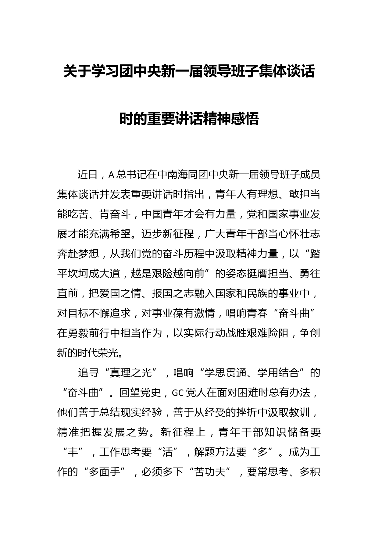 關(guān)于學(xué)習(xí)團中央新一屆領(lǐng)導(dǎo)班子集體談話時的重要講話精神感悟VIP免費