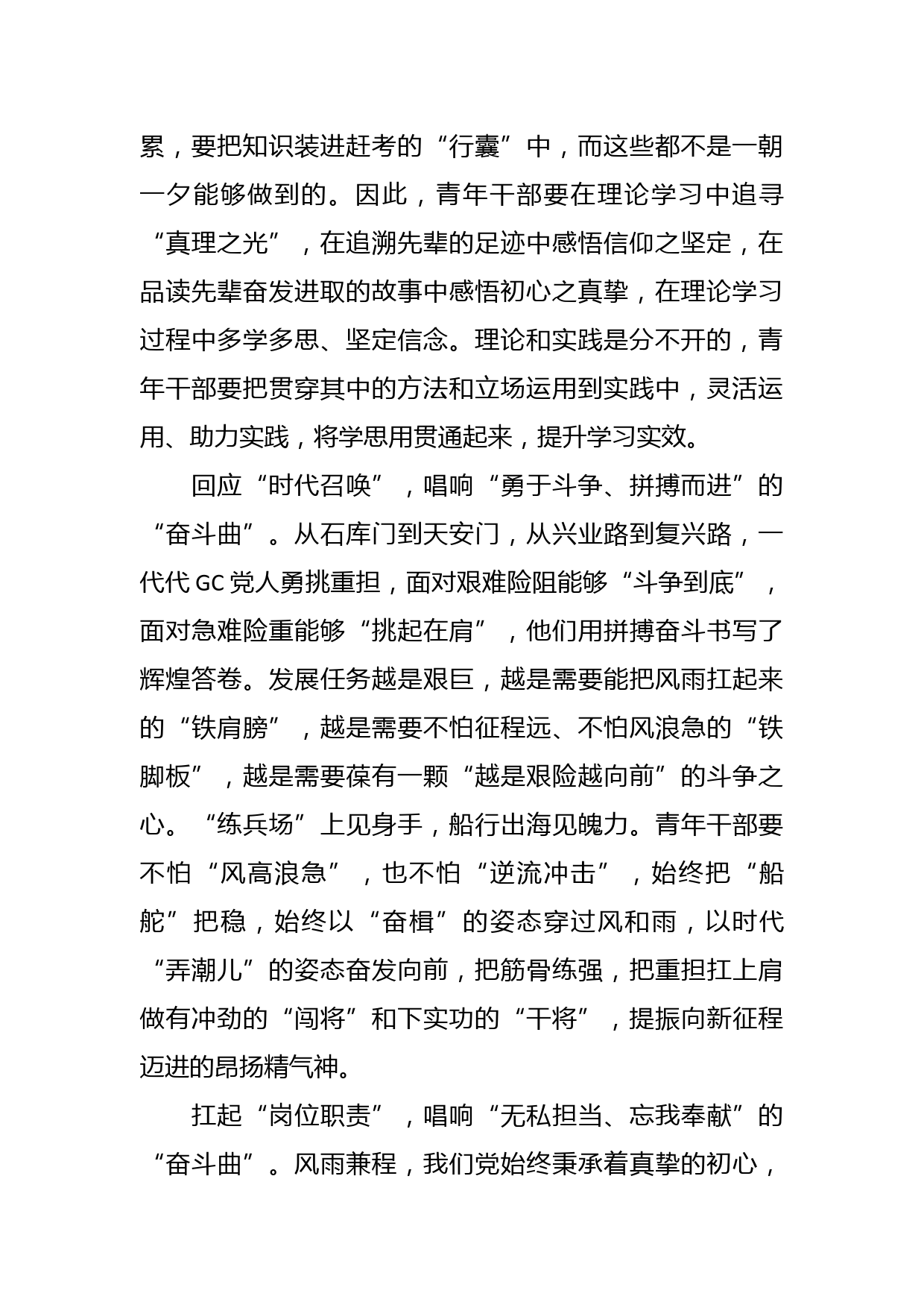 關(guān)于學(xué)習(xí)團中央新一屆領(lǐng)導(dǎo)班子集體談話時的重要講話精神感悟近日,A總書記在中南海同團中央新一屆領(lǐng)導(dǎo)班子成員集體談話并發(fā)表重要講話時指出,青年人有理想、敢擔(dān)當(dāng)能吃苦、肯奮斗,中國青年才會有力量,黨和國家事業(yè)發(fā)展才能充滿希望。邁步新征程,廣大青年干部當(dāng)心懷壯志奔赴夢想,從我們黨的奮斗歷程中汲取精神力量,以“踏平坎坷成大道,越是艱險越向前”的姿態(tài)挺膺擔(dān)當(dāng)、勇往直前,把愛國之情、報國之志融入國家和民族的事業(yè)中,對目標(biāo)不懈追求,對事業(yè)葆有激情,唱響青春“奮斗曲”在勇毅前行中擔(dān)當(dāng)作為,以實際行動戰(zhàn)勝艱難險阻,爭創(chuàng)新的時代榮光。追尋“真理之...