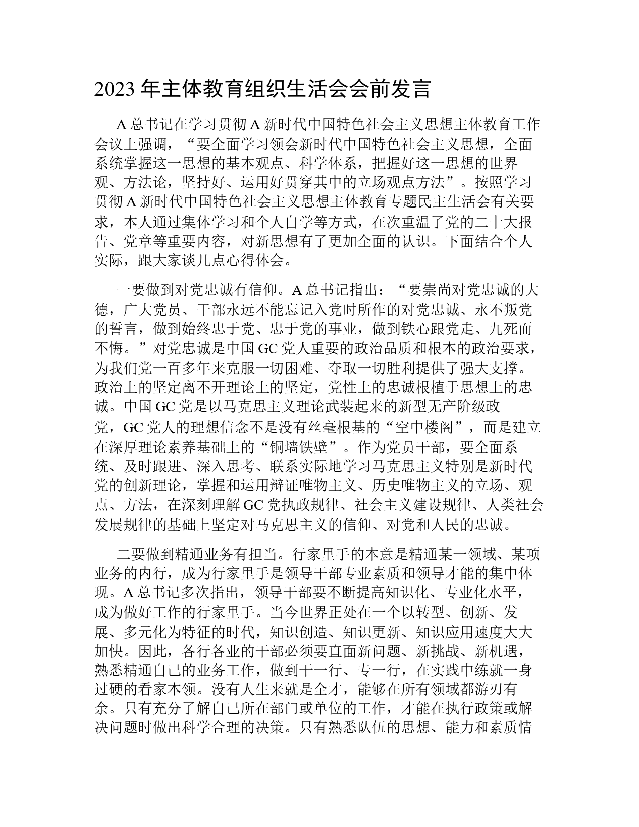 2023年主體教育組織生活會(huì)會(huì)前發(fā)言A總書記在學(xué)習(xí)貫徹A新時(shí)代中國(guó)特色社會(huì)主義思想主體教育工作會(huì)議上強(qiáng)調(diào),“要全面學(xué)習(xí)領(lǐng)會(huì)新時(shí)代中國(guó)特色社會(huì)主義思想,全面系統(tǒng)掌握這一思想的基本觀點(diǎn)、科學(xué)體系,把握好這一思想的世界觀、方法論,堅(jiān)持好、運(yùn)用好貫穿其中的立場(chǎng)觀點(diǎn)方法”。按照學(xué)習(xí)貫徹A新時(shí)代中國(guó)特色社會(huì)主義思想主體教育專題民主生活會(huì)有關(guān)要求,本人通過(guò)集體學(xué)習(xí)和個(gè)人自學(xué)等方式,在次重溫了黨的二十大報(bào)告、黨章等重要內(nèi)容,對(duì)新思想有了更加全面的認(rèn)識(shí)。下面結(jié)合個(gè)人實(shí)際,跟大家談幾點(diǎn)心得體會(huì)。一要做到對(duì)黨忠誠(chéng)有信仰。A總書記指出:“要崇尚對(duì)黨忠誠(chéng)的大...