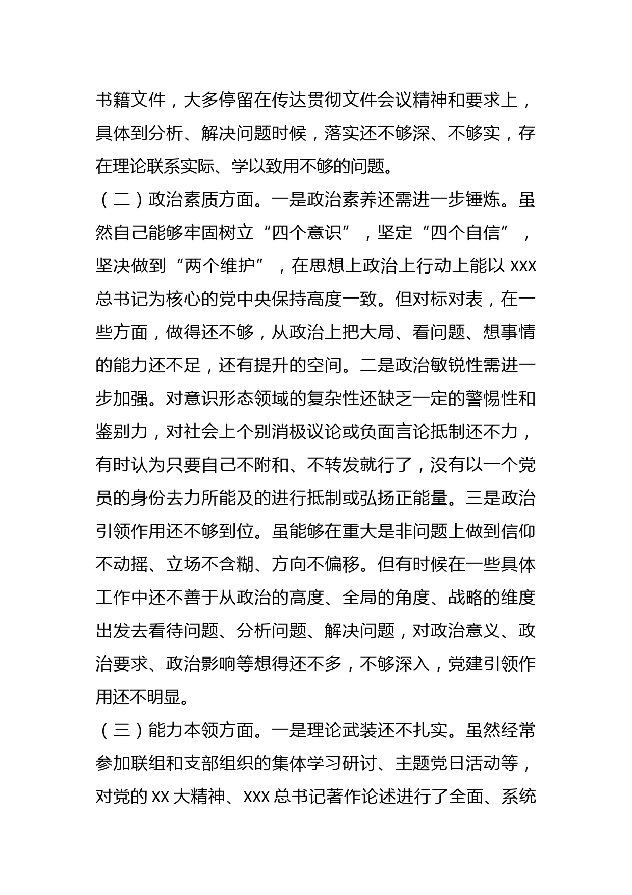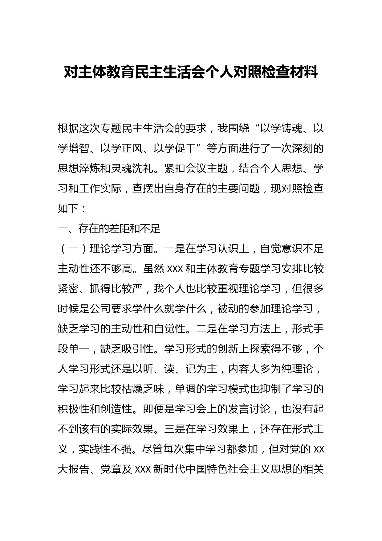 對(duì)主體教育民主生活會(huì)個(gè)人對(duì)照檢查材料根據(jù)這次專題民主生活會(huì)的要求,我圍繞“以學(xué)鑄魂、以學(xué)增智、以學(xué)正風(fēng)、以學(xué)促干”等方面進(jìn)行了一次深刻的思想淬煉和靈魂洗禮。緊扣會(huì)議主題,結(jié)合個(gè)人思想、學(xué)習(xí)和工作實(shí)際,查擺出自身存在的主要問題,現(xiàn)對(duì)照檢查如下:一、存在的差距和不足(一)理論學(xué)習(xí)方面。一是在學(xué)習(xí)認(rèn)識(shí)上,自覺意識(shí)不足主動(dòng)性還不夠高。雖然XXX和主體教育專題學(xué)習(xí)安排比較緊密、抓得比較嚴(yán),我個(gè)人也比較重視理論學(xué)習(xí),但很多時(shí)候是公司要求學(xué)什么就學(xué)什么,被動(dòng)的參加理論學(xué)習(xí),缺乏學(xué)習(xí)的主動(dòng)性和自覺性。二是在學(xué)習(xí)方法上,形式手段單一,缺乏吸引性...