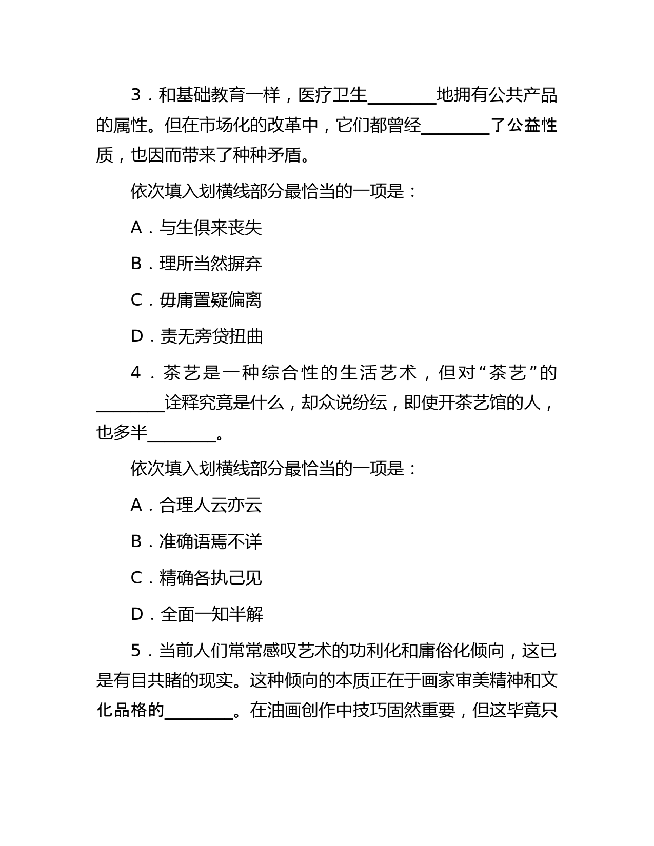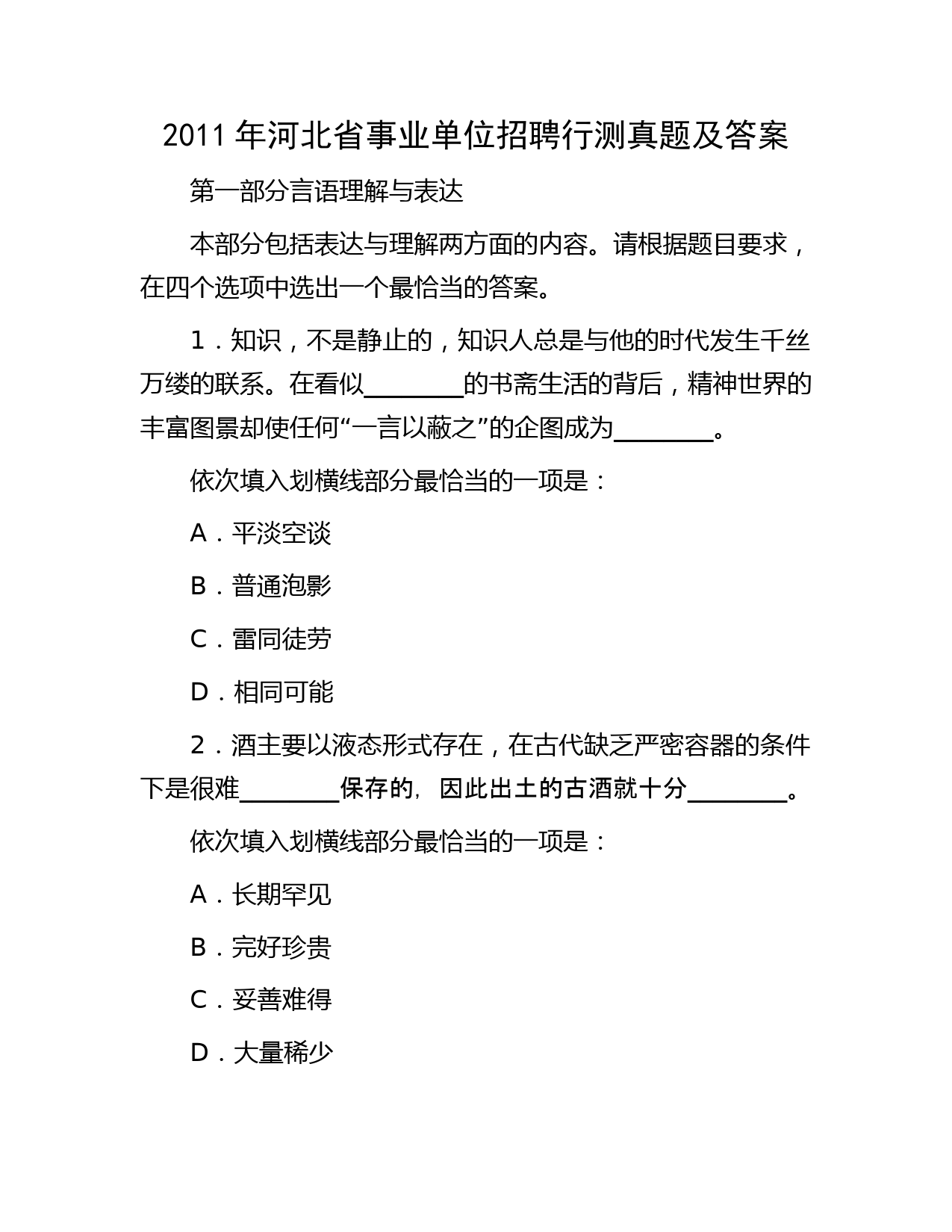 2011年河北省事業(yè)單位招聘行測(cè)真題及答案第一部分言語(yǔ)理解與表達(dá)本部分包括表達(dá)與理解兩方面的內(nèi)容。請(qǐng)根據(jù)題目要求,在四個(gè)選項(xiàng)中選出一個(gè)最恰當(dāng)?shù)拇鸢浮?.知識(shí),不是靜止的,知識(shí)人總是與他的時(shí)代發(fā)生千絲萬(wàn)縷的聯(lián)系。在看似________的書(shū)齋生活的背后,精神世界的豐富圖景卻使任何“一言以蔽之”的企圖成為_(kāi)_______。依次填入劃?rùn)M線部分最恰當(dāng)?shù)囊豁?xiàng)是:A.平淡空談B.普通泡影C.雷同徒勞D.相同可能2.酒主要以液態(tài)形式存在,在古代缺乏嚴(yán)密容器的條件下是很難________保存的,因此出土的古酒就十分________。依次填入劃?rùn)M線部分最恰當(dāng)?shù)囊豁?xiàng)是:A.長(zhǎng)期罕見(jiàn)B.完好...