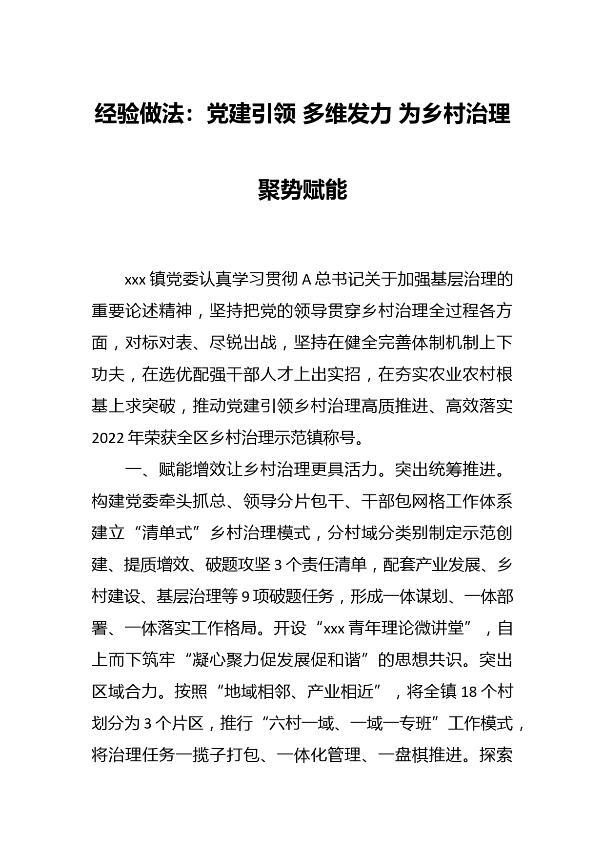 經(jīng)驗做法:黨建引領多維發(fā)力為鄉(xiāng)村治理聚勢賦能xxx鎮(zhèn)黨委認真學習貫徹A總書記關(guān)于加強基層治理的重要論述精神,堅持把黨的領導貫穿鄉(xiāng)村治理全過程各方面,對標對表、盡銳出戰(zhàn),堅持在健全完善體制機制上下功夫,在選優(yōu)配強干部人才上出實招,在夯實農(nóng)業(yè)農(nóng)村根基上求突破,推動黨建引領鄉(xiāng)村治理高質(zhì)推進、高效落實2022年榮獲全區(qū)鄉(xiāng)村治理示范鎮(zhèn)稱號。一、賦能增效讓鄉(xiāng)村治理更具活力。突出統(tǒng)籌推進。構(gòu)建黨委牽頭抓總、領導分片包干、干部包網(wǎng)格工作體系建立“清單式”鄉(xiāng)村治理模式,分村域分類別制定示范創(chuàng)建、提質(zhì)增效、破題攻堅3個責任清單,配套產(chǎn)業(yè)發(fā)展、鄉(xiāng)村建設、...