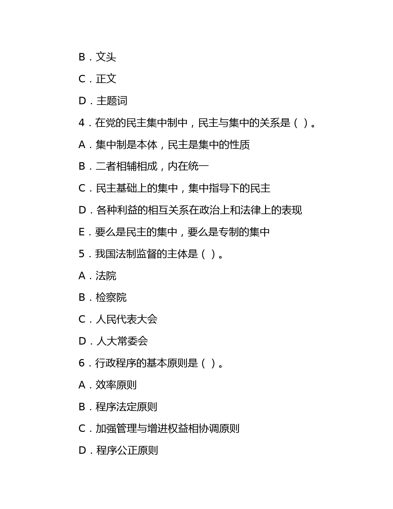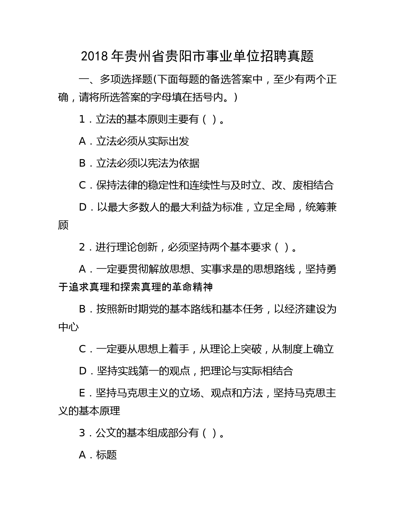 2018年貴州省貴陽市事業(yè)單位招聘真題一、多項選擇題(下面每題的備選答案中,至少有兩個正確,請將所選答案的字母填在括號內。)1.立法的基本原則主要有()。A.立法必須從實際出發(fā)B.立法必須以憲法為依據C.保持法律的穩(wěn)定性和連續(xù)性與及時立、改、廢相結合D.以最大多數人的最大利益為標準,立足全局,統(tǒng)籌兼顧2.進行理論創(chuàng)新,必須堅持兩個基本要求()。A.一定要貫徹解放思想、實事求是的思想路線,堅持勇于追求真理和探索真理的革命精神B.按照新時期黨的基本路線和基本任務,以經濟建設為中心C.一定要從思想上著手,從理論上突破,從制度上確立D.堅持實踐第一...