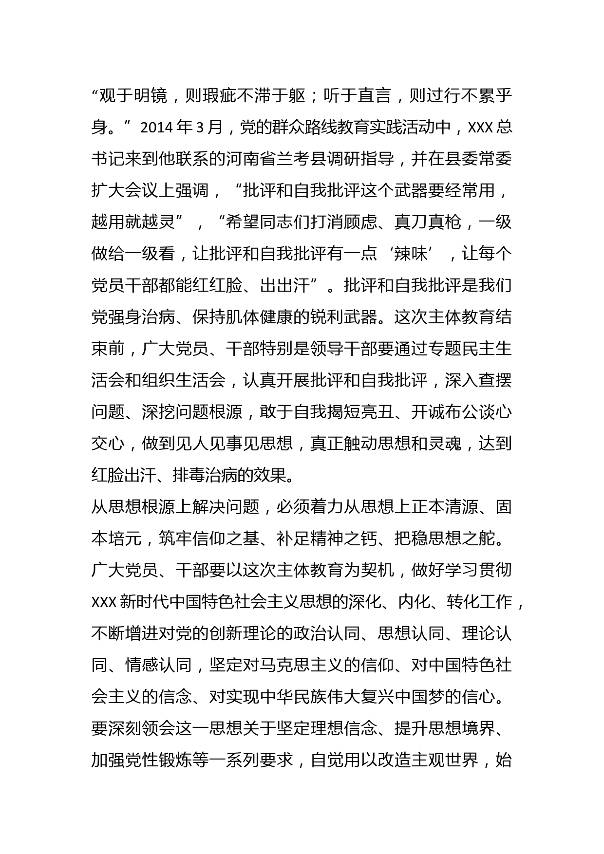 學習“抓好檢視整改”專題會議心得體會:著力從思想根源上解決問題在學習貫徹XXX新時代中國特色社會主義思想主體教育工作會議上,XXX總書記明確把“抓好檢視整改”作為這次主體教育的一項重點措施,同時強調(diào)“黨員、干部特別是領(lǐng)導干部要把自己擺進去、把職責擺進去、把工作擺進去,對照檢視出來的問題進行黨性分析,認真開展批評和自我批評,做到見人見事見思想,著力從思想根源上解決問題”。XXX總書記指出:“黨內(nèi)存在的一些突出問題,從根源上說都是思想上的問題?!彼枷胧切袆拥南葘АS檬裁礃拥乃枷胛溲b頭腦,就會有什么樣的行動;如果思想上蒙塵,行動就可能跑偏...
