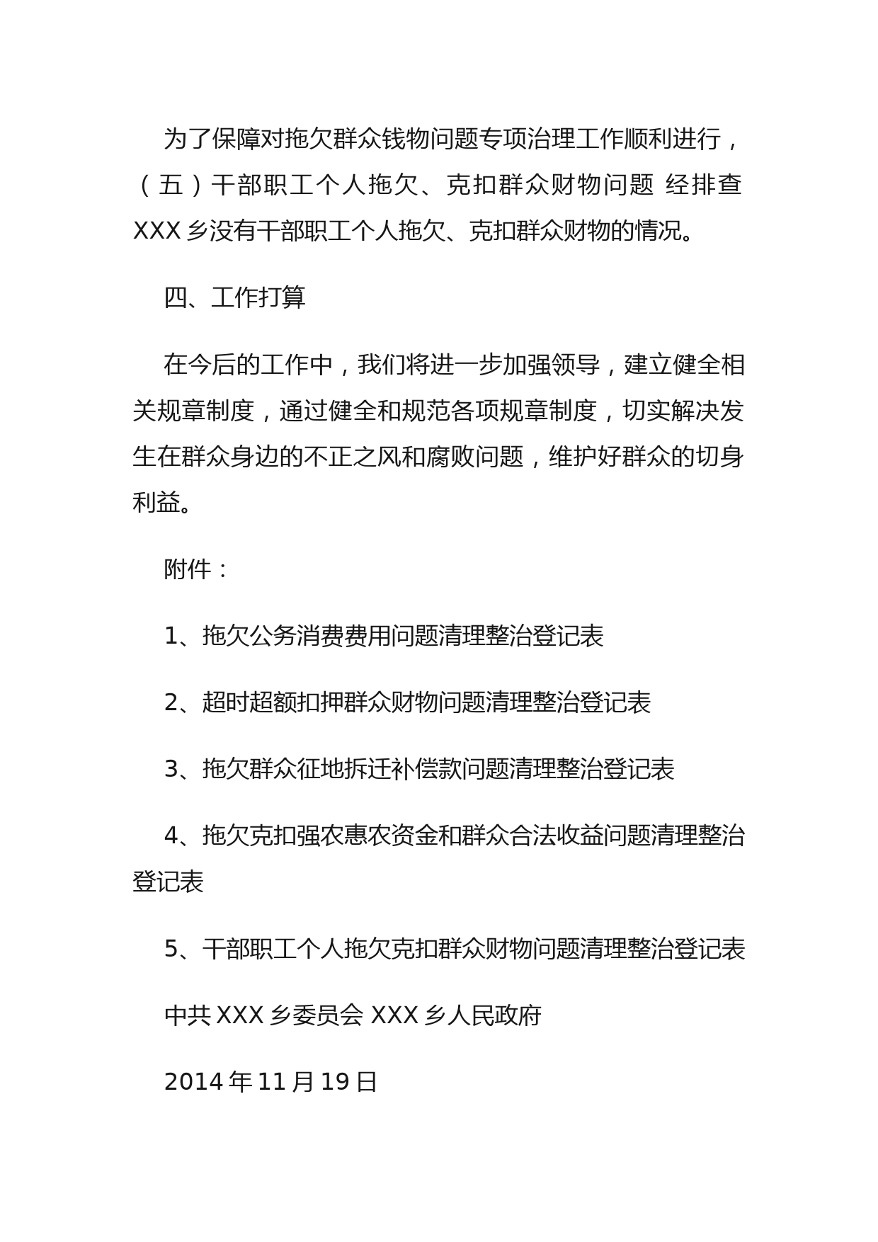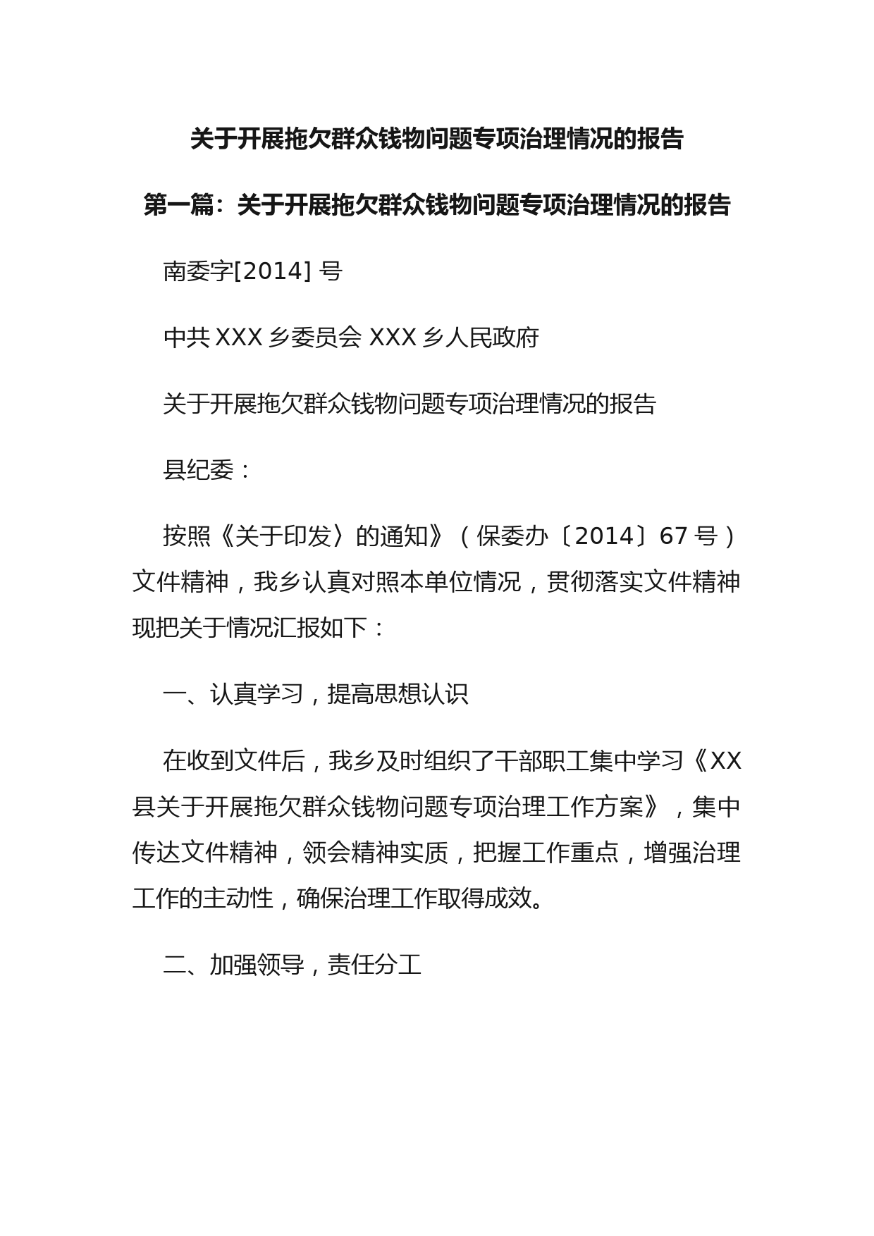 關(guān)于開展拖欠群眾錢物問題專項(xiàng)治理情況的報(bào)告第一篇:關(guān)于開展拖欠群眾錢物問題專項(xiàng)治理情況的報(bào)告南委字[2014]號(hào)中共XXX鄉(xiāng)委員會(huì)XXX鄉(xiāng)人民政府關(guān)于開展拖欠群眾錢物問題專項(xiàng)治理情況的報(bào)告縣紀(jì)委:按照《關(guān)于印發(fā)〉的通知》(保委辦〔2014〕67號(hào))文件精神,我鄉(xiāng)認(rèn)真對(duì)照本單位情況,貫徹落實(shí)文件精神現(xiàn)把關(guān)于情況匯報(bào)如下:一、認(rèn)真學(xué)習(xí),提高思想認(rèn)識(shí)在收到文件后,我鄉(xiāng)及時(shí)組織了干部職工集中學(xué)習(xí)《XX縣關(guān)于開展拖欠群眾錢物問題專項(xiàng)治理工作方案》,集中傳達(dá)文件精神,領(lǐng)會(huì)精神實(shí)質(zhì),把握工作重點(diǎn),增強(qiáng)治理工作的主動(dòng)性,確保治理工作取得成效。二、加強(qiáng)領(lǐng)導(dǎo),責(zé)任...