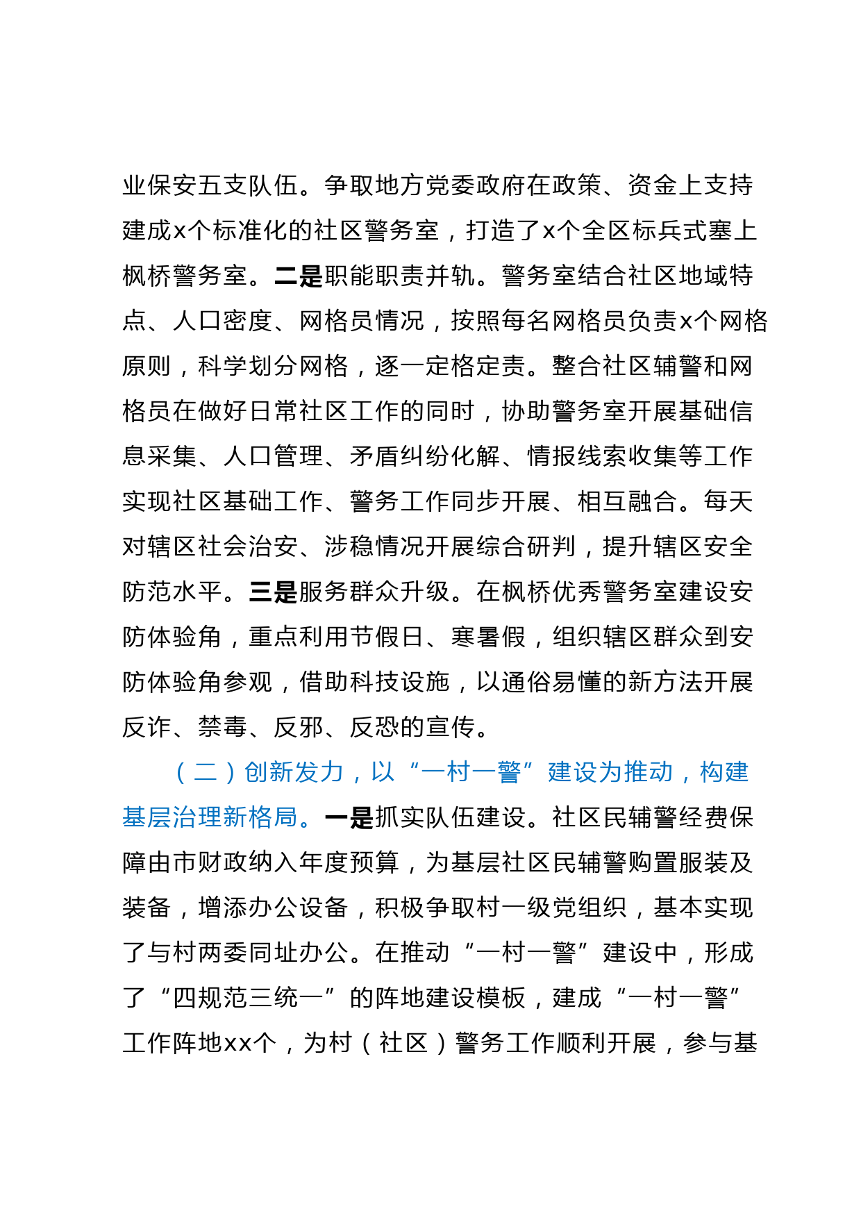 公安約稿推動社會治安防控體系建設(shè)高質(zhì)量發(fā)展(調(diào)研報告)黨的XX大報告指出“強化社會治安整體防控,推進掃黑除惡常態(tài)化,依法嚴懲群眾反映強烈的各類違法犯罪活動”。強化社會治安整體防控,首先面臨的就是加強社會治安防控體系建設(shè),這不僅是打防違法犯罪活動、提升公共安全指數(shù)的根本舉措,也是提高群眾社會治安滿意率、實現(xiàn)經(jīng)濟社會健康發(fā)展的重要保障。如何建立集打防管控于一體、網(wǎng)上網(wǎng)下全覆蓋的現(xiàn)代化立體化社會治安防控體系,是深化平安建設(shè)、構(gòu)建和諧社會的重要內(nèi)容,也是公安機關(guān)面臨的一項重大課題?,F(xiàn)結(jié)合我市公安工作實際,談幾點認識。一、近年來xxx公安...