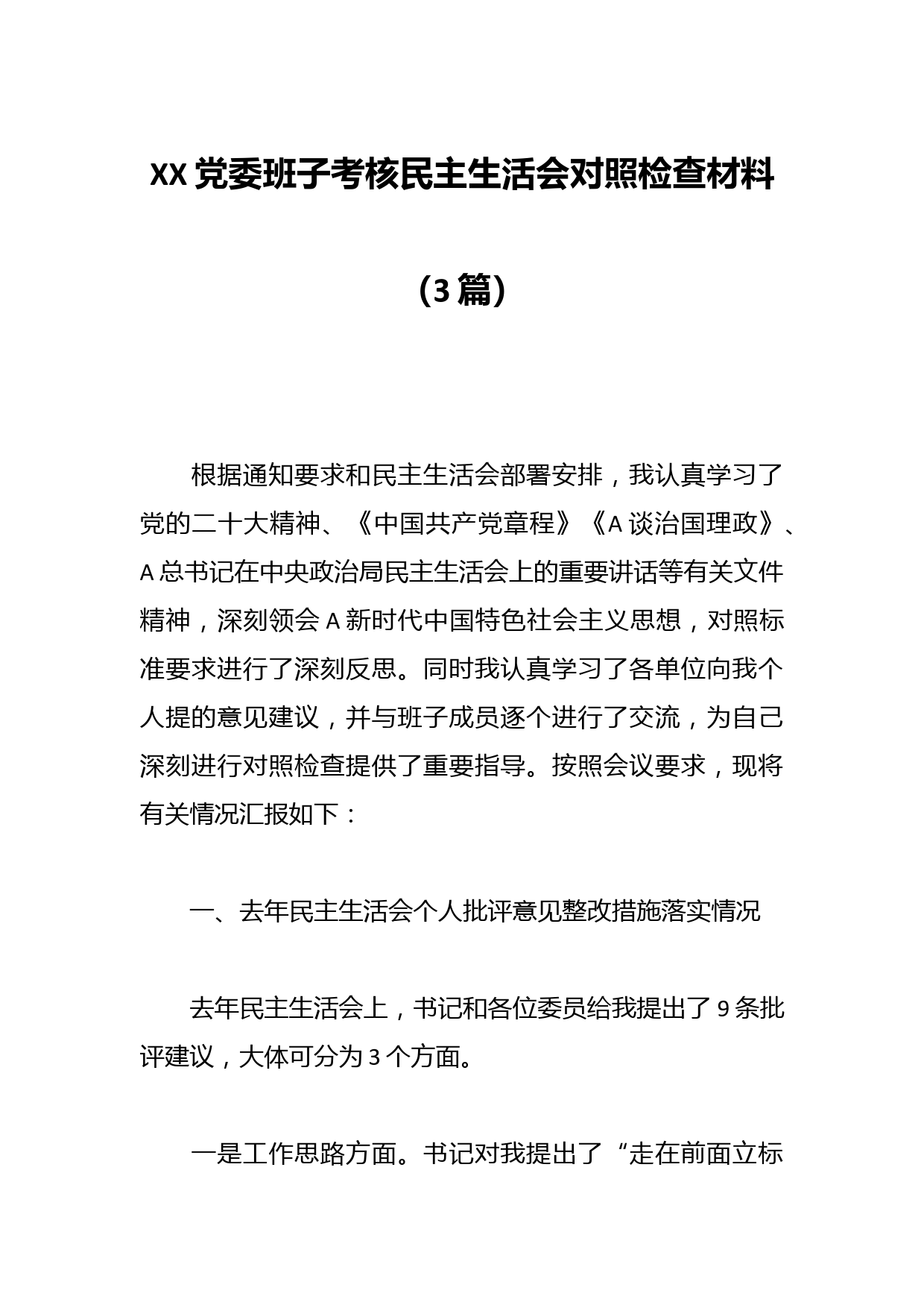 XX黨委班子考核民主生活會(huì)對(duì)照檢查材料(3篇)根據(jù)通知要求和民主生活會(huì)部署安排,我認(rèn)真學(xué)習(xí)了黨的二十大精神、《中國共產(chǎn)黨章程》《A談治國理政》、A總書記在中央政治局民主生活會(huì)上的重要講話等有關(guān)文件精神,深刻領(lǐng)會(huì)A新時(shí)代中國特色社會(huì)主義思想,對(duì)照標(biāo)準(zhǔn)要求進(jìn)行了深刻反思。同時(shí)我認(rèn)真學(xué)習(xí)了各單位向我個(gè)人提的意見建議,并與班子成員逐個(gè)進(jìn)行了交流,為自己深刻進(jìn)行對(duì)照檢查提供了重要指導(dǎo)。按照會(huì)議要求,現(xiàn)將有關(guān)情況匯報(bào)如下:一、去年民主生活會(huì)個(gè)人批評(píng)意見整改措施落實(shí)情況去年民主生活會(huì)上,書記和各位委員給我提出了9條批評(píng)建議,大體可分為3個(gè)方面。一...