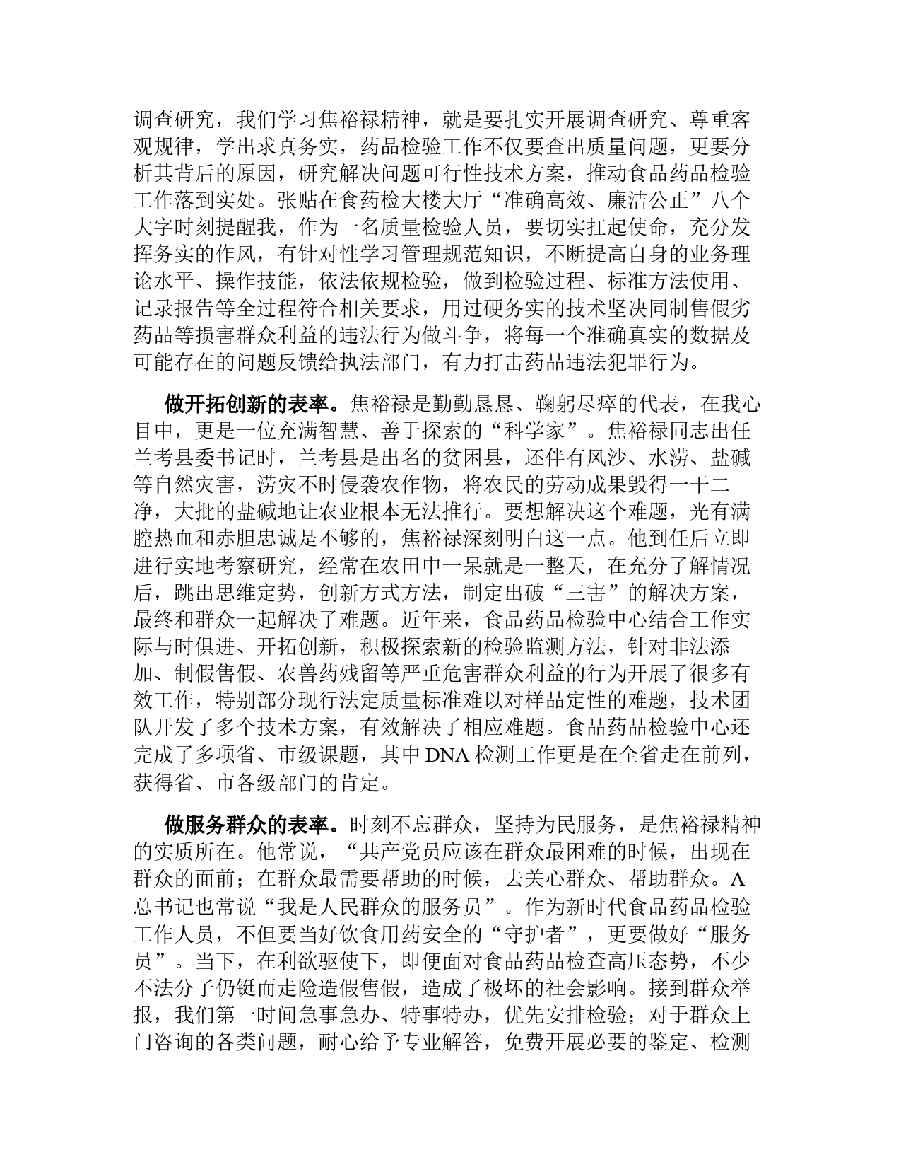 研討發(fā)言:學(xué)習(xí)焦裕祿精神爭當(dāng)五個表率“魂飛萬里,盼歸來,此山此水此地”,每當(dāng)我重溫A總書記《念奴嬌·追思焦裕祿》這首詞的時候,焦裕祿同志的那把舊藤椅就展現(xiàn)在我的眼前。依然清晰記得30年前小學(xué)四年級時觀看《焦裕祿》電影的場景,10歲懵懂少年在那一刻熱淚盈眶,在我心里那把藤椅已不僅是一件椅子,更象征著焦裕祿同志鞠躬盡瘁、開拓進(jìn)取,堅毅執(zhí)著、為民服務(wù)的精神,影響著一代代共產(chǎn)黨人。參加工作以后,在一線從事平凡的藥品檢驗(yàn)工作,每當(dāng)我覺得疲乏厭倦,甚至彷徨失落的時候,就會看一看《焦裕祿》這部電影,焦裕祿同志崇高的精神,總讓我感受到這份平凡的...