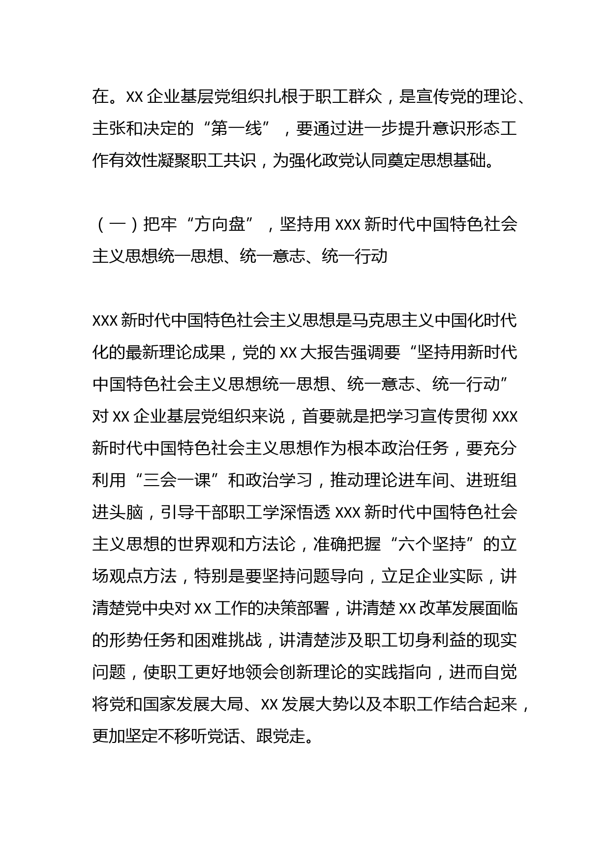XX企業(yè)基層黨組織工作心得體會(huì)黨的XX大報(bào)告對“增強(qiáng)黨組織政治功能和組織功能”作出新的全面部署,特別強(qiáng)調(diào)要“堅(jiān)持大抓基層的鮮明導(dǎo)向,把基層黨組織建設(shè)成為有效實(shí)現(xiàn)黨的領(lǐng)導(dǎo)的堅(jiān)強(qiáng)戰(zhàn)斗堡壘?!盭X企業(yè)作為黨和國家事業(yè)發(fā)展的重要物質(zhì)基礎(chǔ)和政治基礎(chǔ),XX企業(yè)基層黨組織作為黨的組織細(xì)胞,是貫徹落實(shí)黨中央對XX工作決策部署的“最后一公里”,其工作成效直接影響廣大干部職工的政黨認(rèn)同和凝聚情況,影響黨的領(lǐng)導(dǎo)在XX企業(yè)的有效實(shí)現(xiàn)。但是,干部職工對黨的認(rèn)同不是由內(nèi)到外自發(fā)形成的,而是由外到內(nèi)加以建構(gòu)的,這為我們進(jìn)一步抓好XX企業(yè)基層黨組織工作提供了思路和方向。...