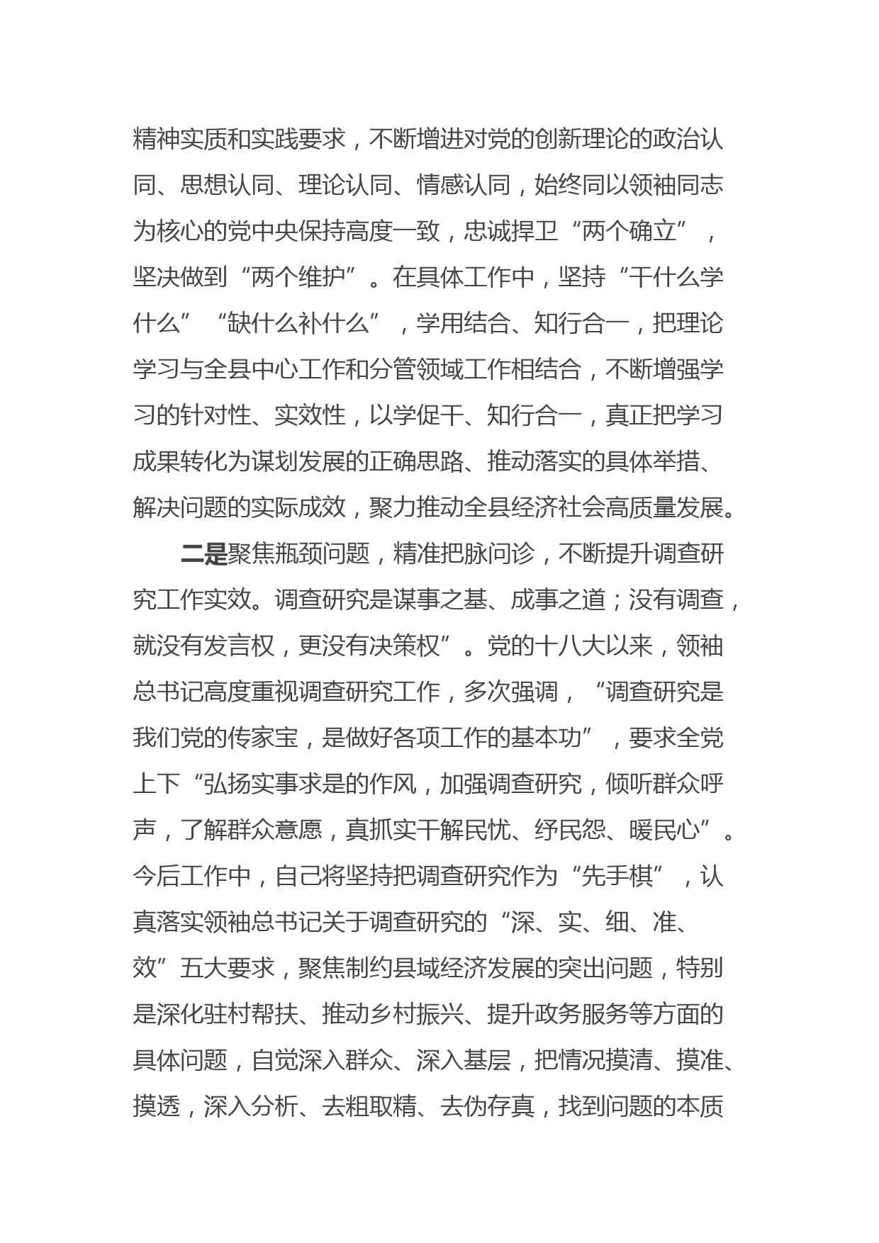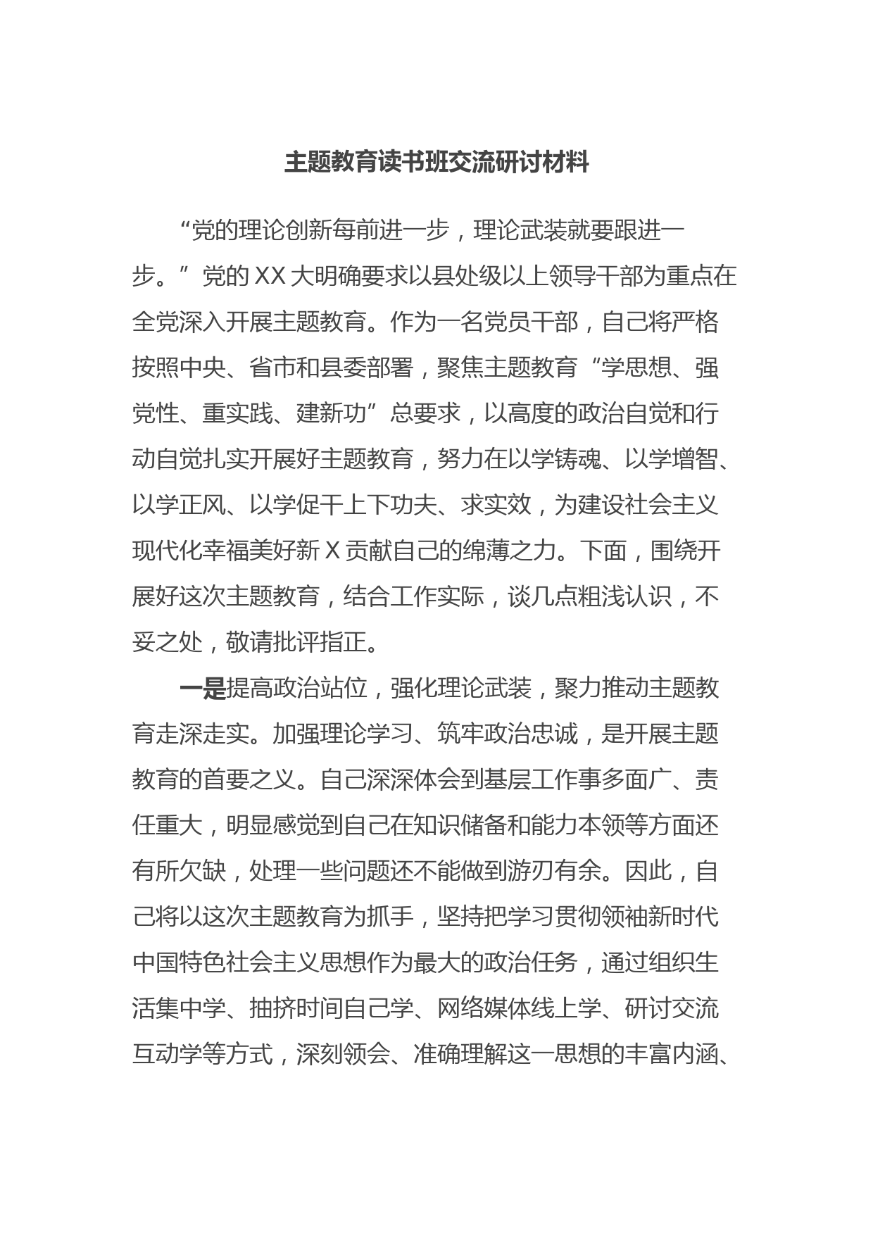 主題教育讀書班交流研討材料“黨的理論創(chuàng)新每前進(jìn)一步,理論武裝就要跟進(jìn)一步?!秉h的XX大明確要求以縣處級以上領(lǐng)導(dǎo)干部為重點(diǎn)在全黨深入開展主題教育。作為一名黨員干部,自己將嚴(yán)格按照中央、省市和縣委部署,聚焦主題教育“學(xué)思想、強(qiáng)黨性、重實(shí)踐、建新功”總要求,以高度的政治自覺和行動(dòng)自覺扎實(shí)開展好主題教育,努力在以學(xué)鑄魂、以學(xué)增智、以學(xué)正風(fēng)、以學(xué)促干上下功夫、求實(shí)效,為建設(shè)社會(huì)主義現(xiàn)代化幸福美好新X貢獻(xiàn)自己的綿薄之力。下面,圍繞開展好這次主題教育,結(jié)合工作實(shí)際,談幾點(diǎn)粗淺認(rèn)識(shí),不妥之處,敬請批評指正。一是提高政治站位,強(qiáng)化理論武裝,聚力...