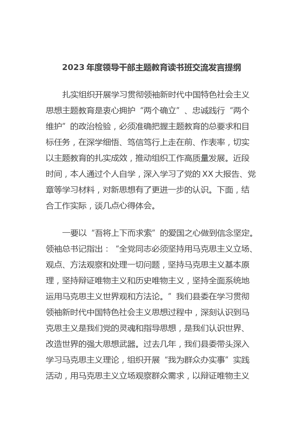 2023年度領(lǐng)導(dǎo)干部主題教育讀書班交流發(fā)言提綱扎實(shí)組織開展學(xué)習(xí)貫徹領(lǐng)袖新時代中國特色社會主義思想主題教育是衷心擁護(hù)“兩個確立”、忠誠踐行“兩個維護(hù)”的政治檢驗(yàn),必須準(zhǔn)確把握主題教育的總要求和目標(biāo)任務(wù),在深學(xué)細(xì)悟、篤信篤行上走在前、作表率,切實(shí)以主題教育的扎實(shí)成效,推動組織工作高質(zhì)量發(fā)展。近段時間,本人通過個人自學(xué),深入學(xué)習(xí)了黨的XX大報告、黨章等學(xué)習(xí)材料,對新思想有了更進(jìn)一步的認(rèn)識。下面,結(jié)合工作實(shí)際,談幾點(diǎn)心得體會。一要以“吾將上下而求索”的愛國之心做到信念堅(jiān)定。領(lǐng)袖總書記指出:“全黨同志必須堅(jiān)持用馬克思主義立場、觀點(diǎn)、方法觀察...