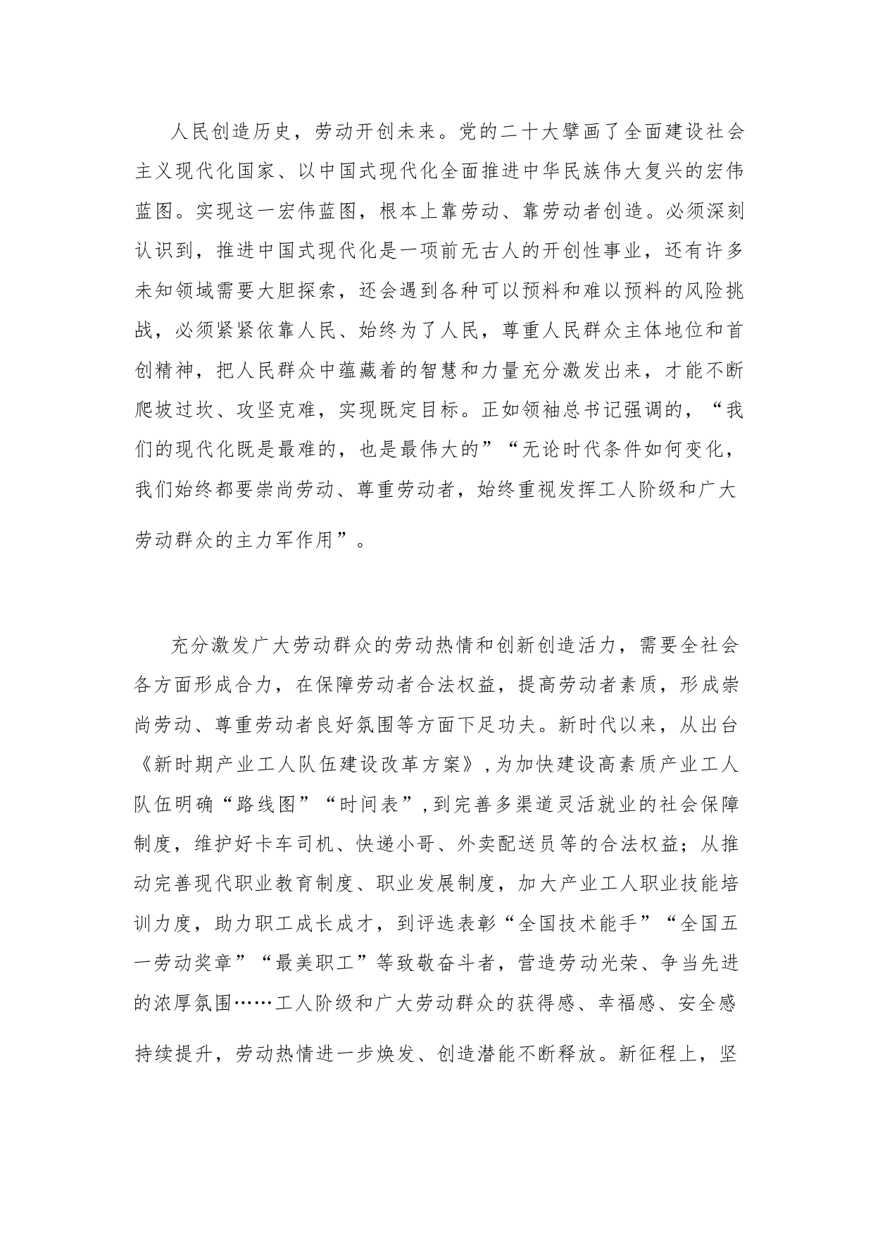 學(xué)習(xí)領(lǐng)悟同中華全國(guó)總工會(huì)新一屆領(lǐng)導(dǎo)班子成員集體談話時(shí)重要講話心得體會(huì)勞動(dòng)創(chuàng)造幸福,奮斗鑄就偉業(yè)。近日,領(lǐng)袖總書記同中華全國(guó)總工會(huì)新一屆領(lǐng)導(dǎo)班子成員集體談話并發(fā)表重要講話,指出“要圍繞貫徹新發(fā)展理念、構(gòu)建新發(fā)展格局、推動(dòng)高質(zhì)量發(fā)展,廣泛深入開展各種形式的勞動(dòng)和技能競(jìng)賽,激發(fā)廣大職工的勞動(dòng)熱情、創(chuàng)造潛能,在各行各業(yè)各個(gè)領(lǐng)域充分發(fā)揮主力軍作用”,鼓舞和激勵(lì)著億萬勞動(dòng)群眾以更加飽滿的熱情、昂揚(yáng)的姿態(tài)奮進(jìn)新征程、建功新時(shí)代。新時(shí)代是奮斗者的時(shí)代。黨的十八大以來,在以領(lǐng)袖同志為核心的黨中央堅(jiān)強(qiáng)領(lǐng)導(dǎo)下,我國(guó)工人階級(jí)在黨和國(guó)家事業(yè)發(fā)展中發(fā)揮...