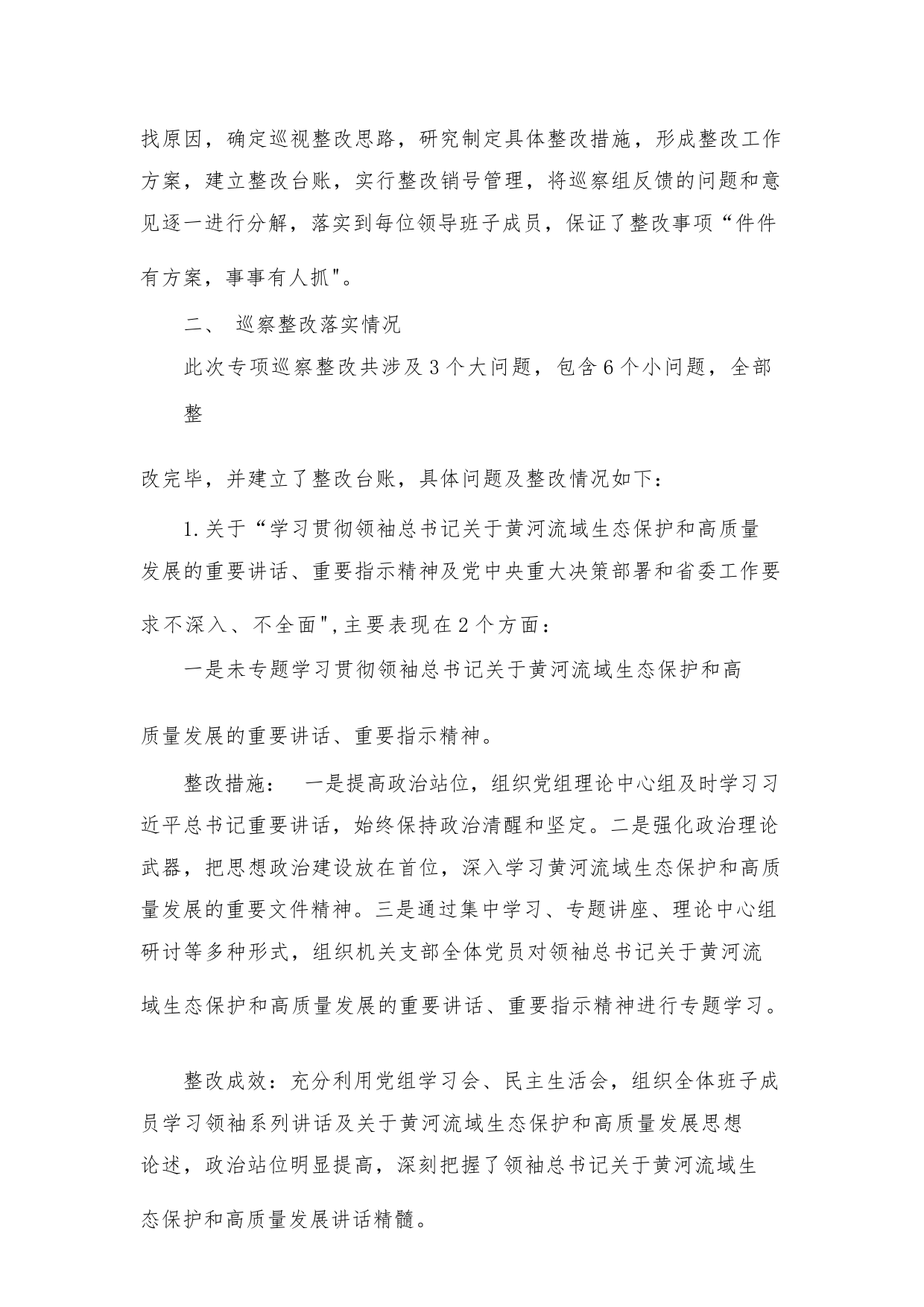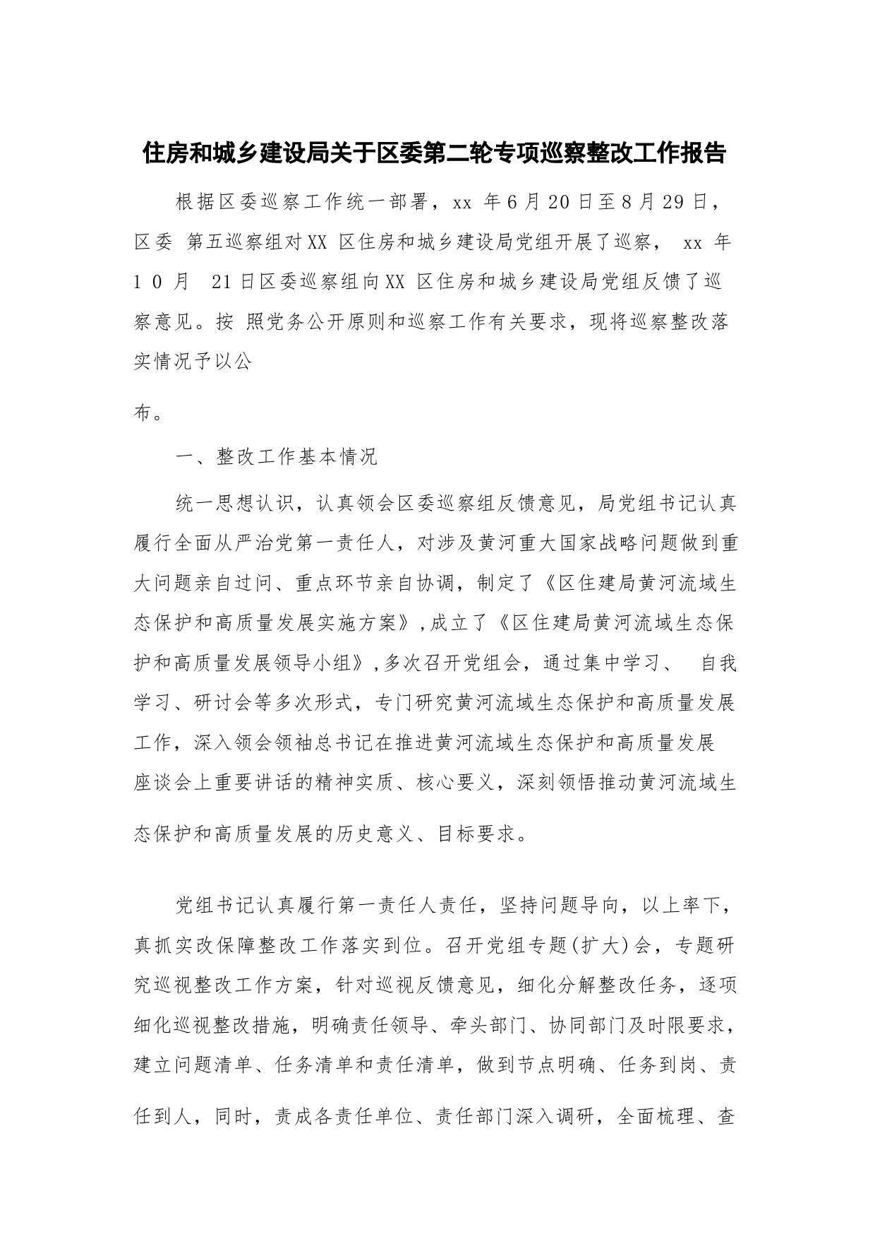 住房和城鄉(xiāng)建設(shè)局關(guān)于區(qū)委第二輪專項巡察整改工作報告根據(jù)區(qū)委巡察工作統(tǒng)一部署,xx年6月20日至8月29日,區(qū)委第五巡察組對XX區(qū)住房和城鄉(xiāng)建設(shè)局黨組開展了巡察,xx年10月21日區(qū)委巡察組向XX區(qū)住房和城鄉(xiāng)建設(shè)局黨組反饋了巡察意見。按照黨務(wù)公開原則和巡察工作有關(guān)要求,現(xiàn)將巡察整改落實情況予以公布。一、整改工作基本情況統(tǒng)一思想認(rèn)識,認(rèn)真領(lǐng)會區(qū)委巡察組反饋意見,局黨組書記認(rèn)真履行全面從嚴(yán)治黨第一責(zé)任人,對涉及黃河重大國家戰(zhàn)略問題做到重大問題親自過問、重點環(huán)節(jié)親自協(xié)調(diào),制定了《區(qū)住建局黃河流域生態(tài)保護和高質(zhì)量發(fā)展實施方案》,成立了《區(qū)住建局黃河流域...