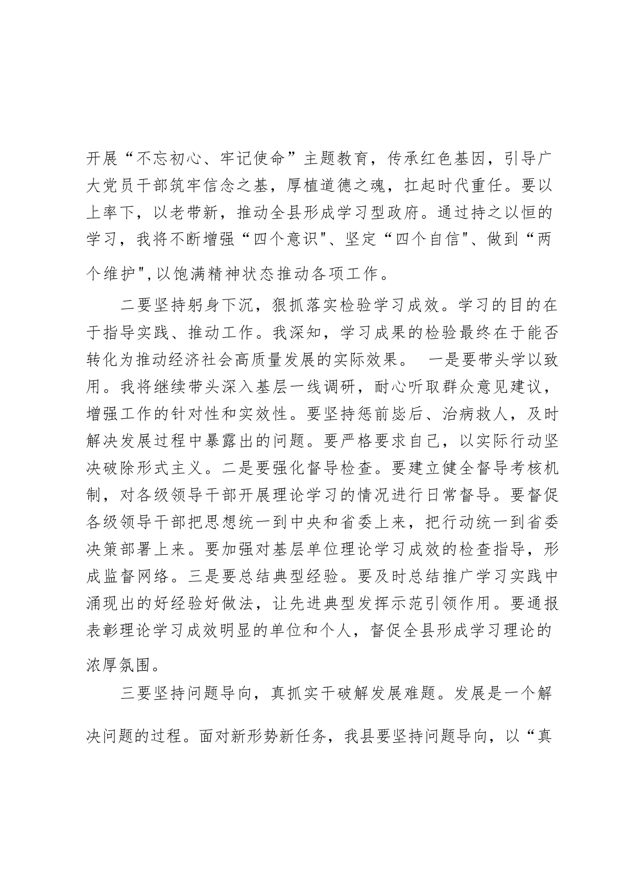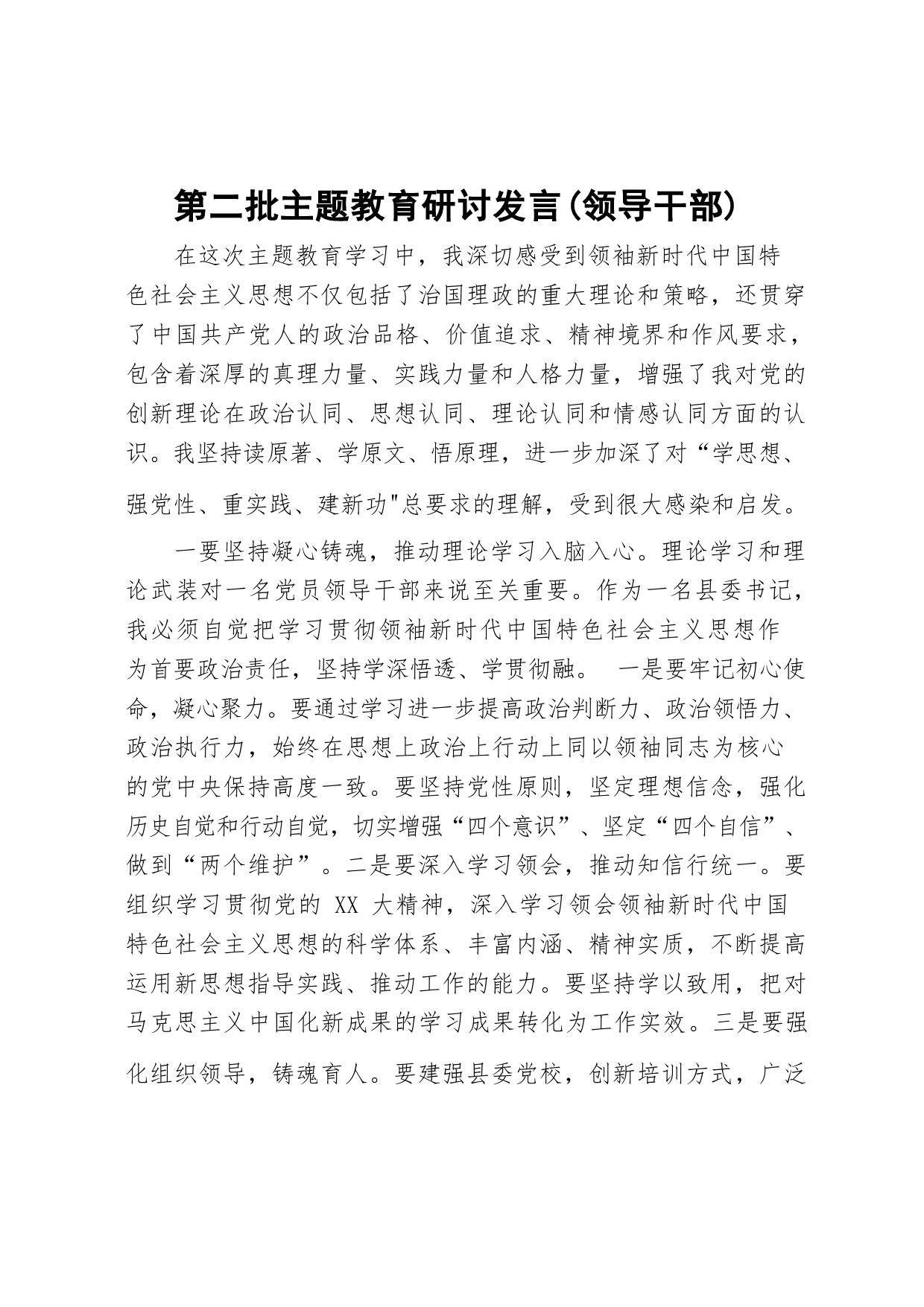 第二批主題教育研討發(fā)言(領(lǐng)導(dǎo)干部)在這次主題教育學(xué)習(xí)中,我深切感受到領(lǐng)袖新時(shí)代中國特色社會(huì)主義思想不僅包括了治國理政的重大理論和策略,還貫穿了中國共產(chǎn)黨人的政治品格、價(jià)值追求、精神境界和作風(fēng)要求,包含著深厚的真理力量、實(shí)踐力量和人格力量,增強(qiáng)了我對(duì)黨的創(chuàng)新理論在政治認(rèn)同、思想認(rèn)同、理論認(rèn)同和情感認(rèn)同方面的認(rèn)識(shí)。我堅(jiān)持讀原著、學(xué)原文、悟原理,進(jìn)一步加深了對(duì)“學(xué)思想、強(qiáng)黨性、重實(shí)踐、建新功"總要求的理解,受到很大感染和啟發(fā)。一要堅(jiān)持凝心鑄魂,推動(dòng)理論學(xué)習(xí)入腦入心。理論學(xué)習(xí)和理論武裝對(duì)一名黨員領(lǐng)導(dǎo)干部來說至關(guān)重要。作為一名縣委書記,...