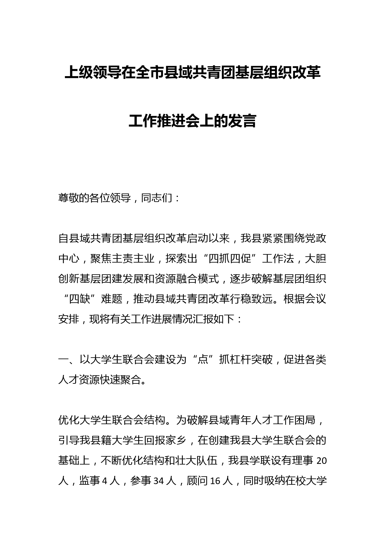 上級(jí)領(lǐng)導(dǎo)在全市縣域共青團(tuán)基層組織改革工作推進(jìn)會(huì)上的發(fā)言VIP免費(fèi)
