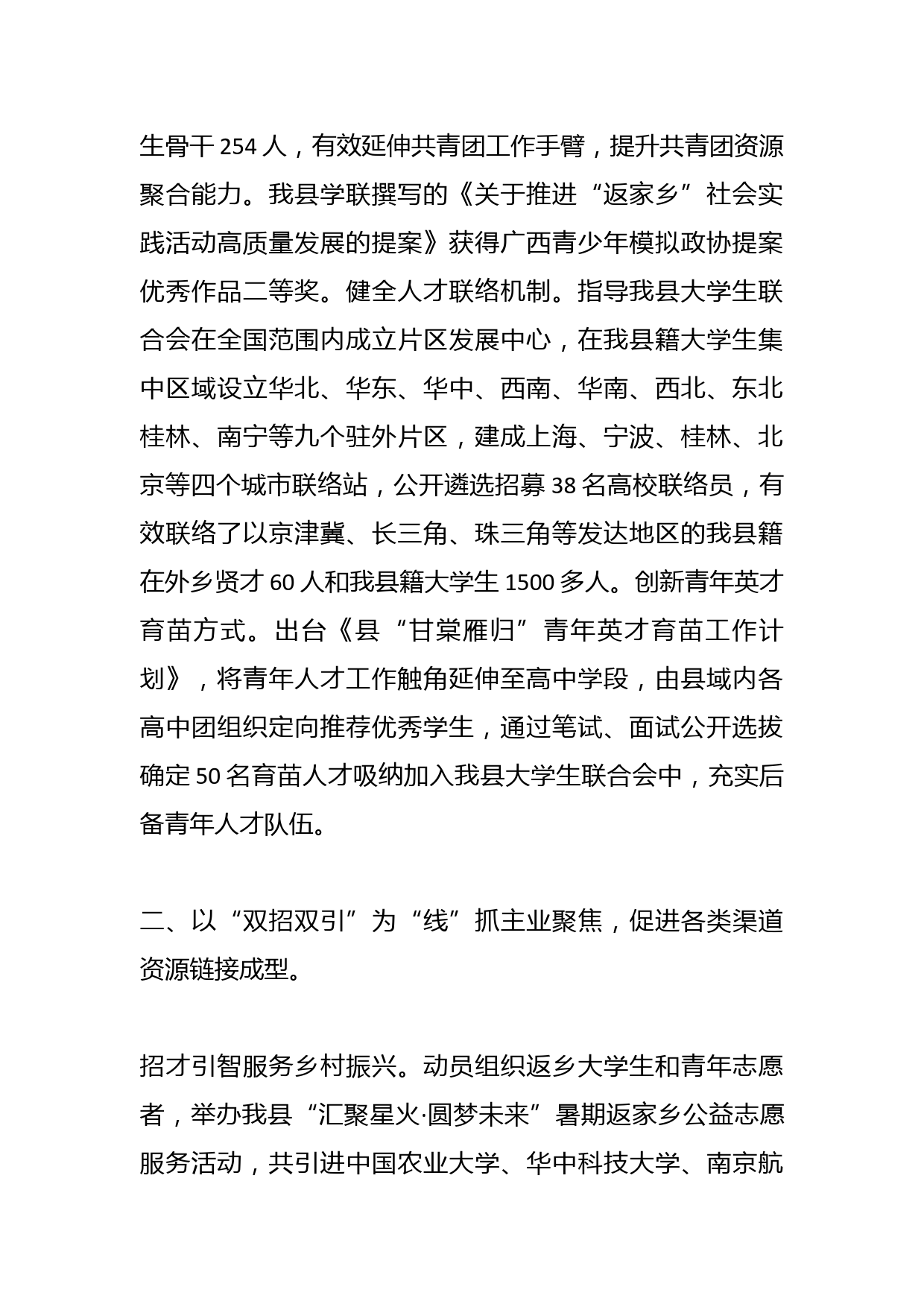 上級(jí)領(lǐng)導(dǎo)在全市縣域共青團(tuán)基層組織改革工作推進(jìn)會(huì)上的發(fā)言尊敬的各位領(lǐng)導(dǎo),同志們:自縣域共青團(tuán)基層組織改革啟動(dòng)以來,我縣緊緊圍繞黨政中心,聚焦主責(zé)主業(yè),探索出“四抓四促”工作法,大膽創(chuàng)新基層團(tuán)建發(fā)展和資源融合模式,逐步破解基層團(tuán)組織“四缺”難題,推動(dòng)縣域共青團(tuán)改革行穩(wěn)致遠(yuǎn)。根據(jù)會(huì)議安排,現(xiàn)將有關(guān)工作進(jìn)展情況匯報(bào)如下:一、以大學(xué)生聯(lián)合會(huì)建設(shè)為“點(diǎn)”抓杠桿突破,促進(jìn)各類人才資源快速聚合。優(yōu)化大學(xué)生聯(lián)合會(huì)結(jié)構(gòu)。為破解縣域青年人才工作困局,引導(dǎo)我縣籍大學(xué)生回報(bào)家鄉(xiāng),在創(chuàng)建我縣大學(xué)生聯(lián)合會(huì)的基礎(chǔ)上,不斷優(yōu)化結(jié)構(gòu)和壯大隊(duì)伍,我縣學(xué)聯(lián)設(shè)有理事...