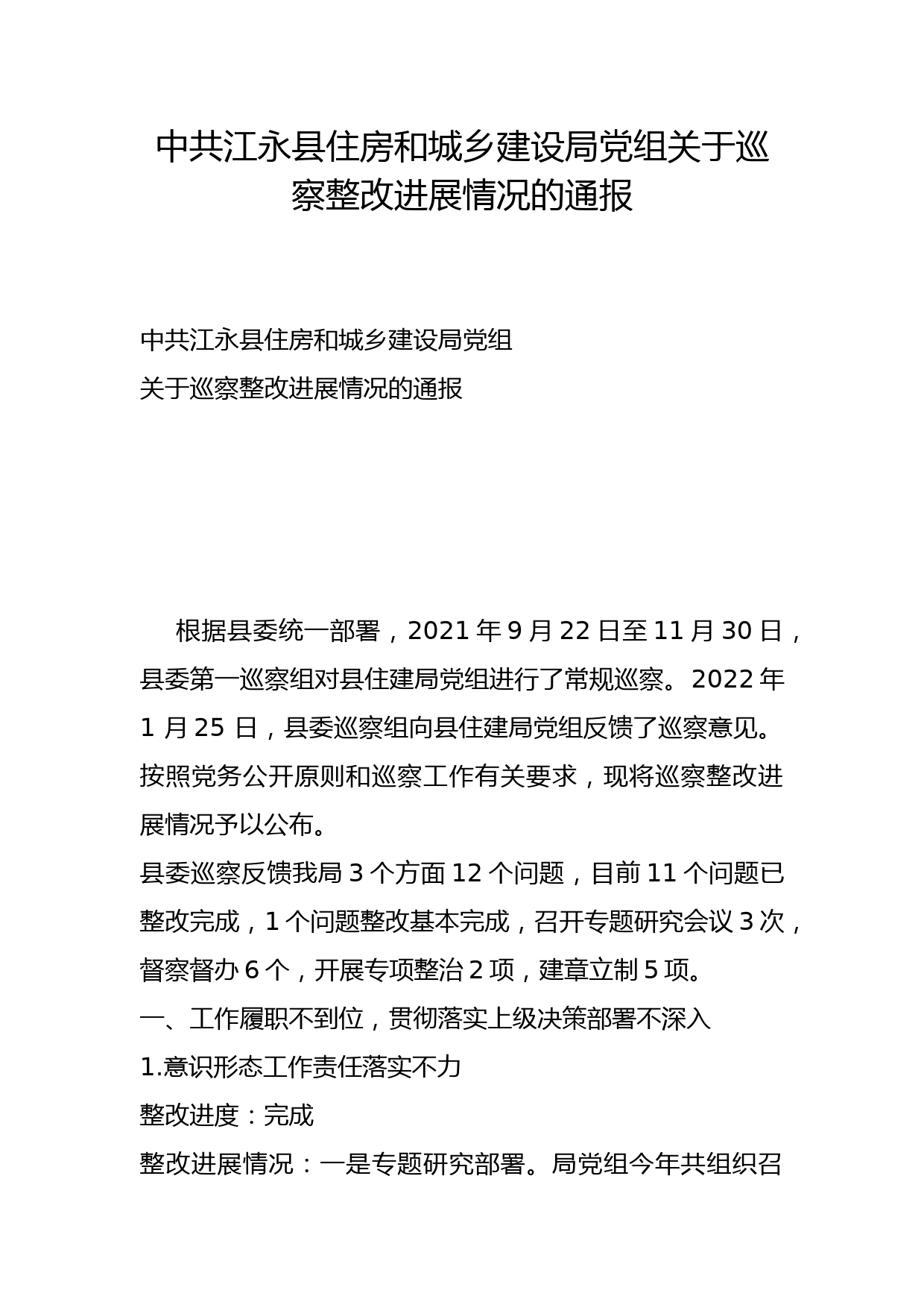 縣住房和城鄉(xiāng)建設(shè)局黨組關(guān)于巡察整改進(jìn)展情況的通報(bào)VIP免費(fèi)